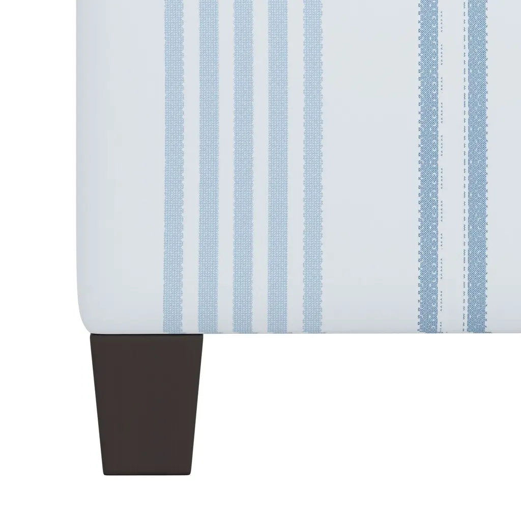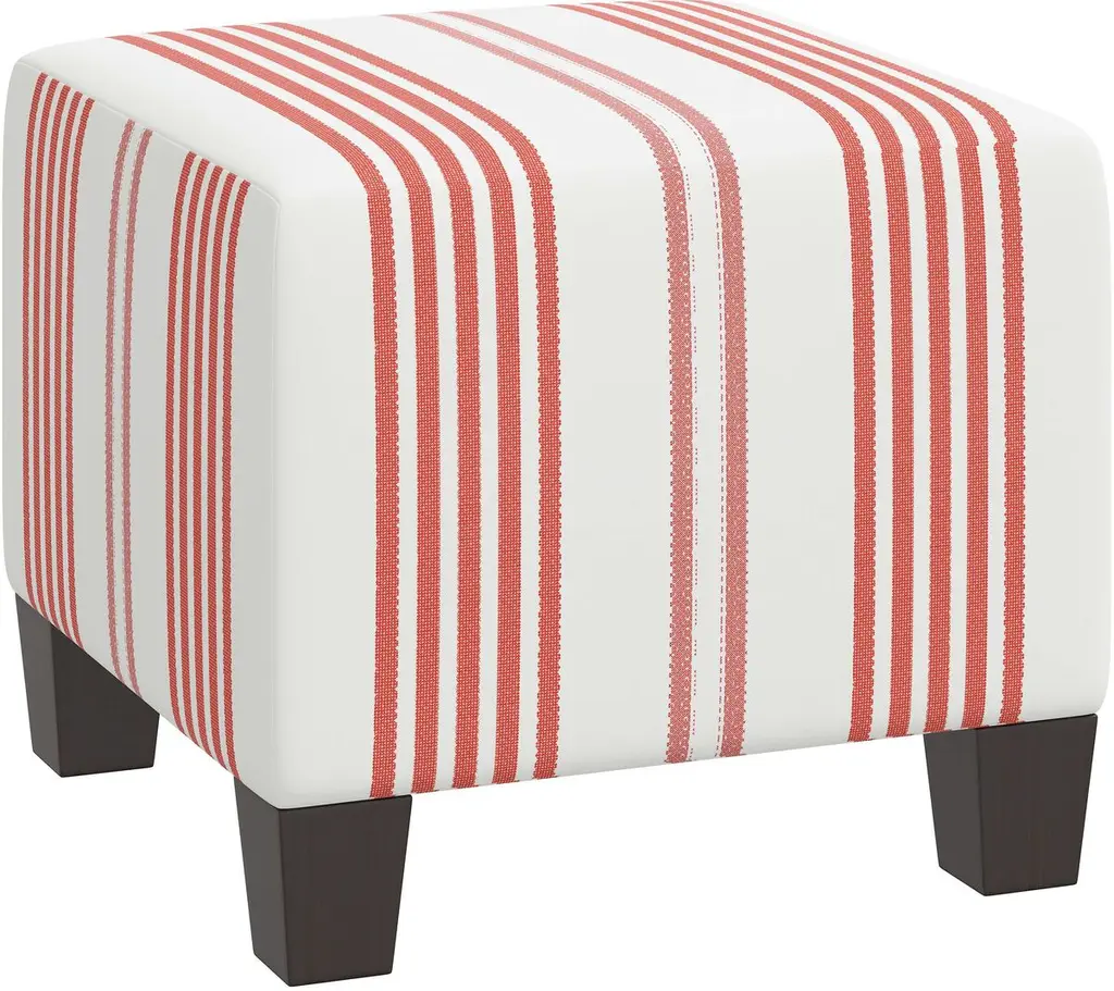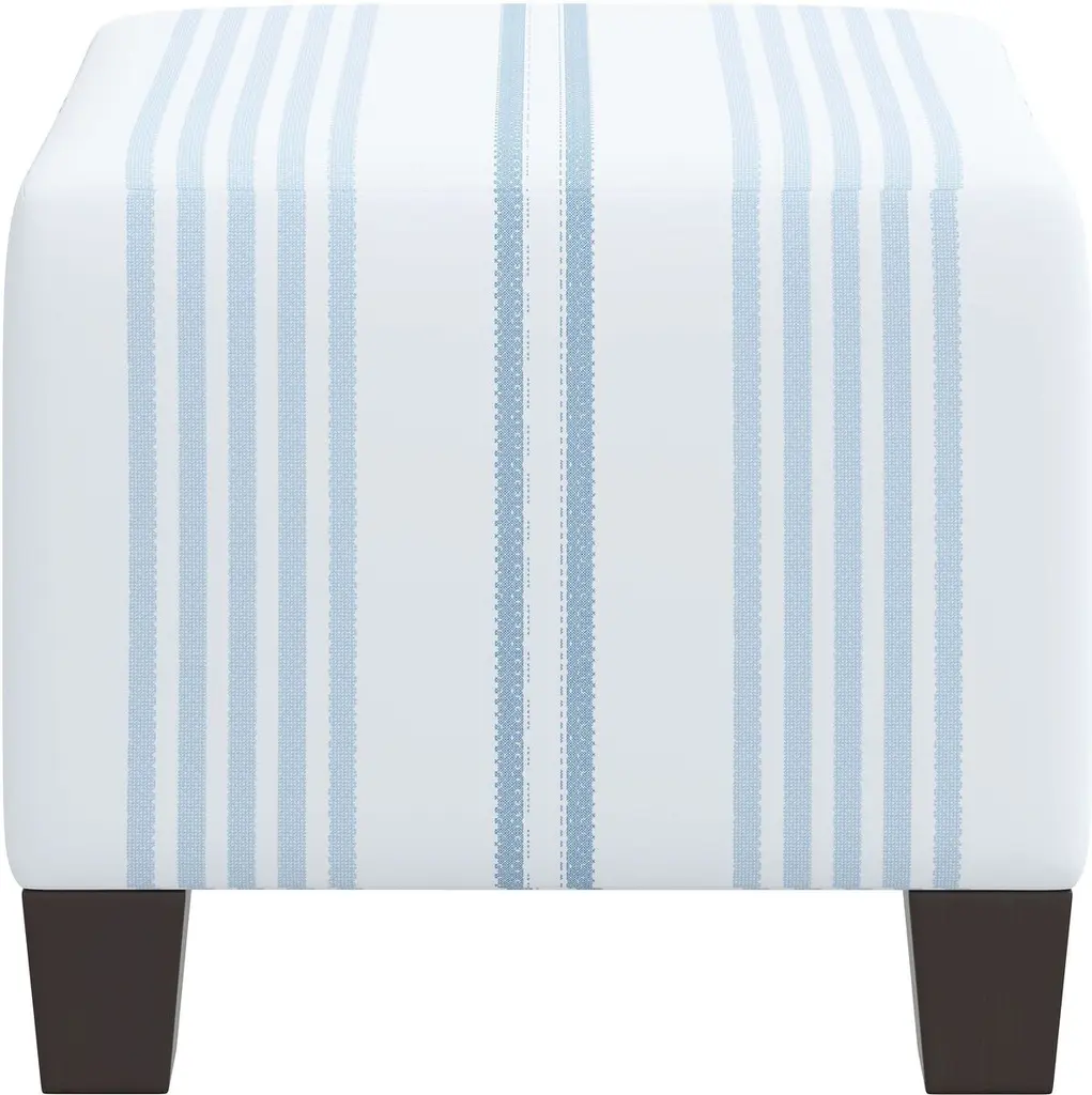 Exclusive to One Kings Lane: Upholstered in printed ticking stripes and made in the USA, this square ottoman can multitask as a footrest, an extra seat, or when topped with a tray, an occasional table.