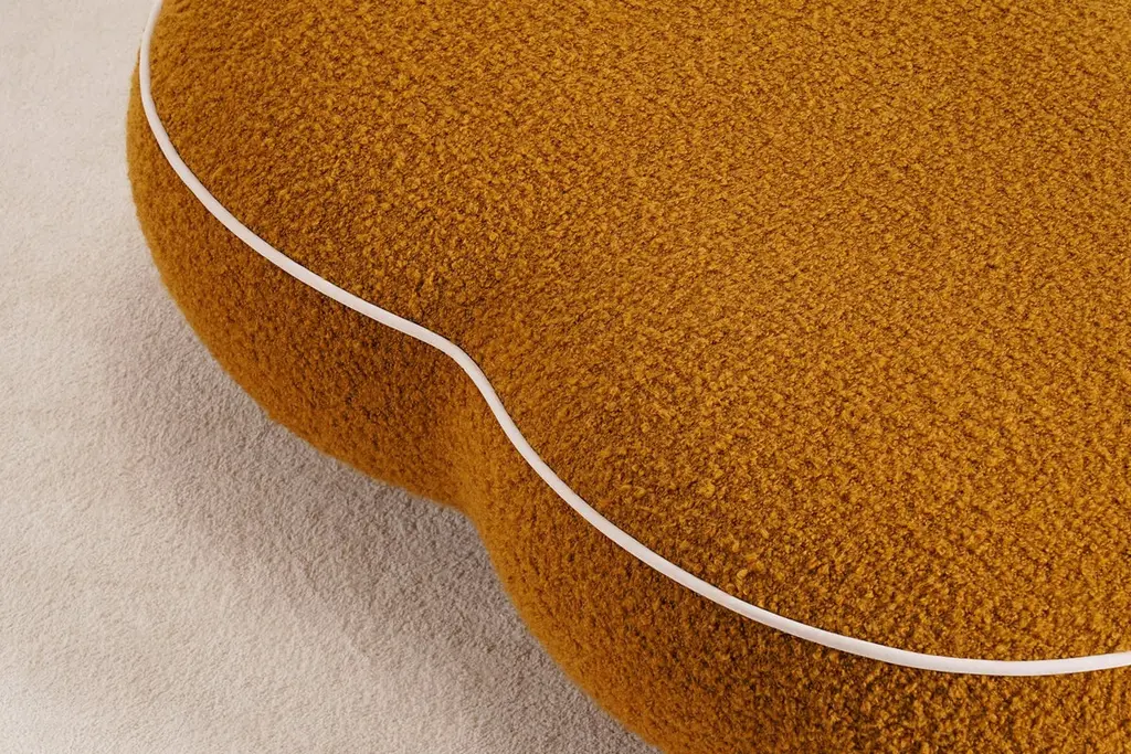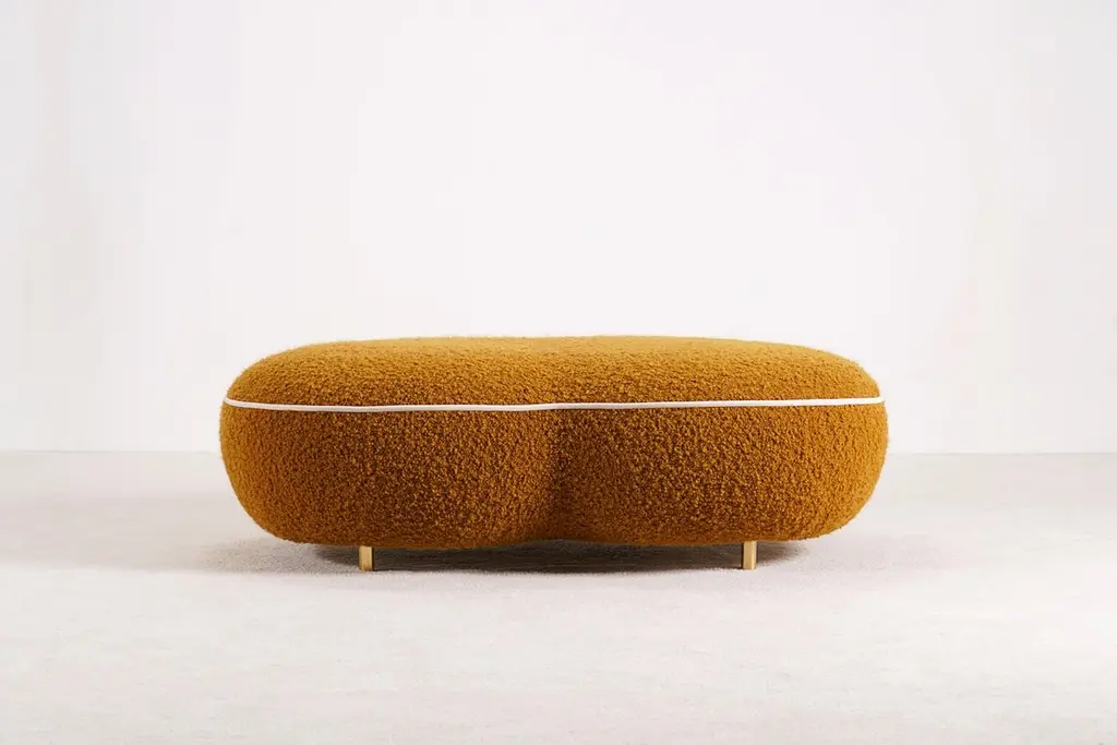 Billy Ottoman by Proisy Studio. Billy is an elegant and refined curved Ottoman or Pouf designed by Proisy Studio. This piece is a part of a collection named "Modern Cowboy" that includes a whole set of armchairs, lounge chairs, stools, benches and sofas. Each piece is thought, designed and fully hand-crafted in France using high-quality materials and in a wide range of fabrics. Materials:Upholstery on solid beech wood frame.Polished & varnished Brass feet.Wool Bouclé fabric from the French House Nobilis.Dimensions :Width: 53,15 in (135 cm)Height: 16.53 in (42 cm)Seat Height : 16.53 in (42 cm)Depth : 39,37 in (100 cm)Weight : 52 lbs (23,5 KG)Additional photos and videos available on demand.Worldwide Express deliveries by air freight are available on all our items.