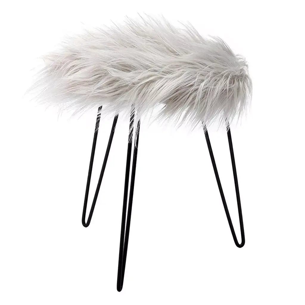 Birdrock Home Round Faux Fur Foot Stool Ottoman - Grey With Black Legs