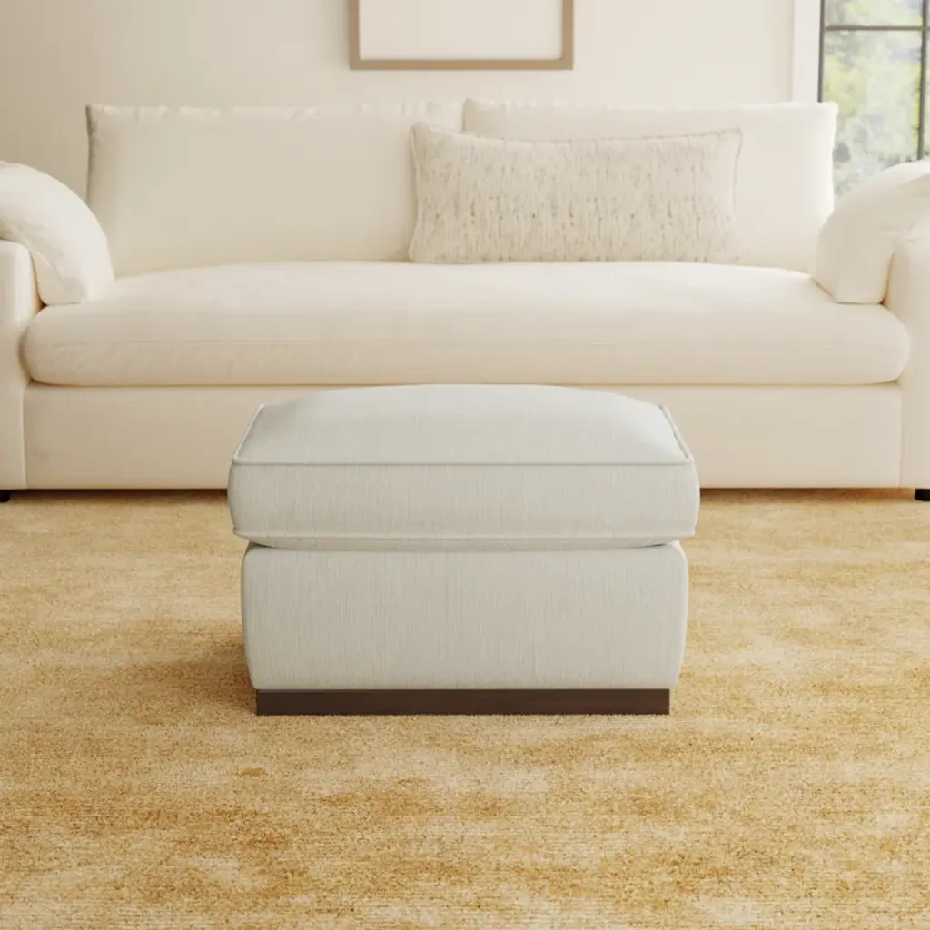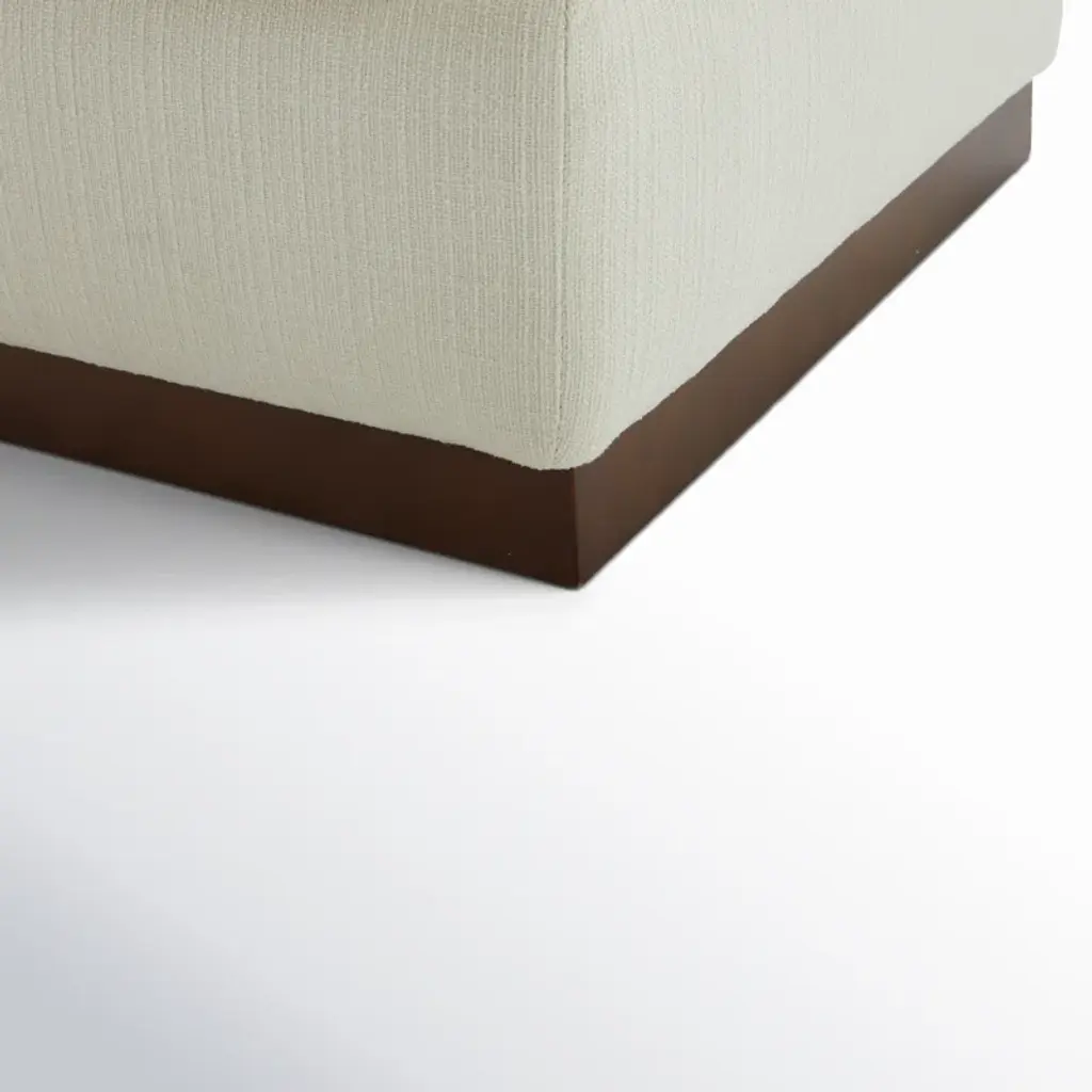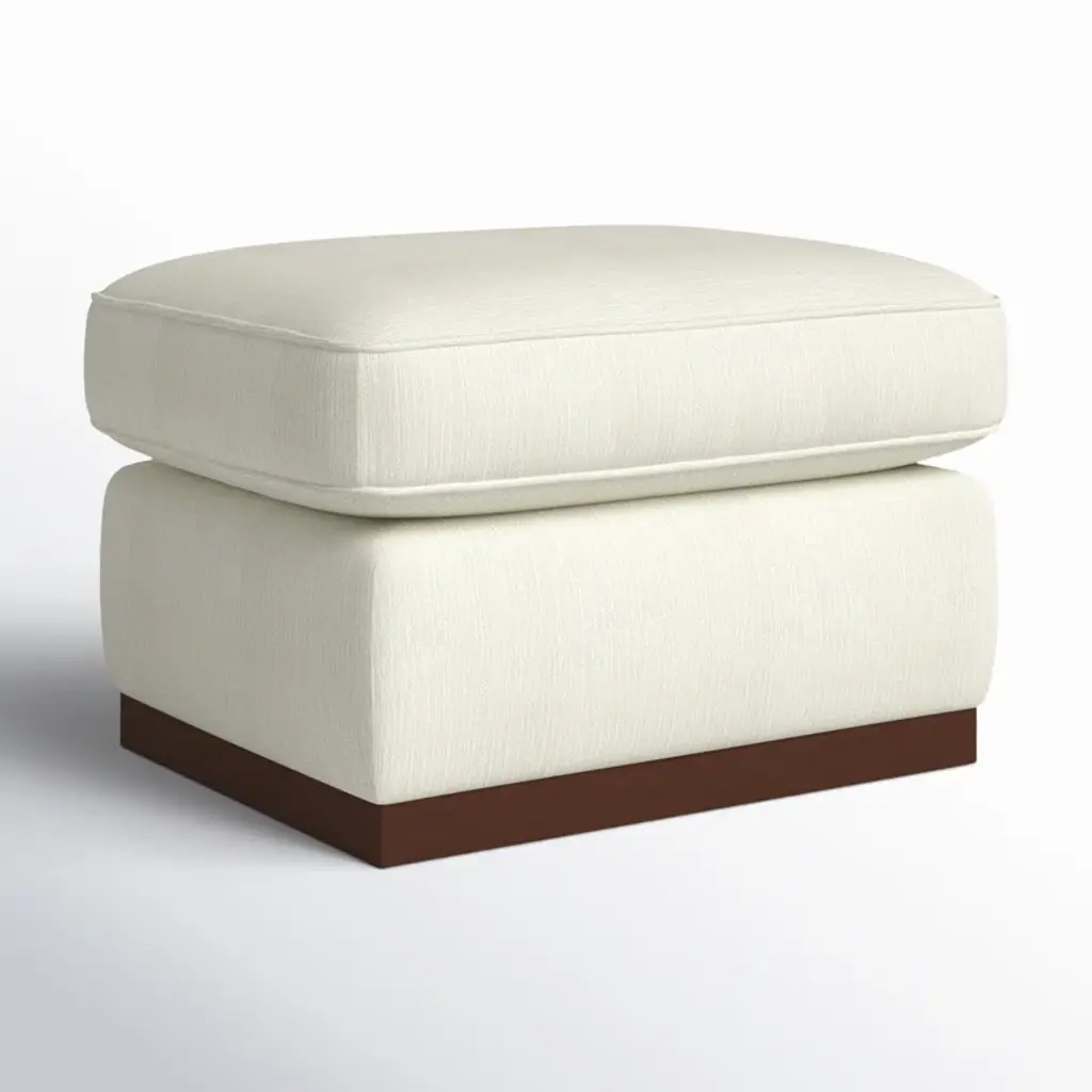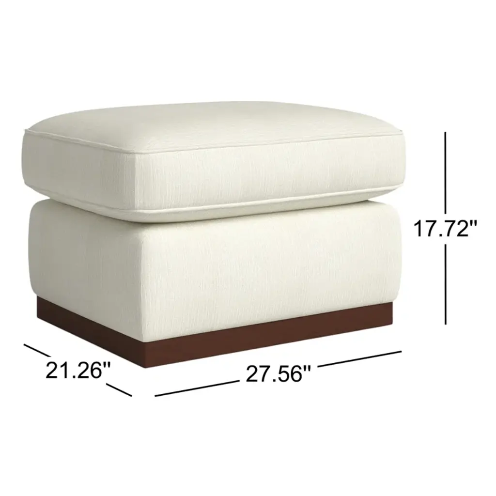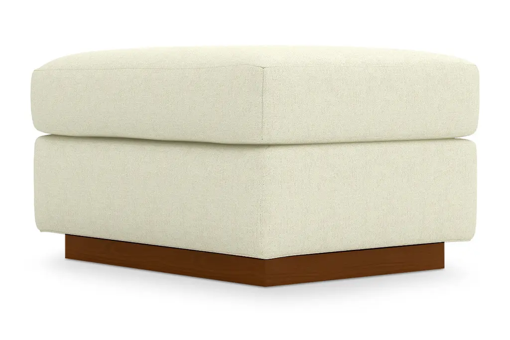 Go ahead, put up your feet. Our upholstered ottoman instantly updates your space with its cozy, foam-filled cushions and streamlined plinth base. This piece is available in your choice of color and fabric for effortless mixing and matching with your room's style, and it contrasts nicely with the walnut finish of the wooden frame. This ottoman is a great extra seat or surface for a stack of coffee table books or folded blankets.