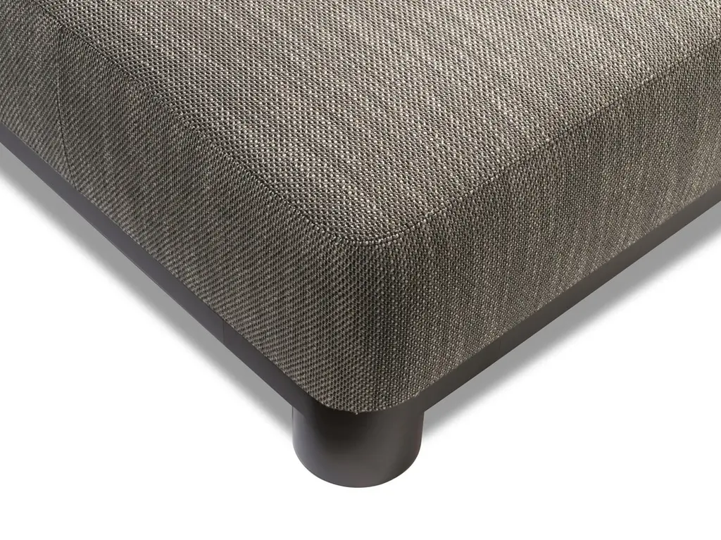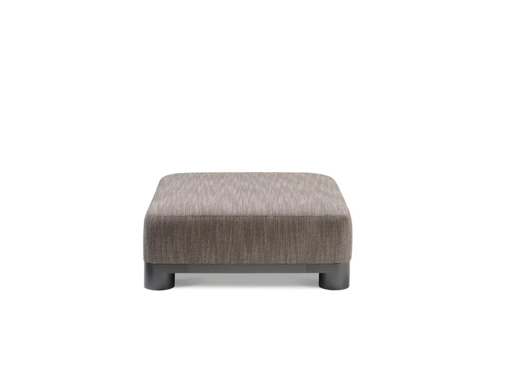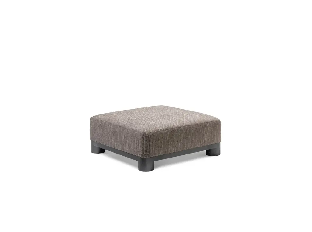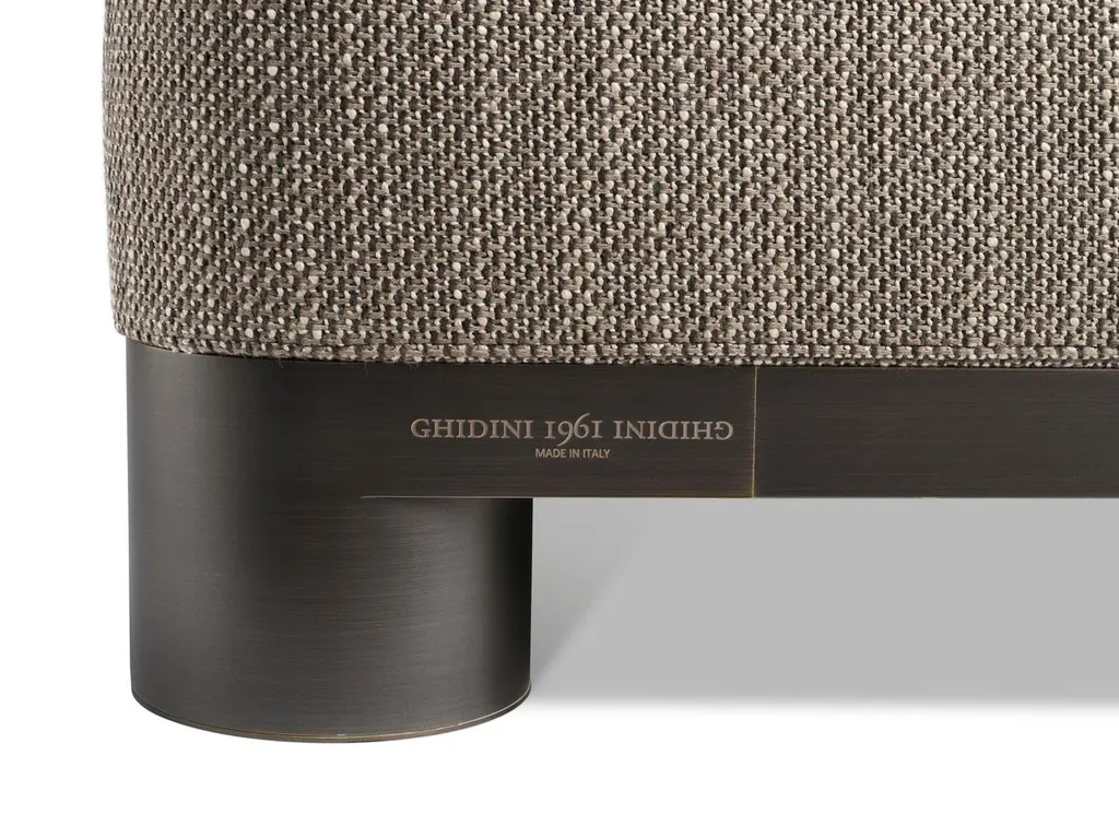 This family of products makes a bold statement with its generous cylindrical foot, connecting its structural perimeter while delimiting the objects that compose it. The distinctive metal rim that supports the seats, the tables, the cabinets, graphically encompasses the material with which they are made. This is beautifully portrayed in the tables, where the marble tabletop matches with the legs in turned marble, or with the armchairs featuring leather seats and legs of the same color. With the massive dimensions and the softness of the fittings, the materials are enhanced in their characteristics creating a sculptural effect and giving a distinct personality to each element of the collection.Structure: Die casted aluminum on the angular elements and extruded aluminum for the supporting structure on the perimeter. Internal structure in wood with metal supporting frame. Cushions: Back cushions in high grammage wadding with internal rubber insert. Seat cushions in polyurethane rubber of different densities. Covers: Back covers are completely removable for both fabric and leather versions. Base: The sofa, armchair and ottoman are based on the Bold family of castings. The Bold castings are made of Italian aluminum, die casted inhouse at Ghidini1961. Polished manually, and lacquered with a transparent finish to guarantee a long lasting durability.Additional Information:Materials: Brass, fabric Upholstery: Taupe FabricLegs Finish: Black goldDimensions: W 100 x D 100 x H 40 cmAvailable in other upholstery options: Nabuk leather, nappa leather, natural leather, velvetAvailable in other finish option: Brown burnished brass, polished brass, satin brass, light burnished brass, dark burnished brass