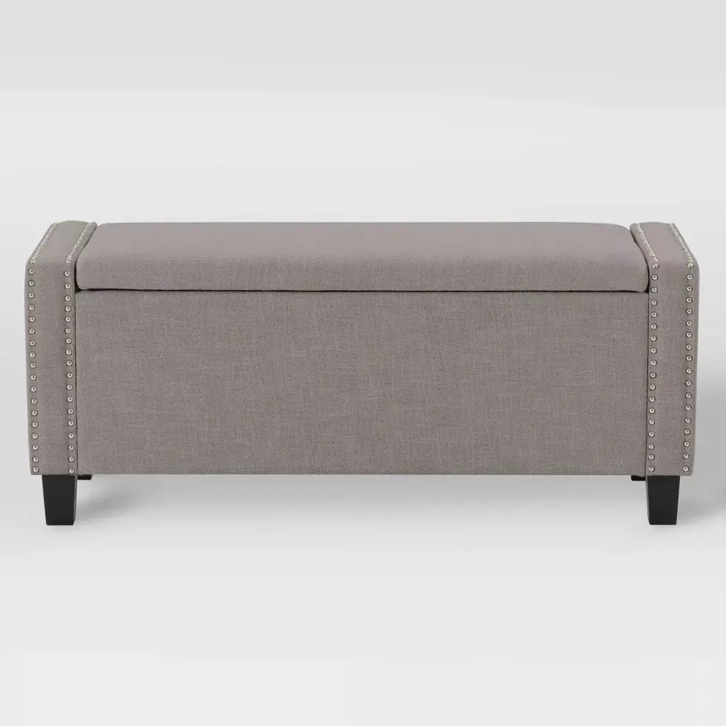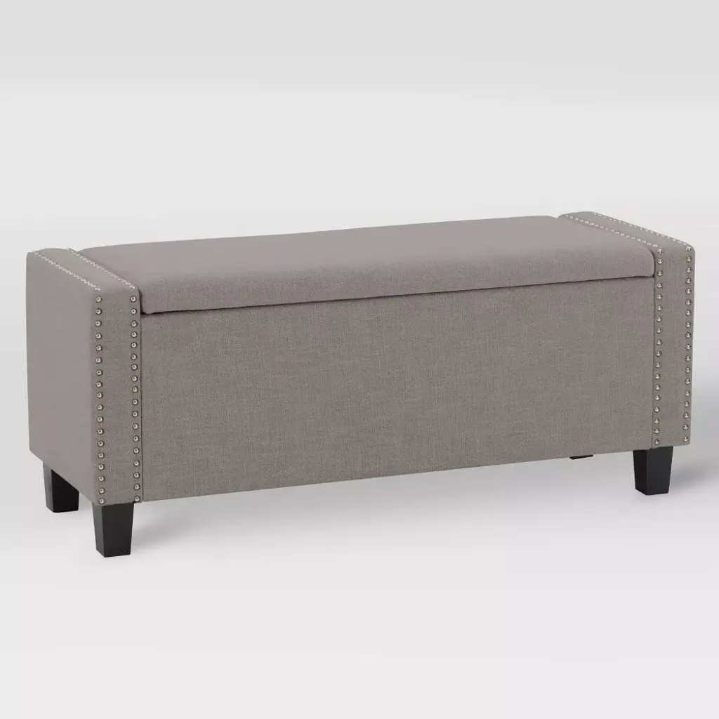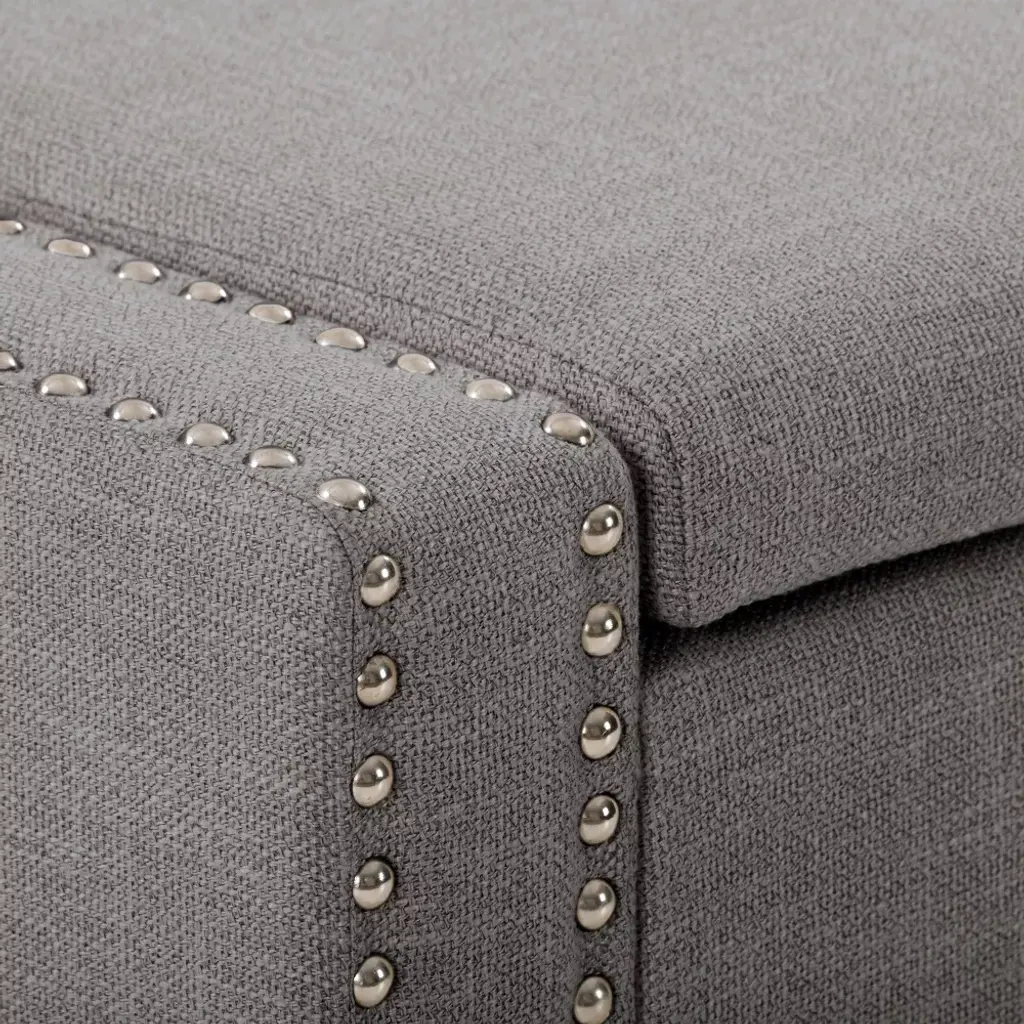 This storage ottoman is a versatile addition to any home. It offers multiple storage space options such as linens in bedrooms or board games and blankets in living rooms, the choices are endless. Wrapped in a soft polyester that's durability stands up to stains and wear and tear. Supported by dark brown legs and a nailhead trim it is as stylish as it is practical. The ottoman's classic design makes it easy to assemble and disassemble for storage or to move to the room of your choice.
