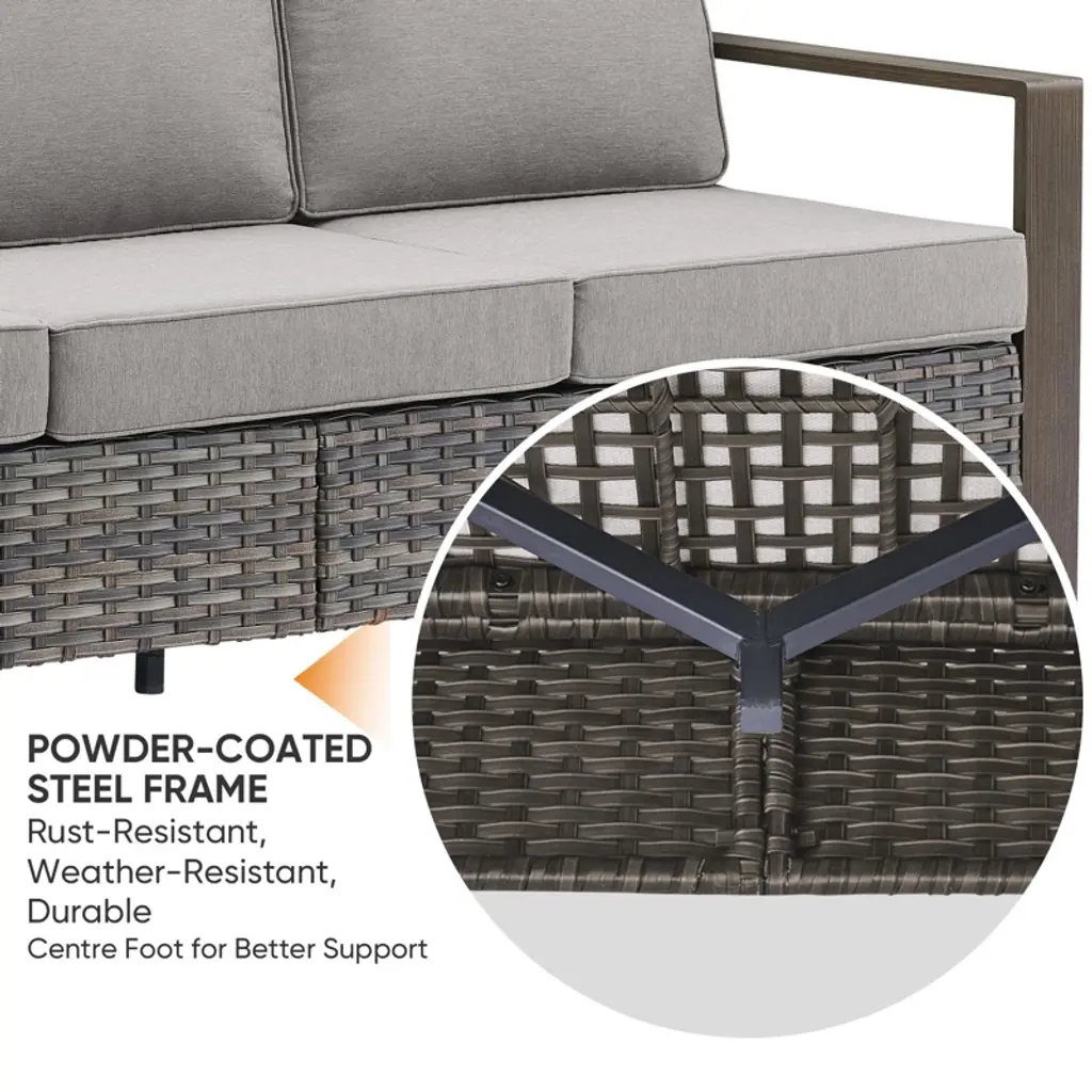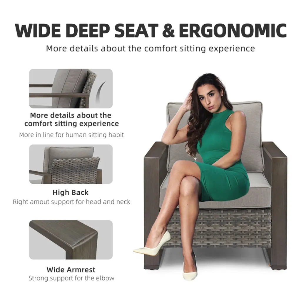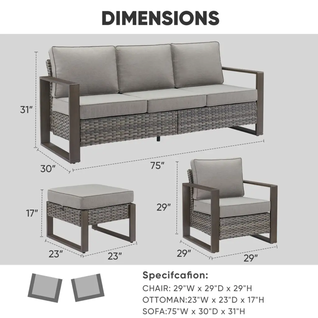 Upgrade your outdoor space with the Buenhomino 5PC Patio Conversation Set! Featuring UV-resistant PE wicker, 4" thick cushions, and versatile ottomans,wood-grain metal arms for rustic charm this all-weather furniture set offers luxurious comfort for your deck, garden, or balcony. Easy to clean, durable, and stylish perfect for relaxing or entertaining!