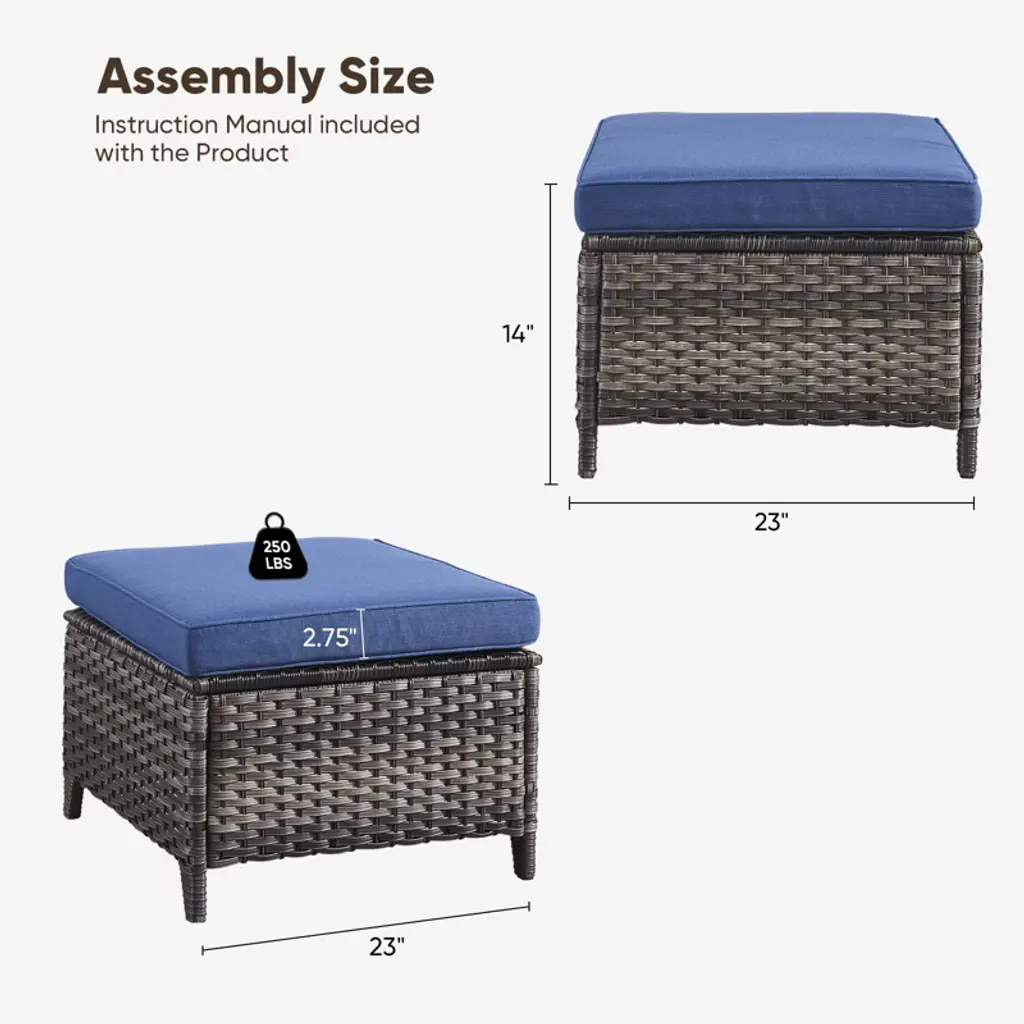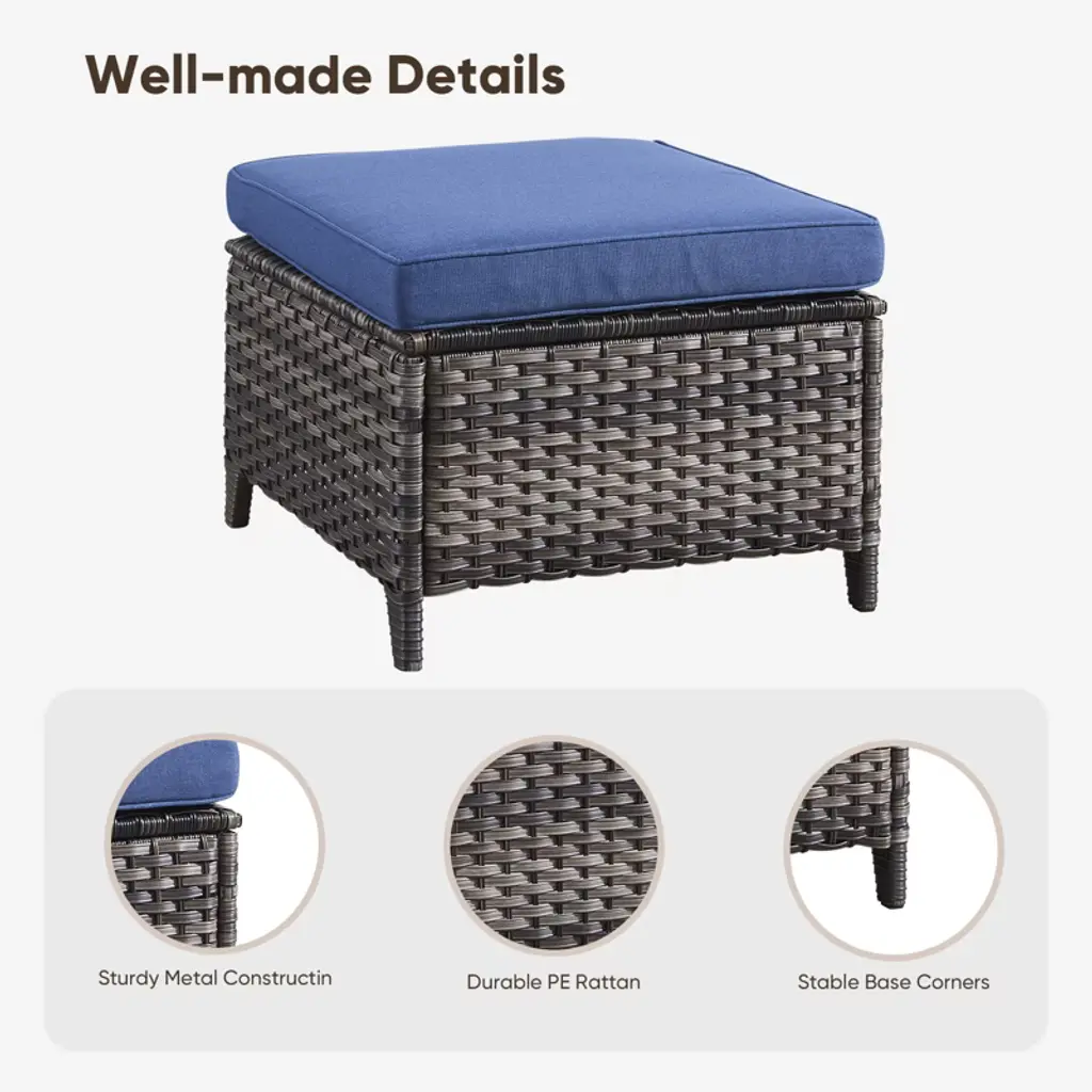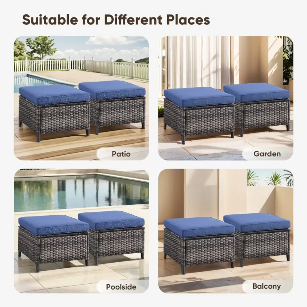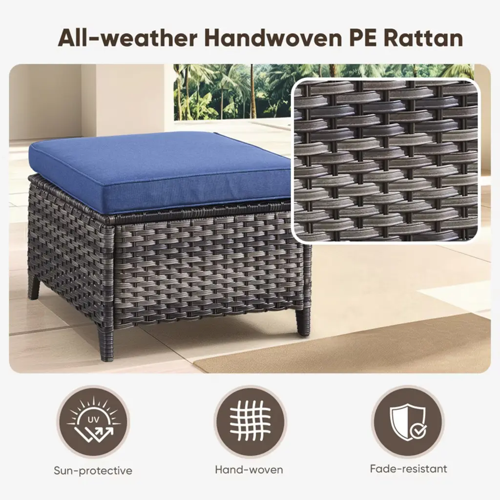 Upgrade your outdoor living with the Buenhomino Patio Ottoman Set! This versatile set of 2 combines durable, all-weather PE rattan construction with incredibly comfortable, fade-resistant Olefin cushions. Perfect as footrests, extra seating, or side tables for your patio, poolside, or garden. Durable, stylish, and designed for ultimate relaxation.
