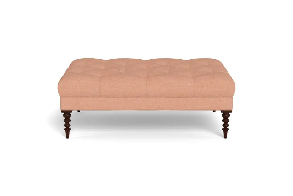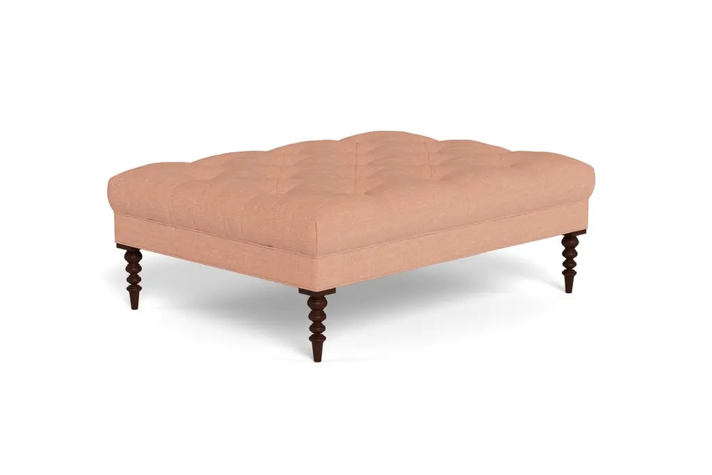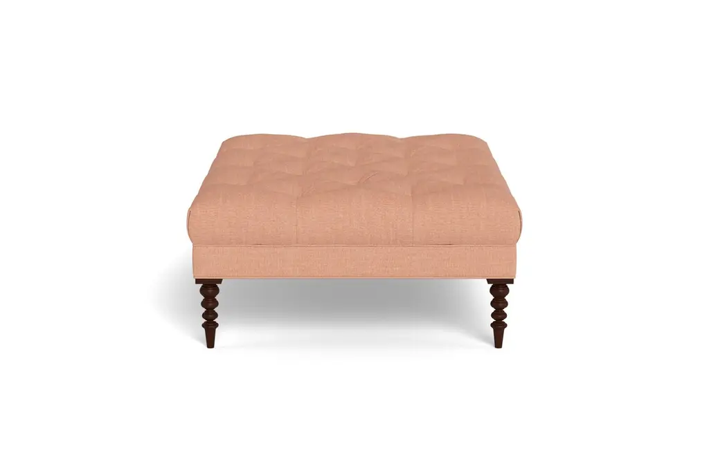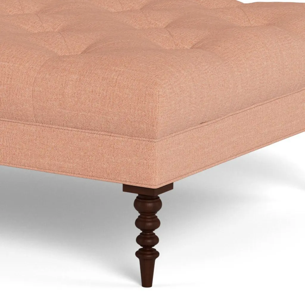 A large cocktail ottoman, with beautiful tufting set atop a trim upholstered box, with wonderfully turned legs. Made to order in adobe performance woven, a fabric able to be cleaned and used in high traffic areas. Legs finished in mahogany. Returns are not accepted on made to order items.