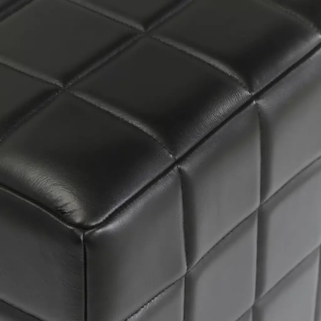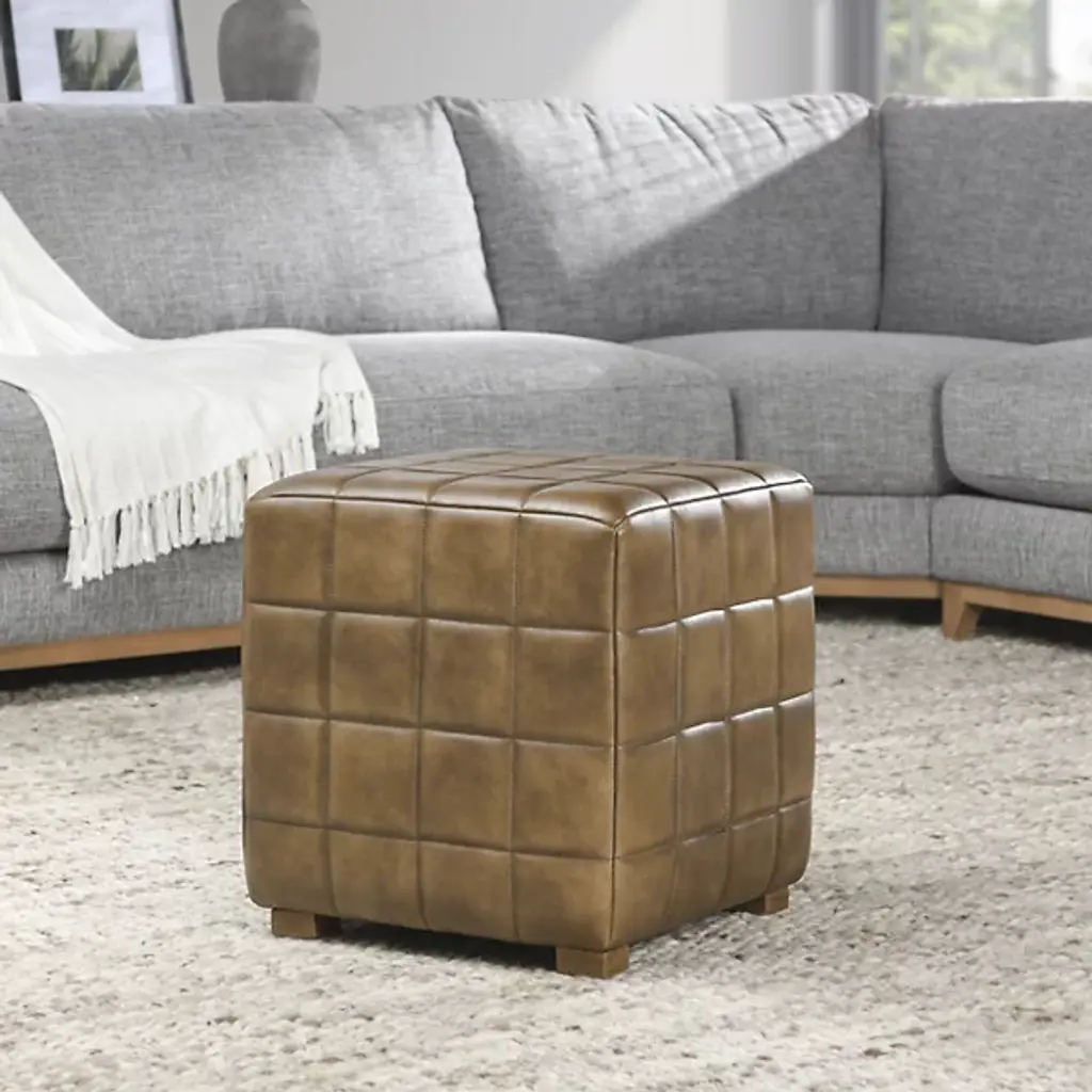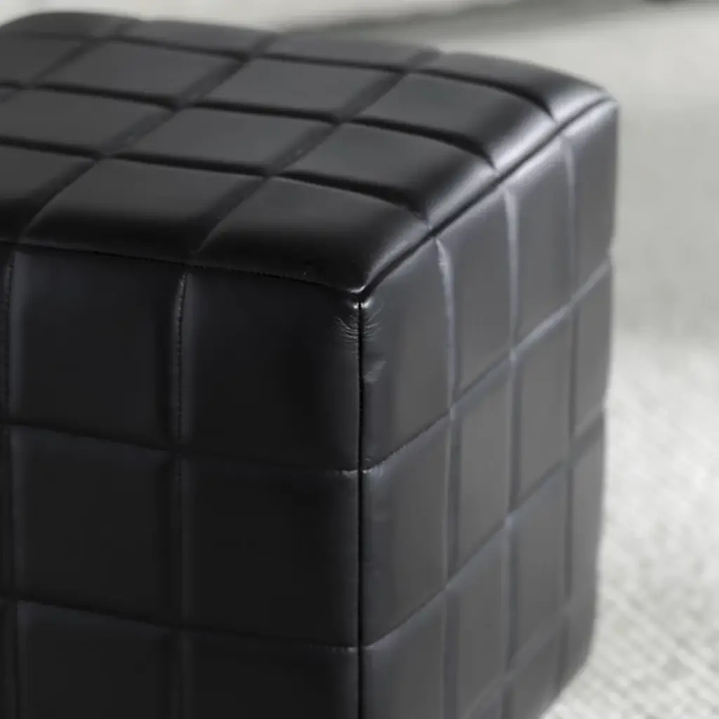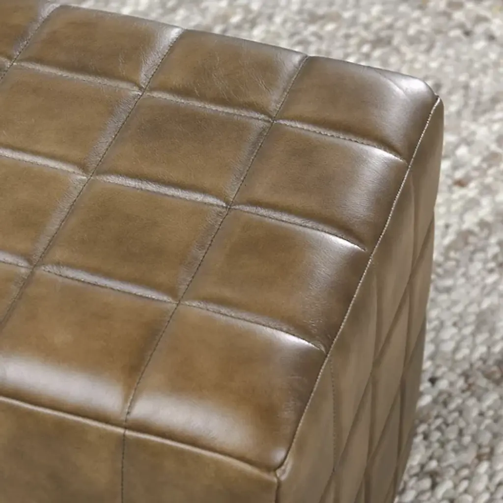The Carlo Ottoman from Classic Home features buffalo leather pieced into a distinctive grid pattern that wraps around all sides. Its cubic form and substantial weight capacity make it equally suitable as a footrest or impromptu seat. The mango wood frame provides lasting stability while maintaining a lighter profile. Dense foam padding balances cushioned comfort with a maintained shape. This ottoman adapts to various uses - from extra seating to a makeshift side table - while the handcrafted leather detailing adds authenticity to living spaces.
