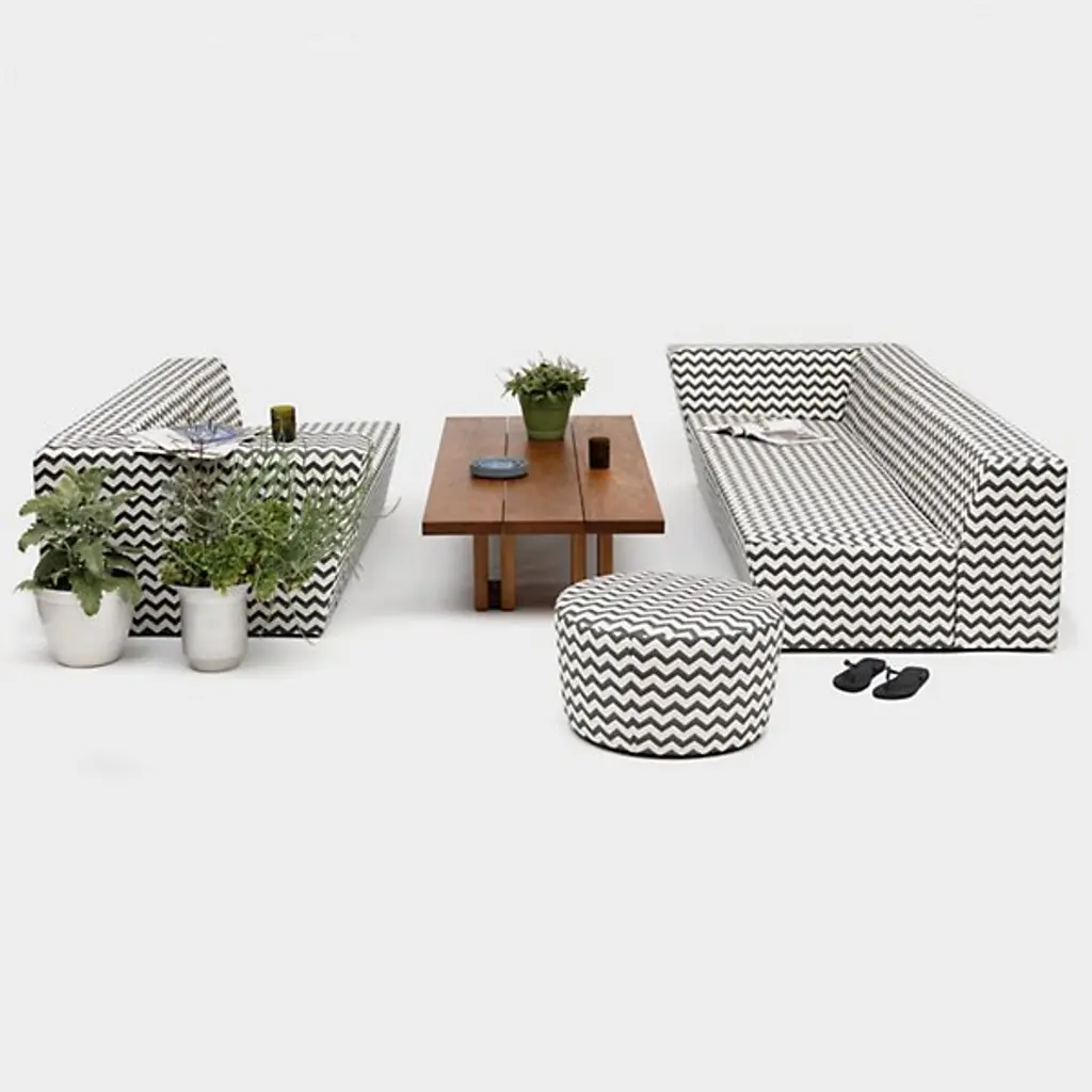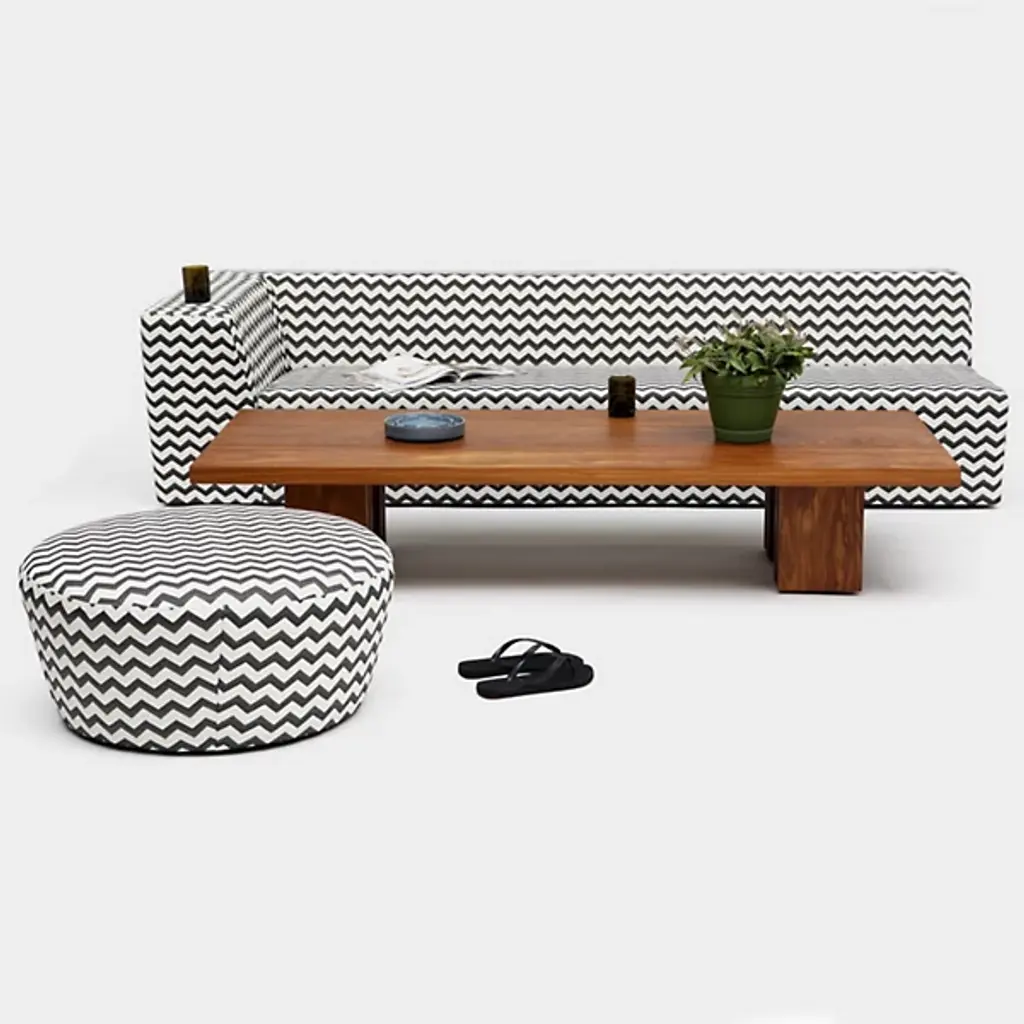 The Caroline Outdoor Ottoman was conceived as an archipelago of low, deep, cushioned volumes. These simple forms were designed with the utmost comfort in mind while the fabric pattern provides a burst of contrast to any environment. The ottoman is available in various sizes that can accompany one to multiple people. This piece features a dry foam cushion partnered with an outdoor fabric over a hardwood frame. The ottoman is the perfect companion to the Zig Zag Sofa.