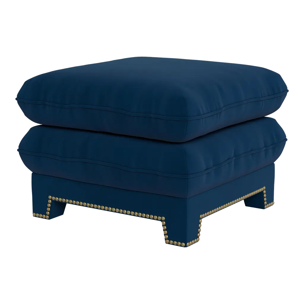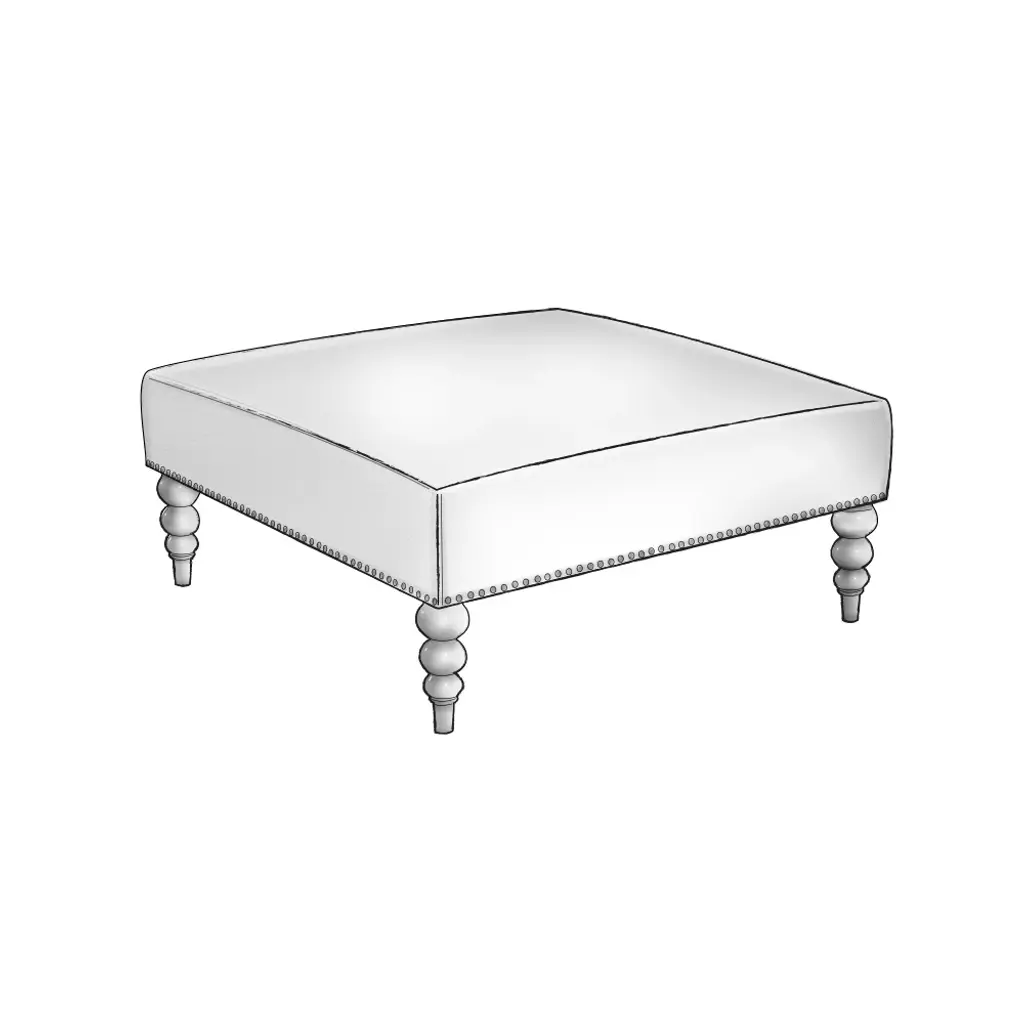 Dimensions: 46W x 46D x 19H COM: 3.5 yards Chic and casual. An ottoman is so versatile; country or city, living room or family room. It instantly softens the look of a room. Put your feet up on it, or style it like any other coffee table. Need something bigger or smaller? No worries, this can be customized to fit your space! Brass nailheads complete the fine look. ** Please Note, if using COM, production will not start until we receive your COM FORM Made in America