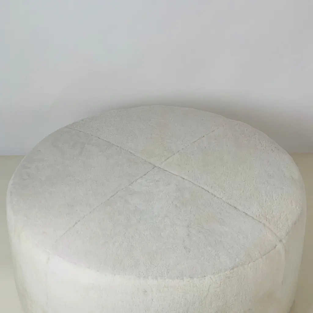Chic Banquise™ ottoman by Design Frères®.Beautiful natural cream shearling round ottoman. Upholstered firm to be used as seating and as a table surface for trays, bags, books, etc.Inspired by the timeless aesthetic of French modern design, this ottoman from our exclusive Design Frères line is handmade in our Los Angeles atelier by our skilled artisans. This Classic piece will blend in, structure and enhance any space.