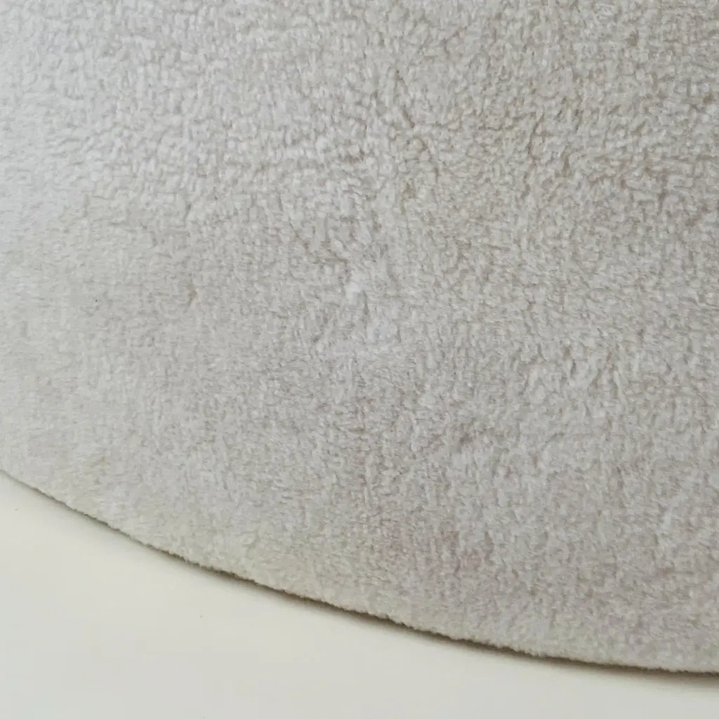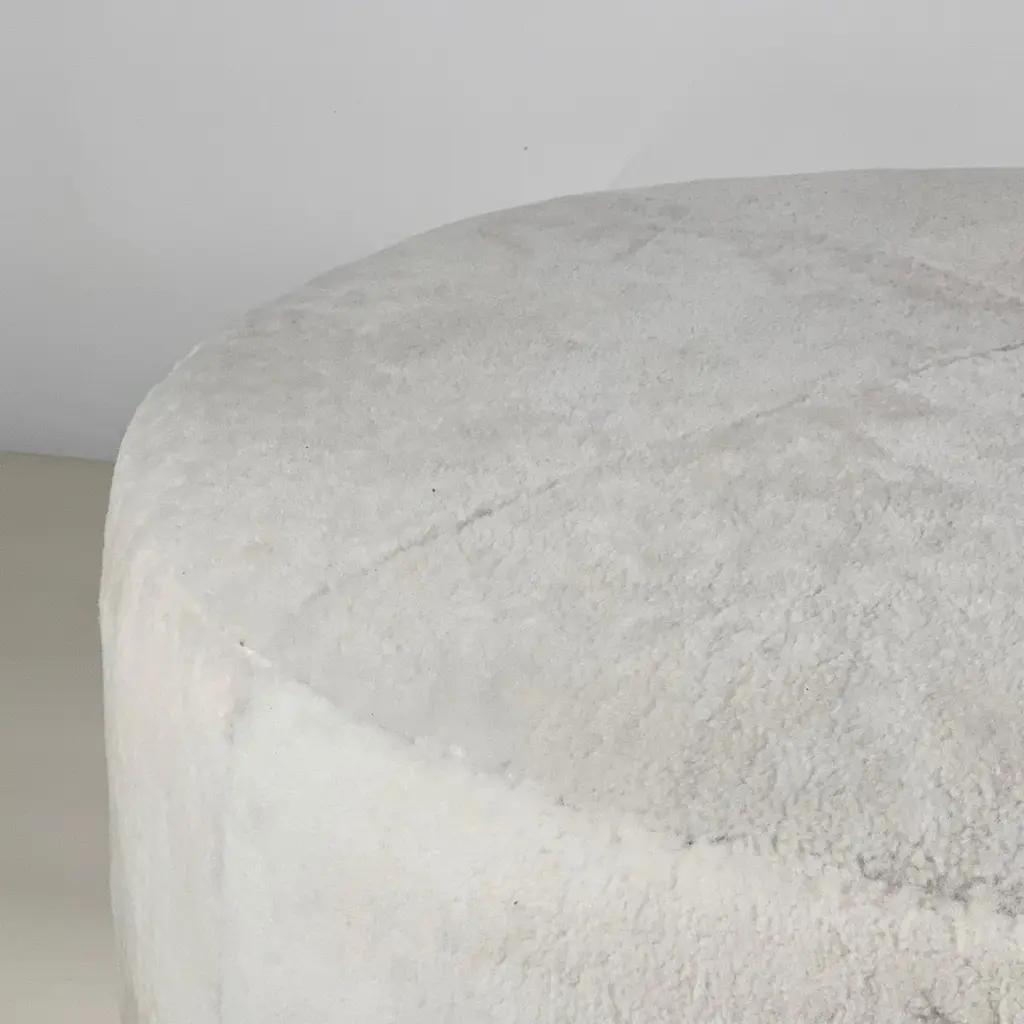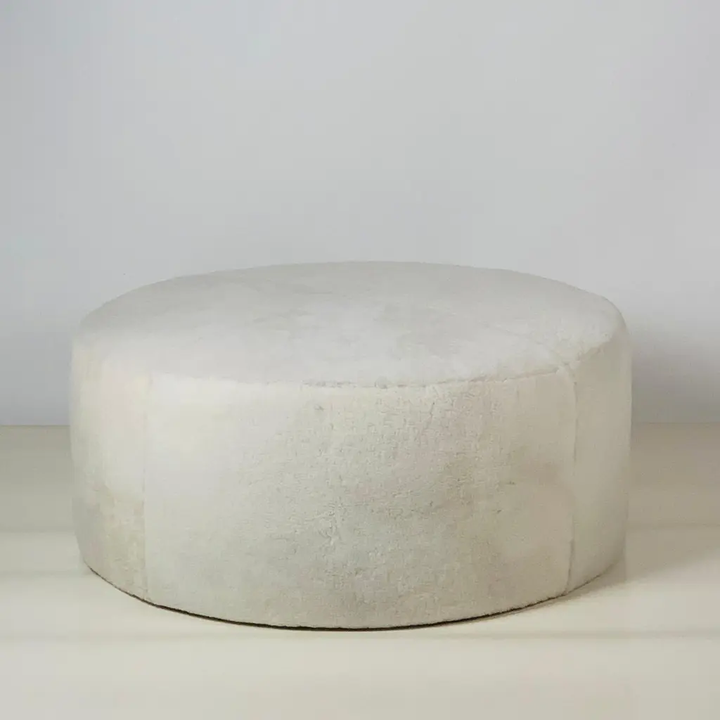 Chic Banquise™ ottoman by Design Frères®.Beautiful natural cream shearling round ottoman. Upholstered firm to be used as seating and as a table surface for trays, bags, books, etc.Inspired by the timeless aesthetic of French modern design, this ottoman from our exclusive Design Frères line is handmade in our Los Angeles atelier by our skilled artisans. This Classic piece will blend in, structure and enhance any space.