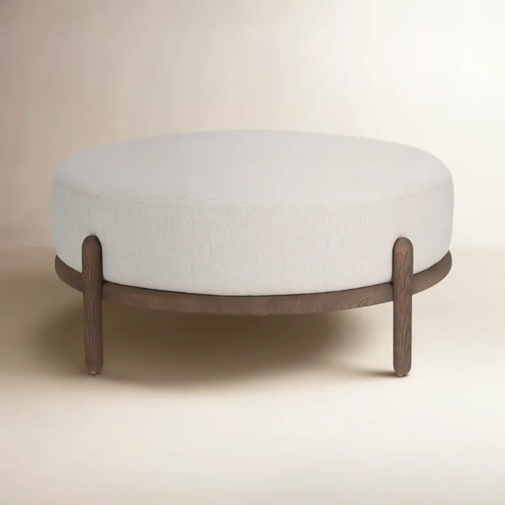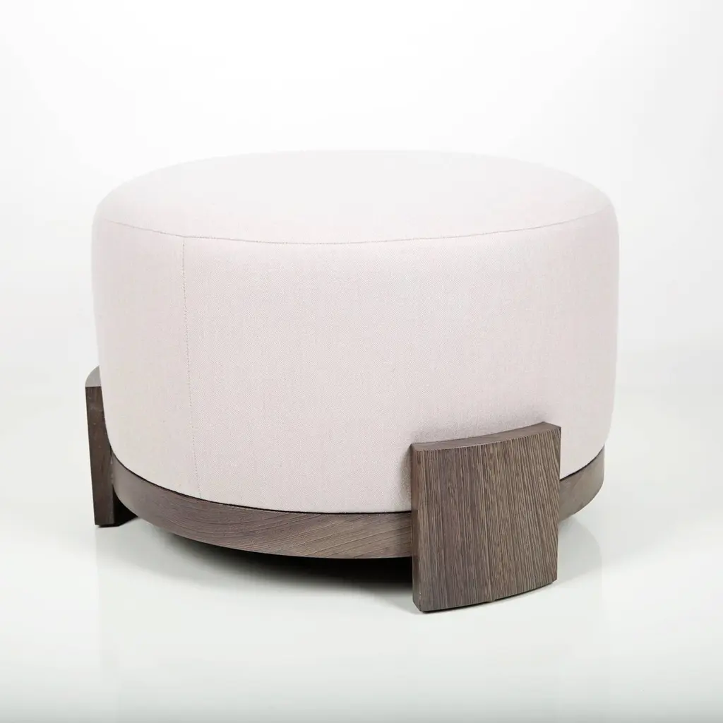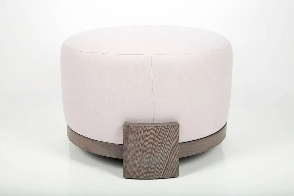 Our adorable coco ottoman is perfect for relaxing with your feet up…or pop them under our Calista console for additional seating. A modern take on a basic round ottoman. Chic, comfortable and stylish, perfect for any room. Pictured here handcrafted with a solid wood base and upholstered in luxurious wool.