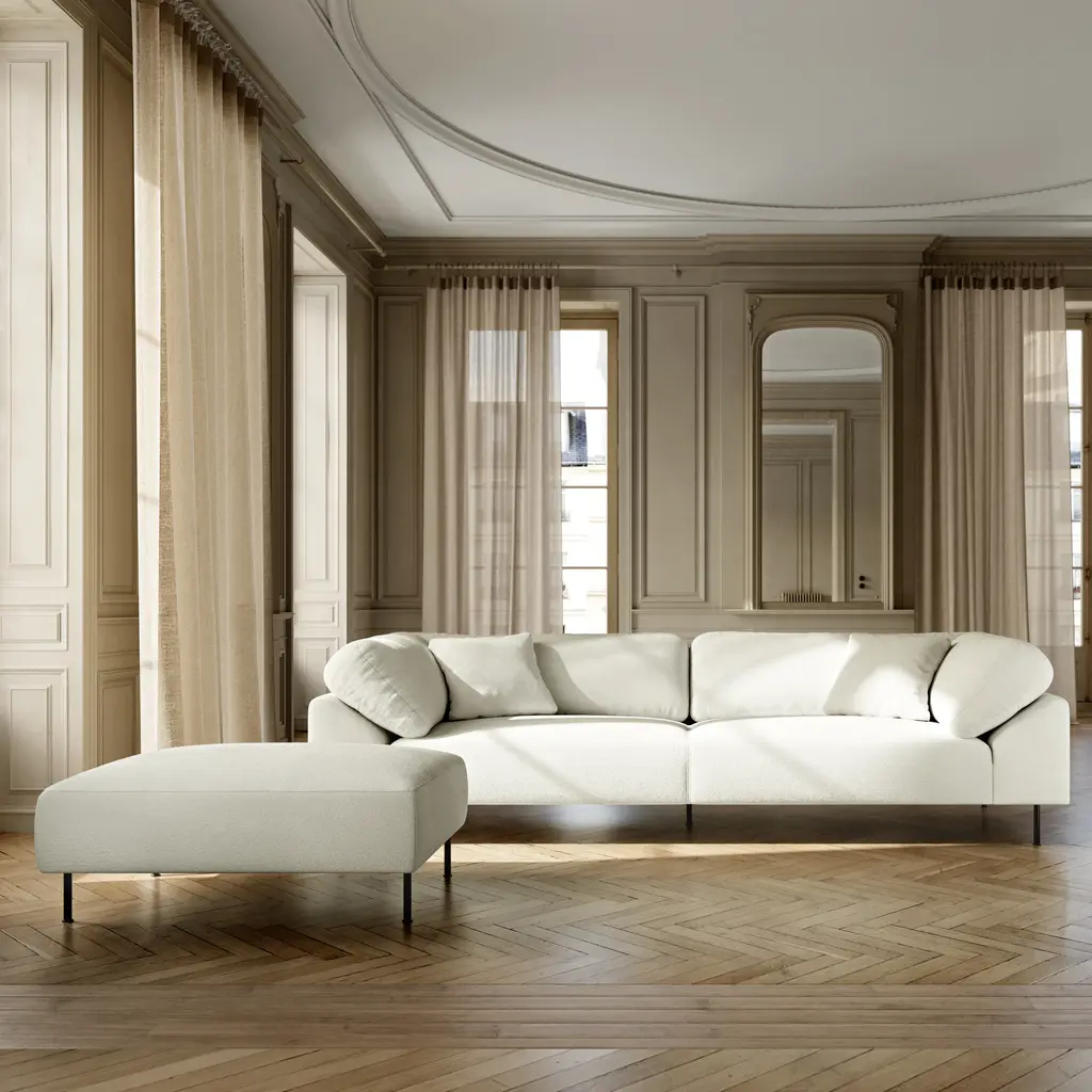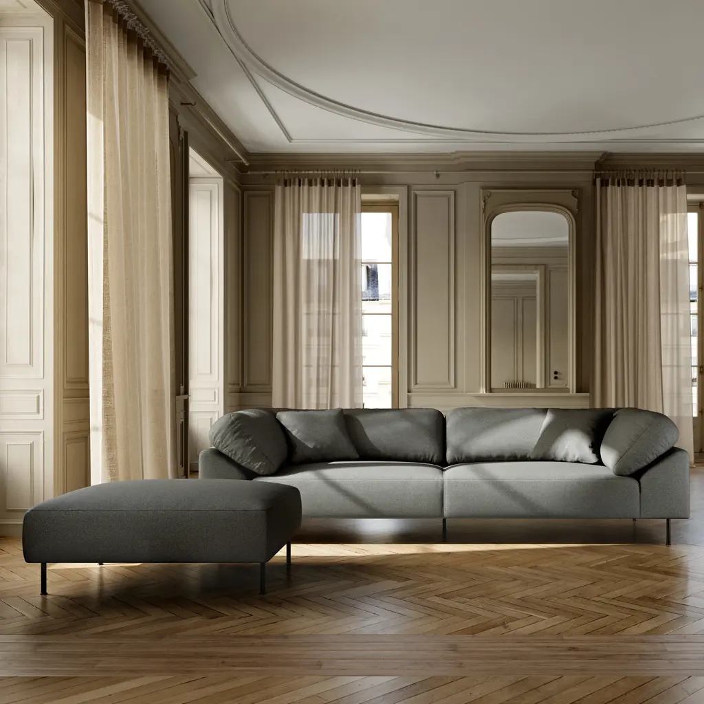 Cologne-based German designer Meike Harde adds a generously proportioned ottoman to complement her Collar range. Deeply cushioned, it matches the voluminous proportions of the collection’s sofas and is available in the same wide choice of fabric selections. With its minimalist metal legs as a counterpoint, it melds expansive comfort with a contemporary attitude.