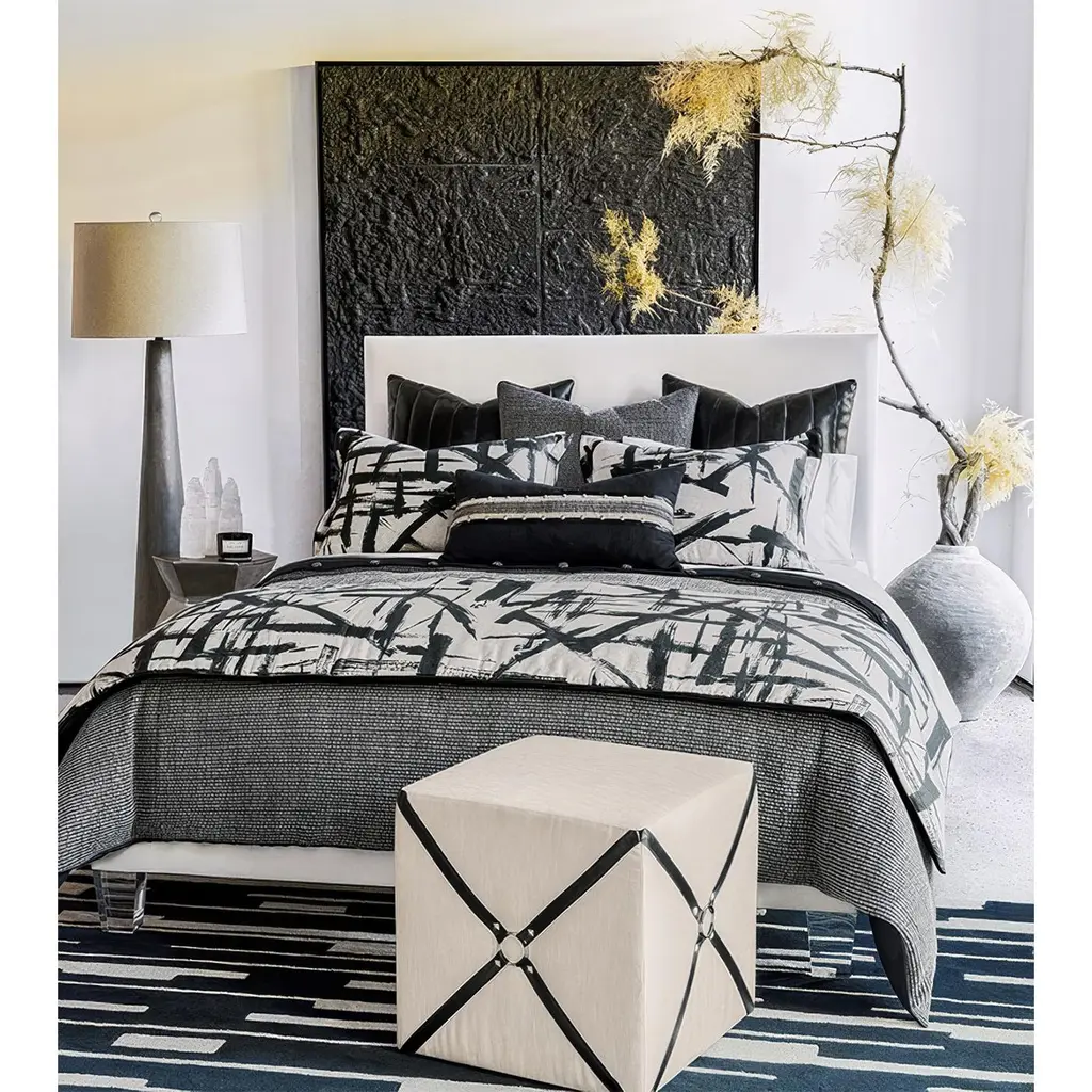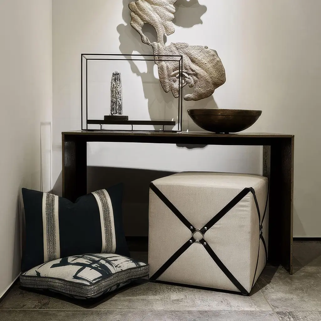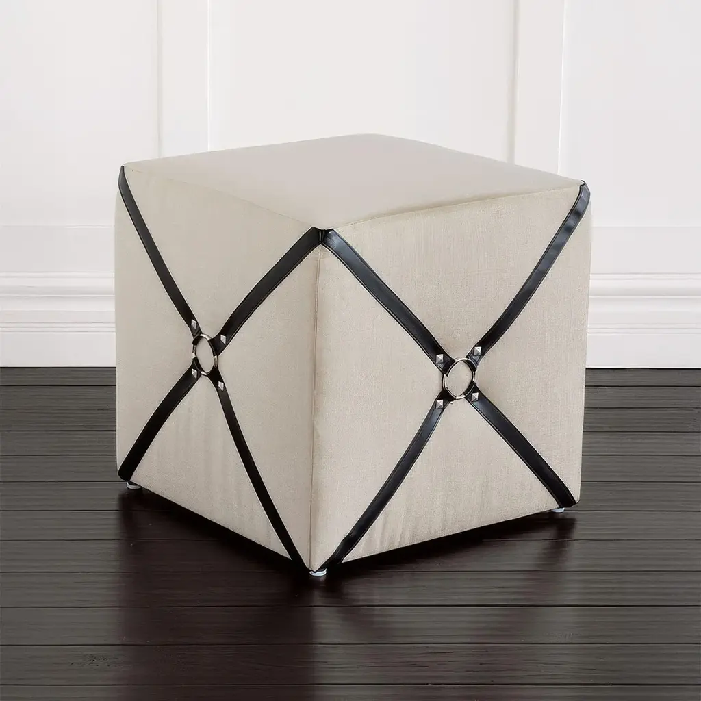 Upholstered in a luxurious ivory fabric, this cube ottoman exudes sophistication, while its vegan leather harness accents and pyramid nailhead details introduce an edgy yet refined aesthetic. The symmetrical, structured design is perfect for contemporary interiors, offering a touch of high-fashion influence with its equestrian-inspired detailing. Designed for both style and comfort, this ottoman is thickly padded and tightly upholstered, ensuring long-lasting durability. The high-density foam core provides exceptional support, making it an excellent choice for additional seating, a chic vanity stool, or a stylish footrest. Proudly Made in the USA, this piece embodies quality craftsmanship with a sleek, modern edge. Dimensions: 19" W x 19" D x 19" H Made in the USA. Lead time is 6 weeks.