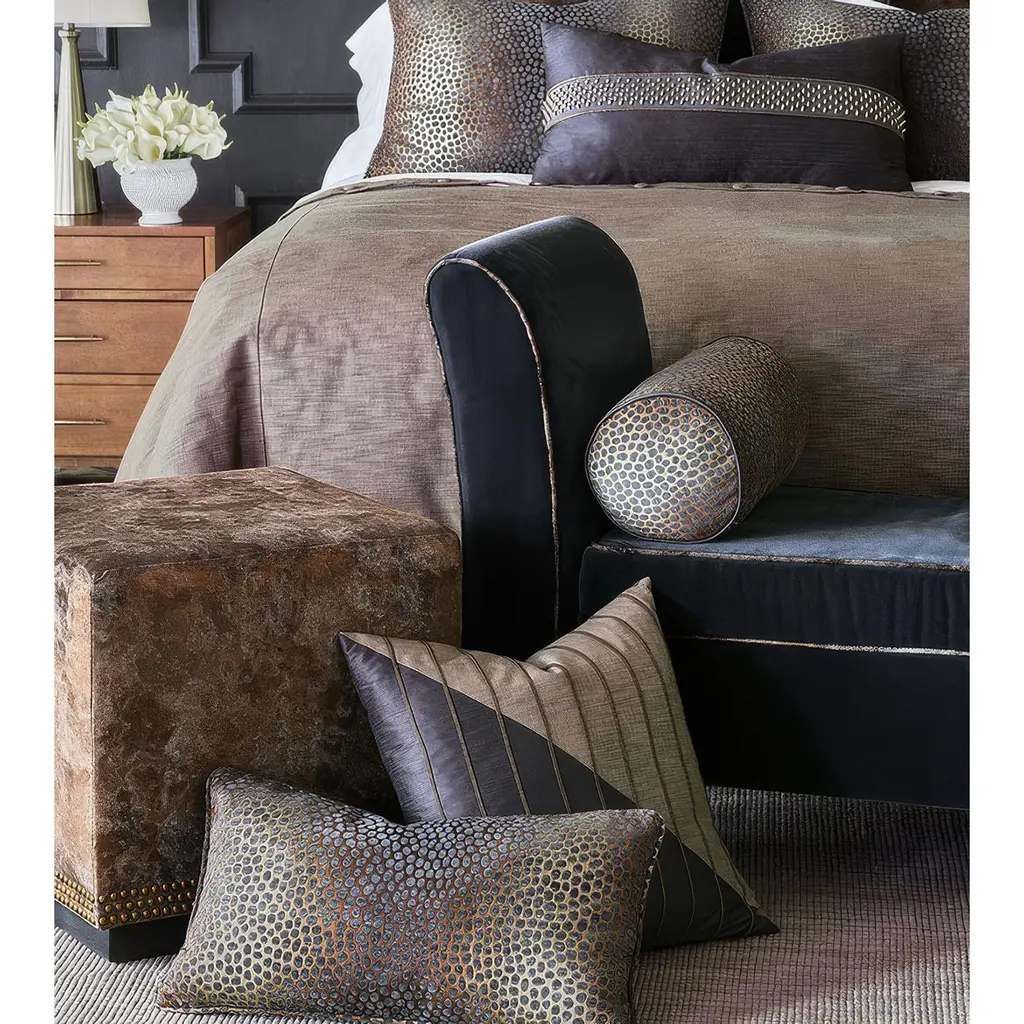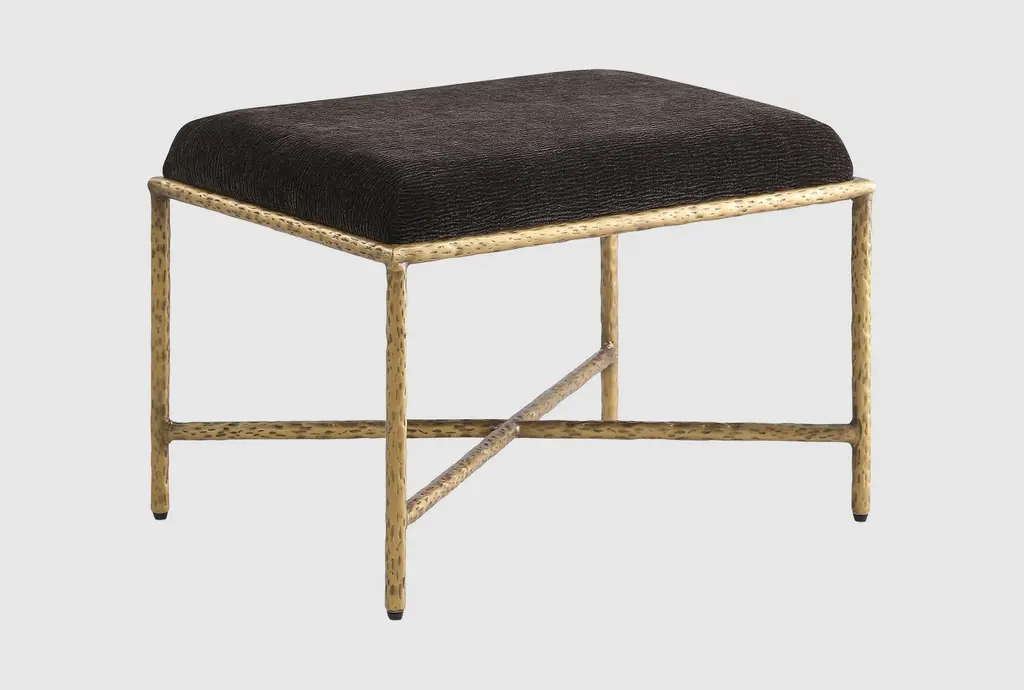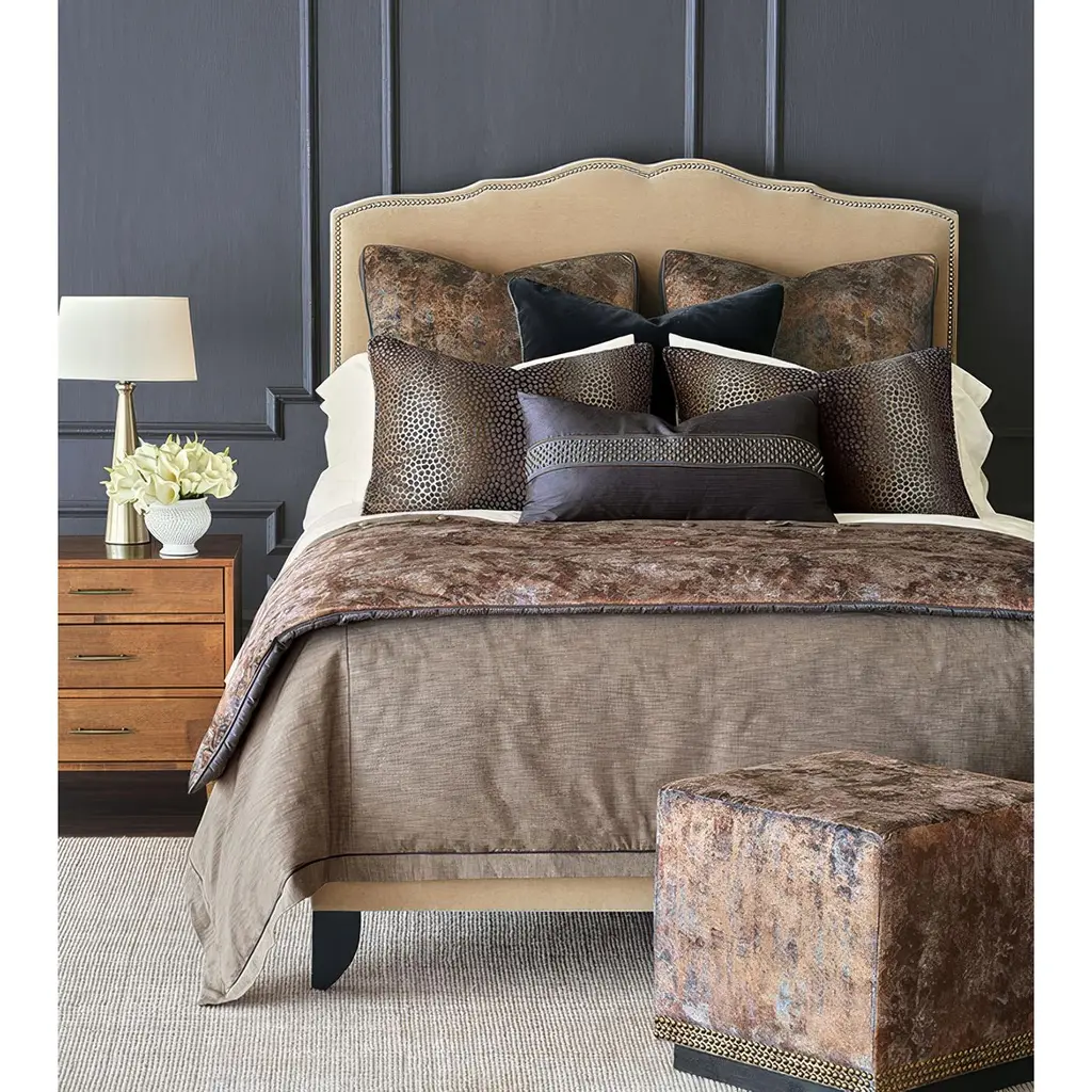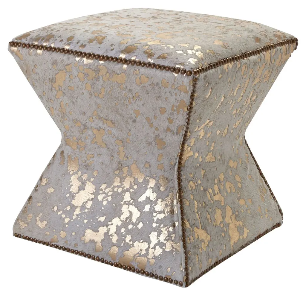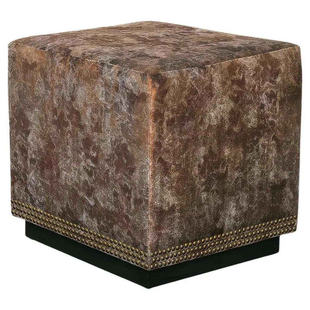 A bold fusion of contemporary design and timeless luxury. Wrapped in metallic copper velvet, this ottoman radiates warmth and sophistication, creating a statement piece for any space. The structured cube silhouette is anchored by a coal-stained solid wood base, offering a striking contrast. Three rows of brushed gold nailheads along the bottom edge enhance its refined appeal, adding a touch of classic elegance. Designed for both style and durability, this ottoman is benchmade in the USA with expert craftsmanship. The tightly upholstered and thickly padded construction ensures long-lasting comfort and support. Felt-padded glides on the base protect floors, making it a practical yet luxurious addition to any room. Whether used as an accent seat, a chic footrest, or a decorative statement, the Metallic Velvet Cube Ottoman brings an elevated touch to modern and traditional interiors alike. Dimensions: 19" W x 19" D x 19" H Made in the USA. Lead time is 6 weeks.