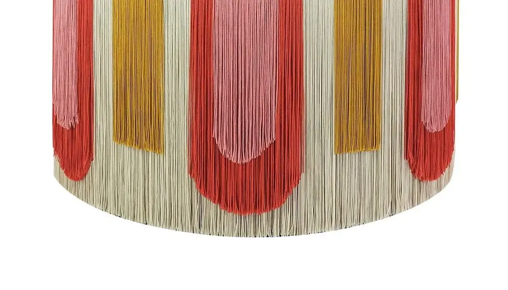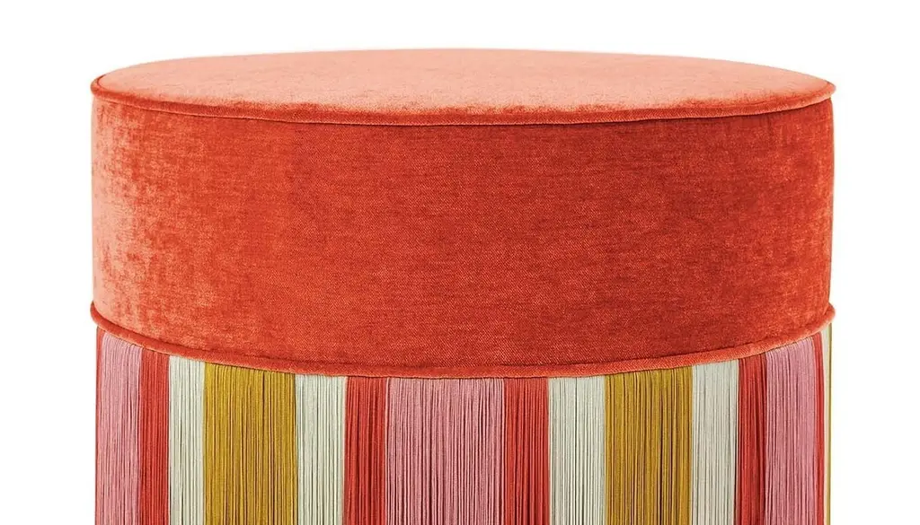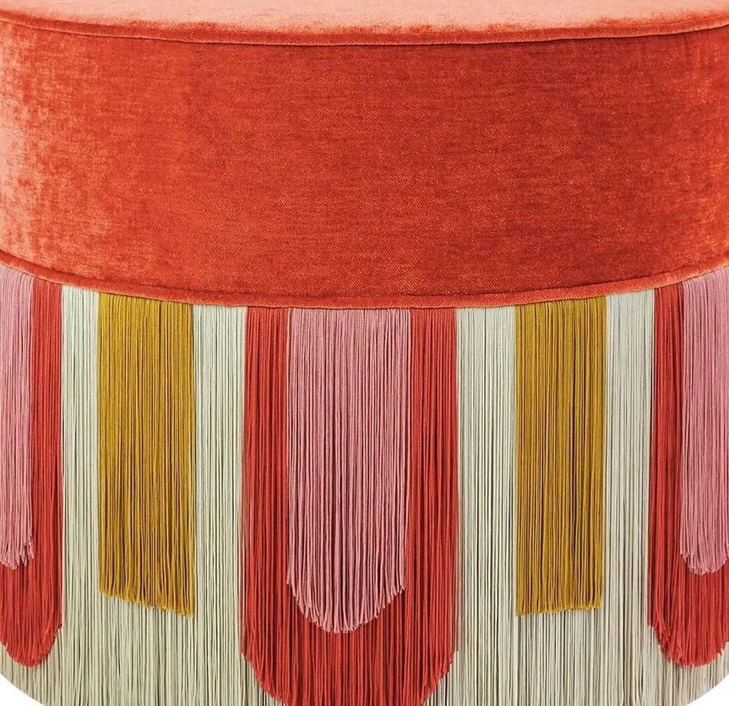 This Art Deco-inspired ottoman is entirely upholstered in velvet made of acetate (53%), polyester (42%), and viscose (5%). It stands out for its bright colors and sophisticated geometric pattern: the cover comprises a solid orange top and fringes in complementary salmon pink, pink, and gold that bestow a lively and alluring accent to the cream-colored base. This velvet pouf was introduced at the Salone del Mobile Milano in 2019 and is customizable, please ask the concierge for details. Each bespoke piece is stamped at the bottom of the lining of the pouf, signed, numbered and dated personally by the designer Lorenza Bozzoli. The original authenticity of each product highlights the artisanal quality and the art of a luxury dedicated design.