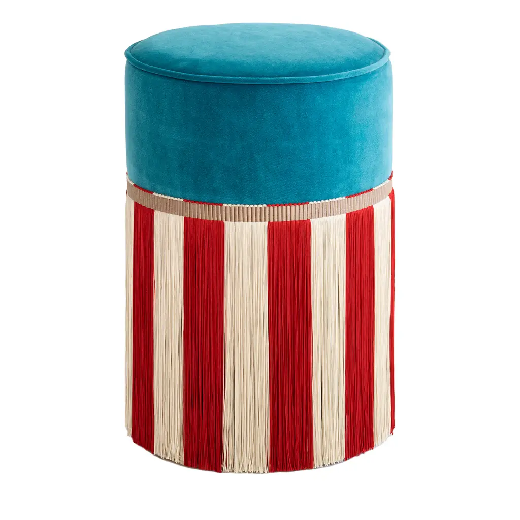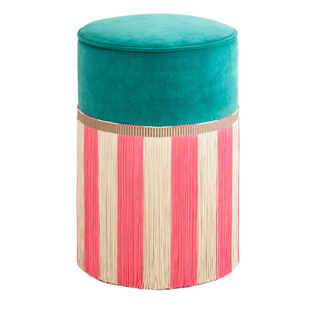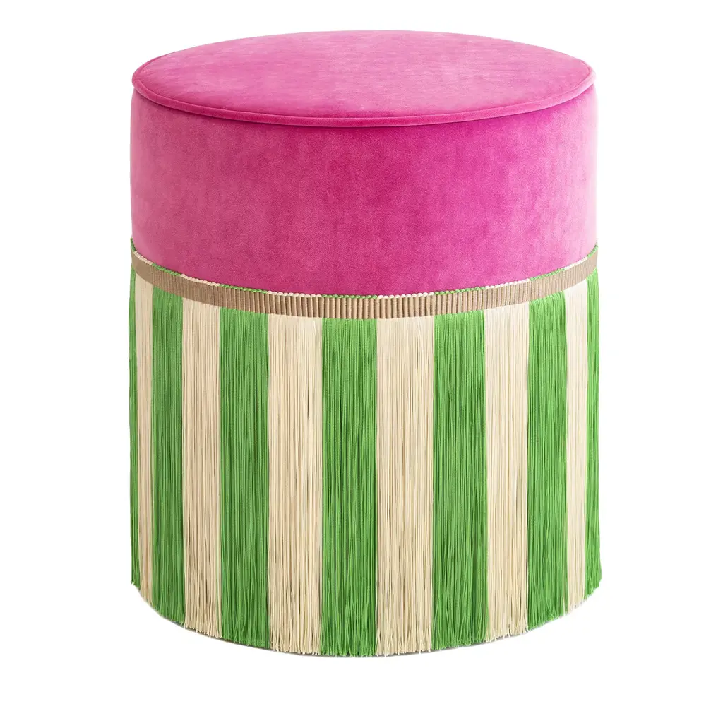 A fresh mint-green tone and a delicate off-white shade were selected for the viscose fringes lending this cylindrical ottoman its hypnotizing striped design. Featuring a sturdy beech core for exceptional resistance, the piece boasts a plush seat previously covered in fine orange-toned velvet for sealing the general color vibrancy. Please contact the Concierge for customization inquiries.