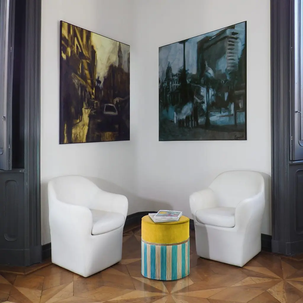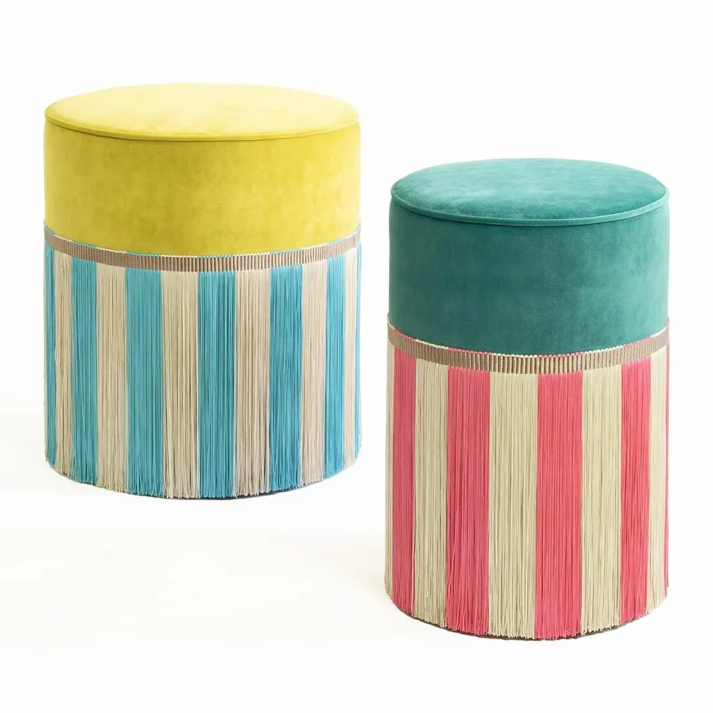 Lively and stylish, this cylindrical ottoman is a stunning piece sure to perk up otherwise dull corners of modern homes. Viscose fringes outline a striped design where the fresh combination of turquoise and white well harmonizes with the bright-yellow tone selected for the soft velvet seat. Featuring a sturdy beech core, the piece also comes in different color and size options.