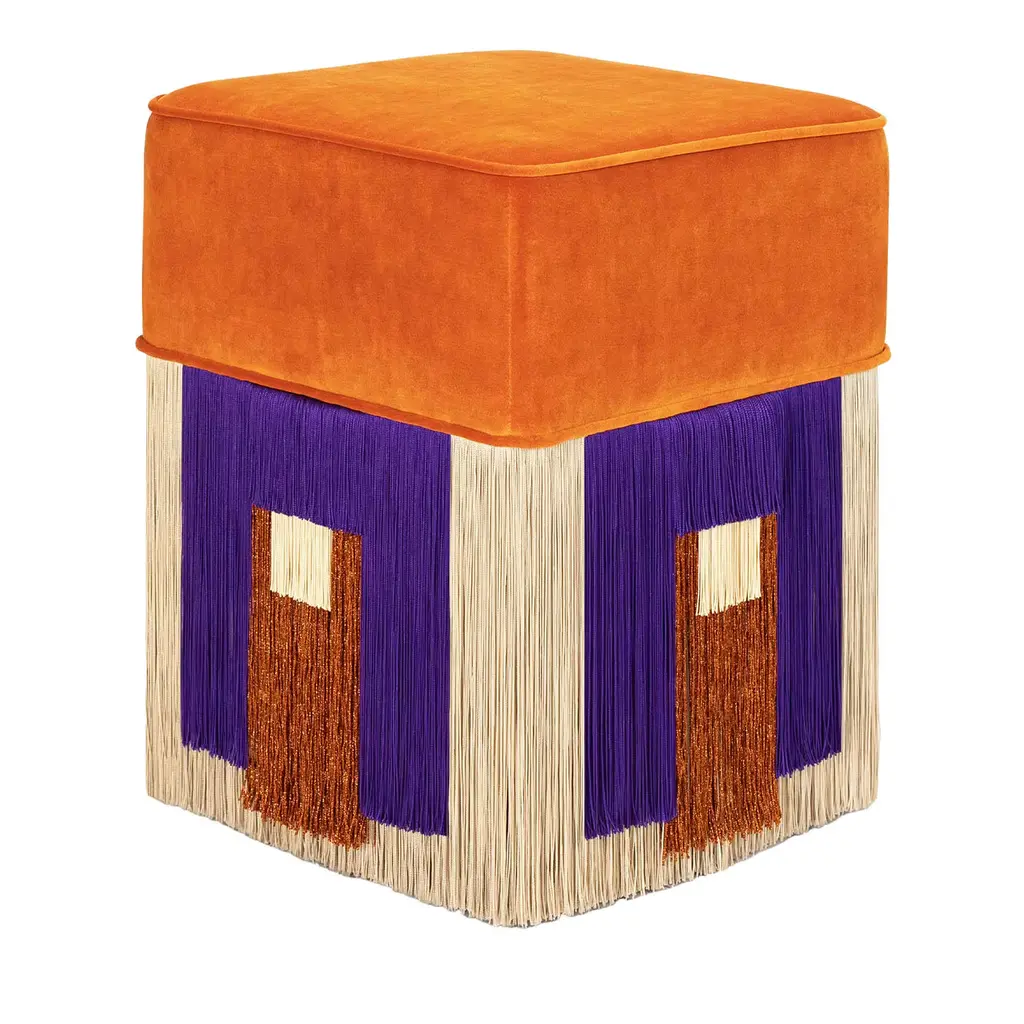 This lively velvet pouf perfectly expresses the energy and glamour of the Art Deco style. With its solid beige, refined cushion from which black, lilac, peach-pink, and melon-colored layers hang in geometric shapes, this ottoman embodies the concept of Bozzoli's design: functional and aesthetically powerful. The sophisticated color combination and exuberant design will be a luminous addition to a modern setting. This piece was presented at Milan Design Week 2019, it is customizable, please refer to the concierge for details. Each bespoke piece is stamped at the bottom of the lining of the pouf, signed, numbered and dated personally by the designer Lorenza Bozzoli. The original authenticity of each product highlights the artisanal quality and the art of a luxury dedicated design. Each bespoke piece is stamped on the bottom of the pouf’s lining and personally signed, numbered, and dated by designer.
