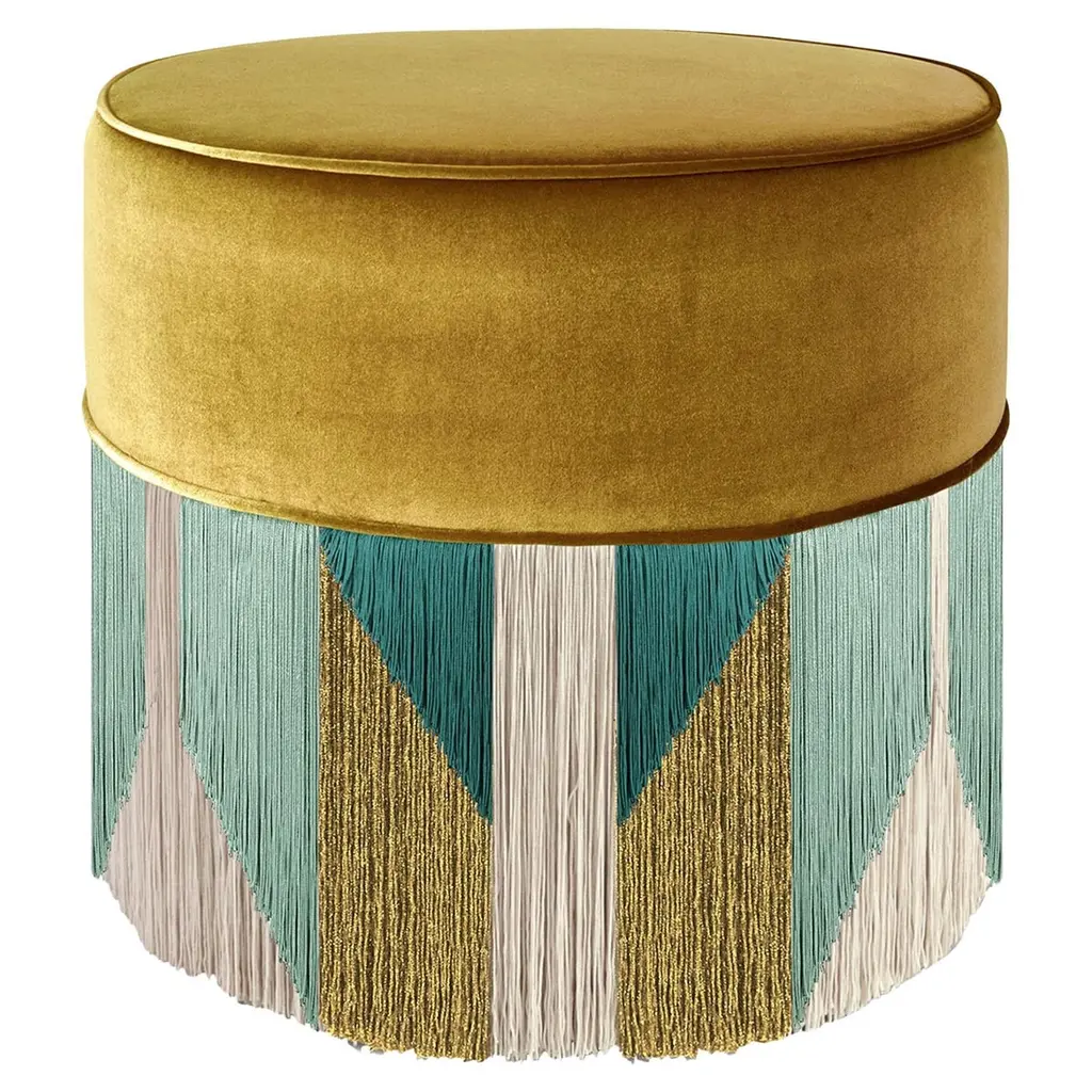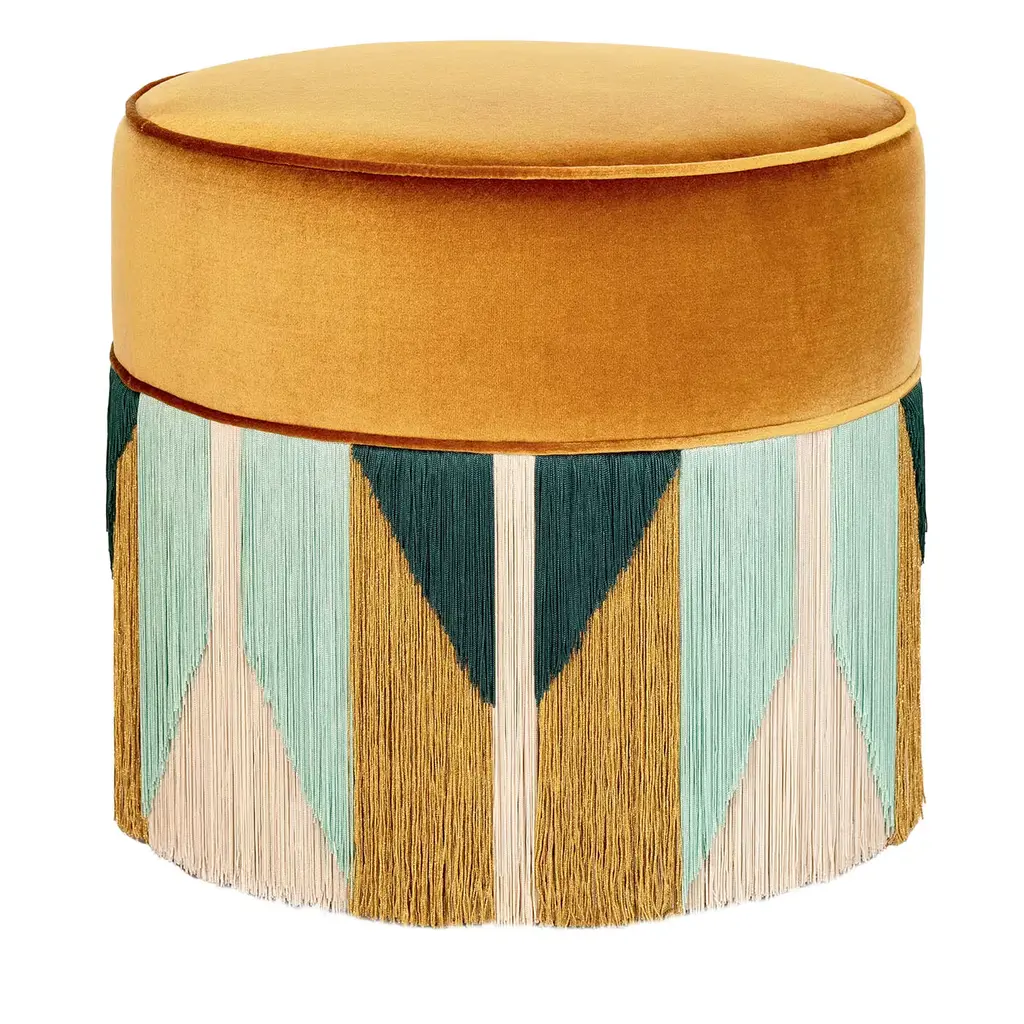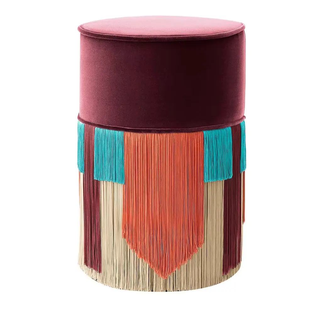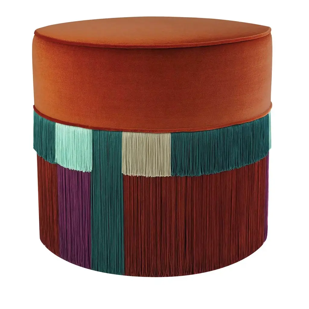 This exquisite Art Deco ottoman will add a vibrant accent to a sophisticated home. The top cushion is upholstered with a cognac-hued velvet cover, strikingly contrasting with the multi-colored fringes that gently cover the bottom half of the piece in burgundy, light pink, and azure blue with a purple layer at the bottom. This splendid ottoman was introduced at Milan Design Week 2019 and is customizable, please contact the Concierge for options. Each bespoke piece is stamped at the bottom of the lining of the pouf, signed, numbered and dated personally by the designer Lorenza Bozzoli. The original authenticity of each product highlights the artisanal quality and the art of a luxury dedicated design.