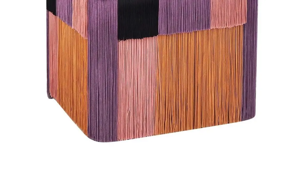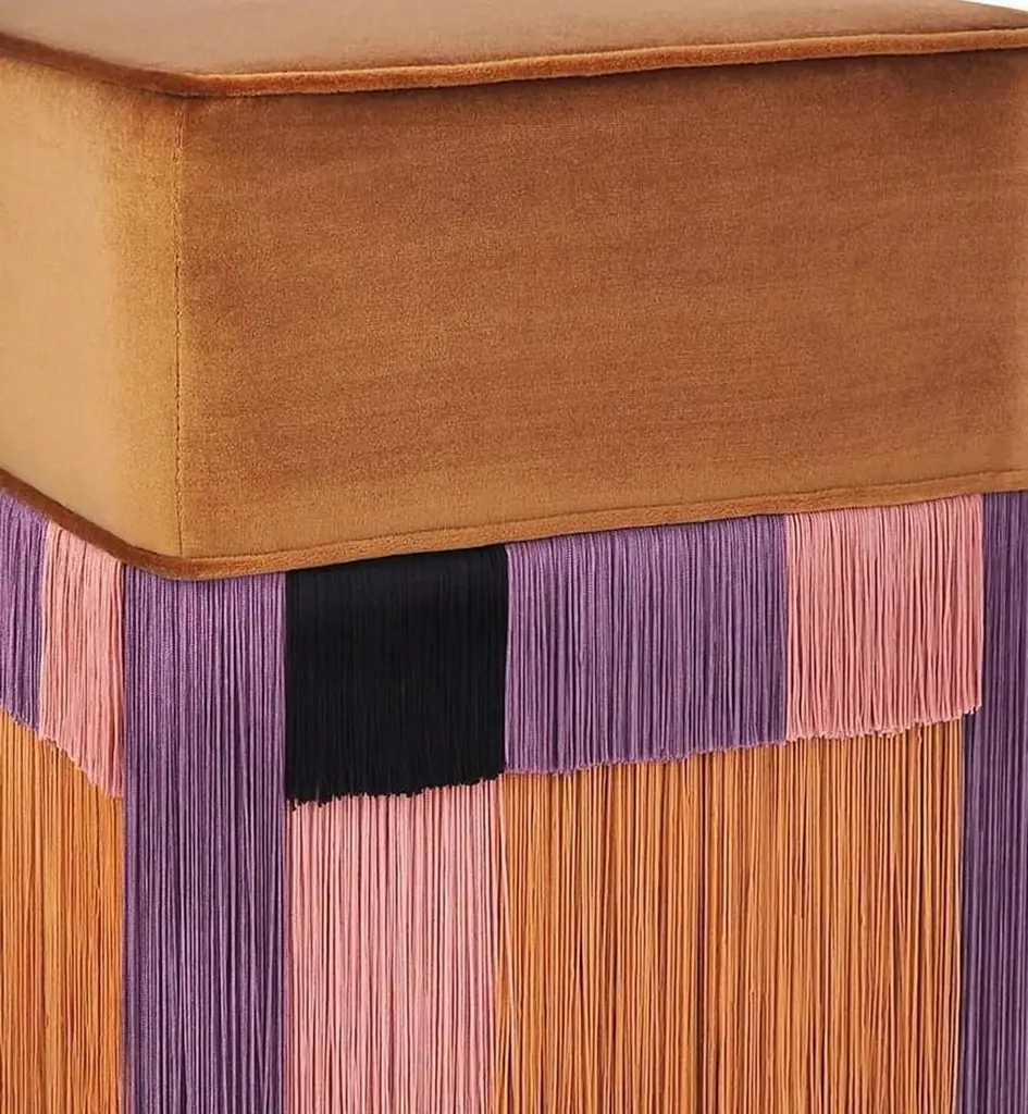 This lively velvet pouf perfectly expresses the energy and glamour of the Art Deco style. With its solid beige, refined cushion from which black, lilac, peach-pink, and melon-colored layers hang in geometric shapes, this ottoman embodies the concept of Bozzoli's design: functional and aesthetically powerful. The sophisticated color combination and exuberant design will be a luminous addition to a modern setting. This piece was presented at Milan Design Week 2019, it is customizable, please refer to the concierge for details. Each bespoke piece is stamped at the bottom of the lining of the pouf, signed, numbered and dated personally by the designer Lorenza Bozzoli. The original authenticity of each product highlights the artisanal quality and the art of a luxury dedicated design.