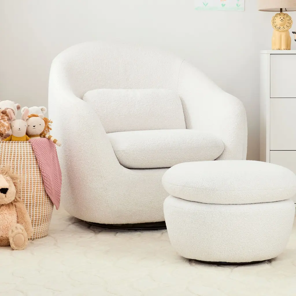 Pairs perfectly with the Cozy Swivel Glider. Available in your choice of made-to-order fabrics or vegan leather. It's GREENGUARD Gold Certified as being low VOC.
