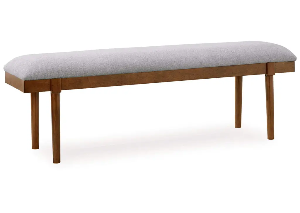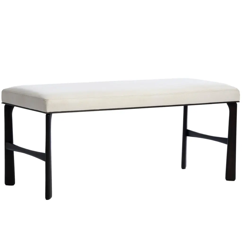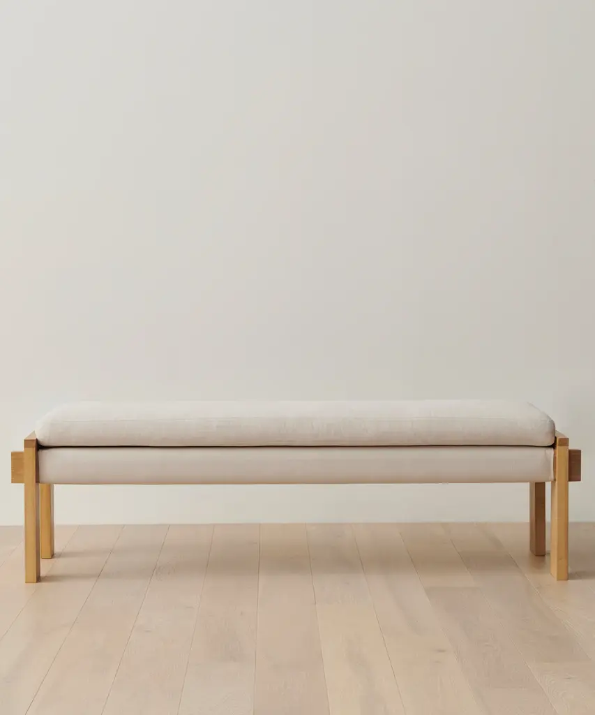 Exuding modern sensibility, this exclusive ottoman strikes with its clean aesthetic balancing simple lines and delicate shades. Fashioned of beech maintaining its natural look, the frame comprises four slanted legs linked by means of a horizontal element that branches in two at its extremities. The rectangular seat resting above is generously padded and upholstered in a light-gray fabric. Contract and commercial certifications available upon request.