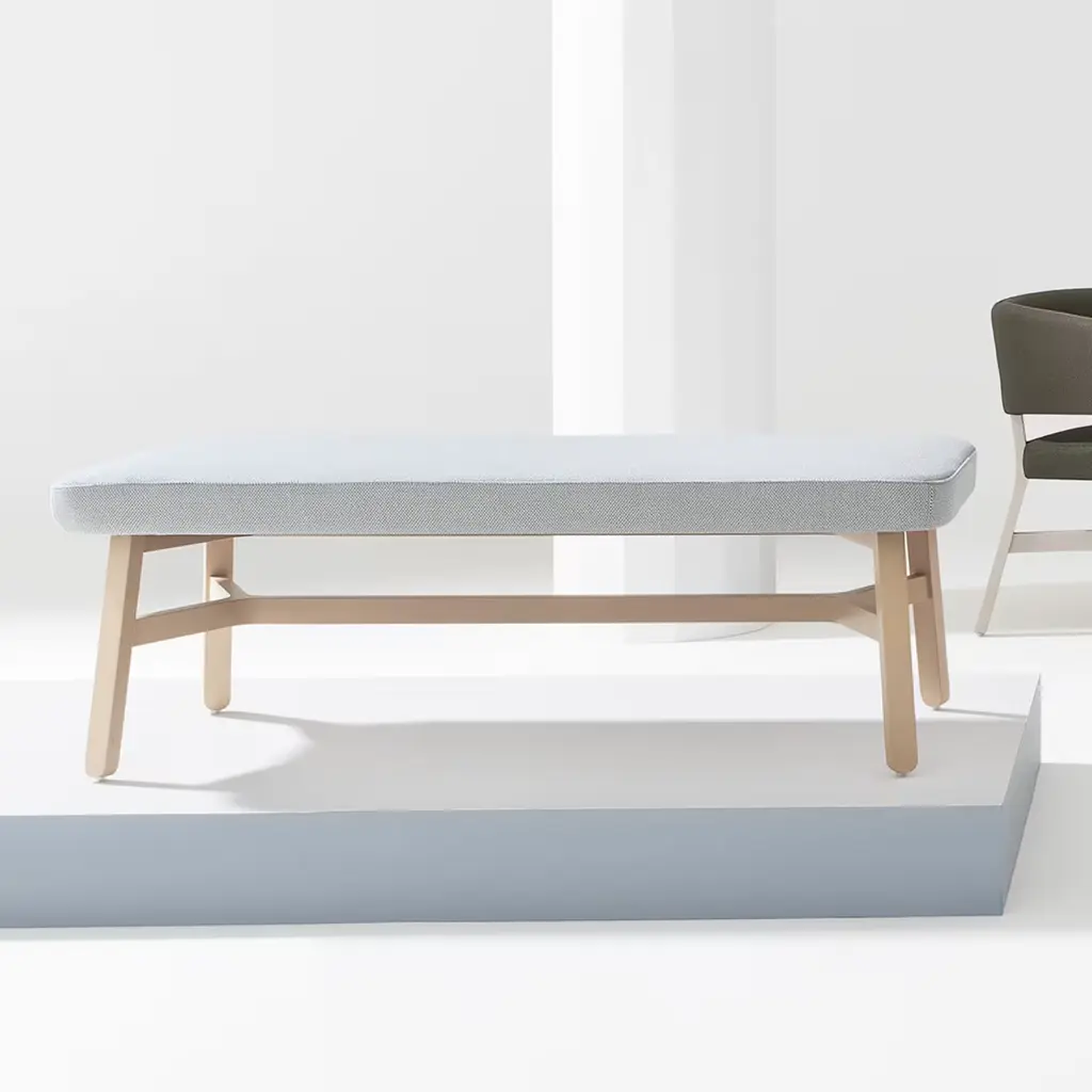 Exuding modern sensibility, this exclusive ottoman strikes with its clean aesthetic balancing simple lines and delicate shades. Fashioned of beech maintaining its natural look, the frame comprises four slanted legs linked by means of a horizontal element that branches in two at its extremities. The rectangular seat resting above is generously padded and upholstered in a light-gray fabric. Contract and commercial certifications available upon request.