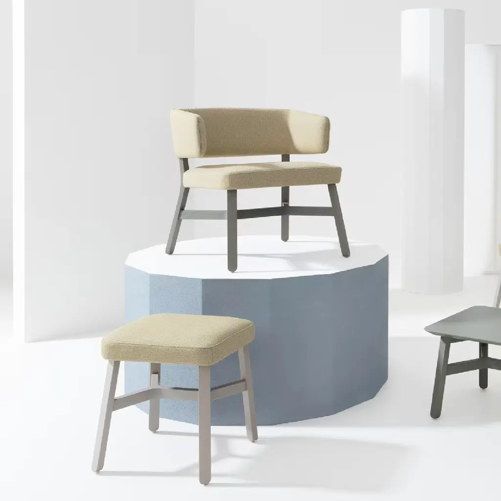 Perfect to be paired with the matching sofa for a cohesive look, this ottoman is a superb project by Emilio Nanni. Featuring a squared, padded seat upholstered in pastel yellow fabric, the ottoman is supported by a sleek beech frame tinted in silk gray that includes flattened legs with rounded feet and a structural crossing under the seat identifying the Croissant Collection.