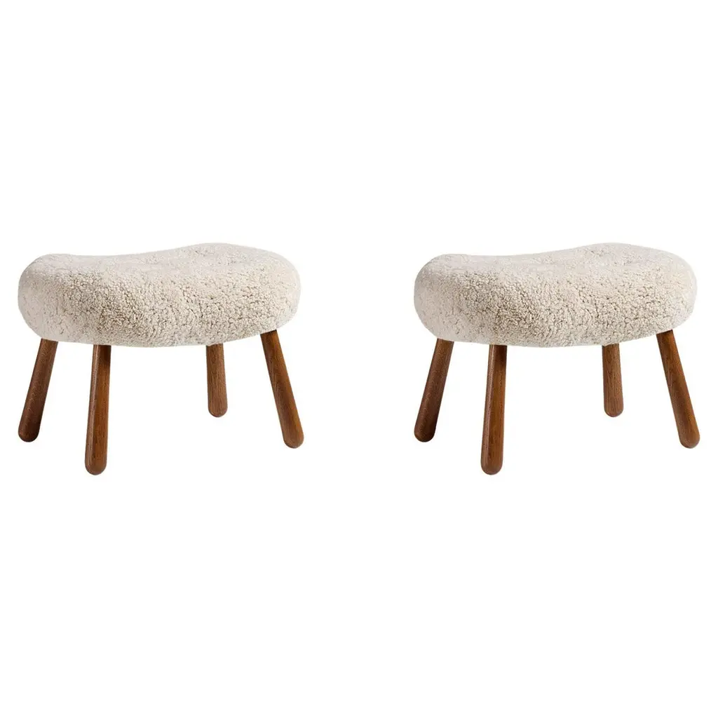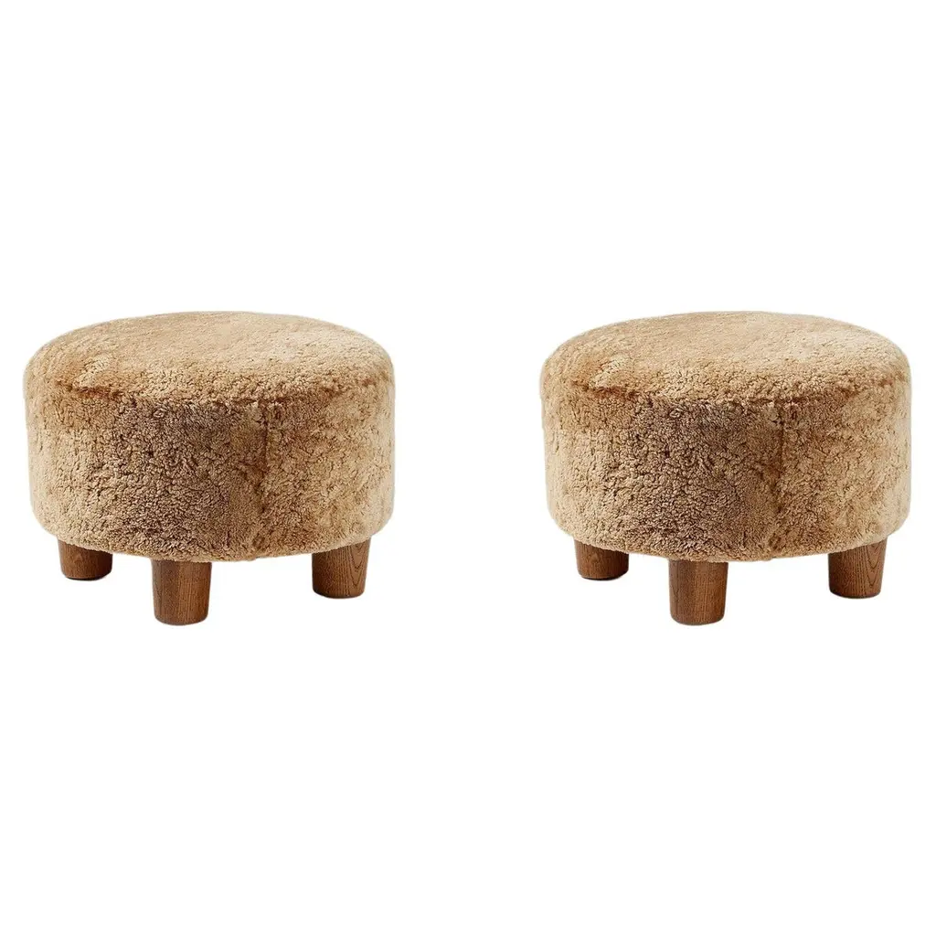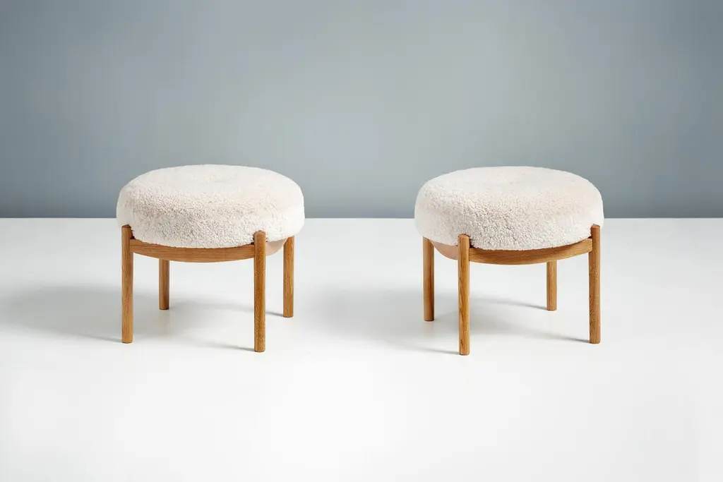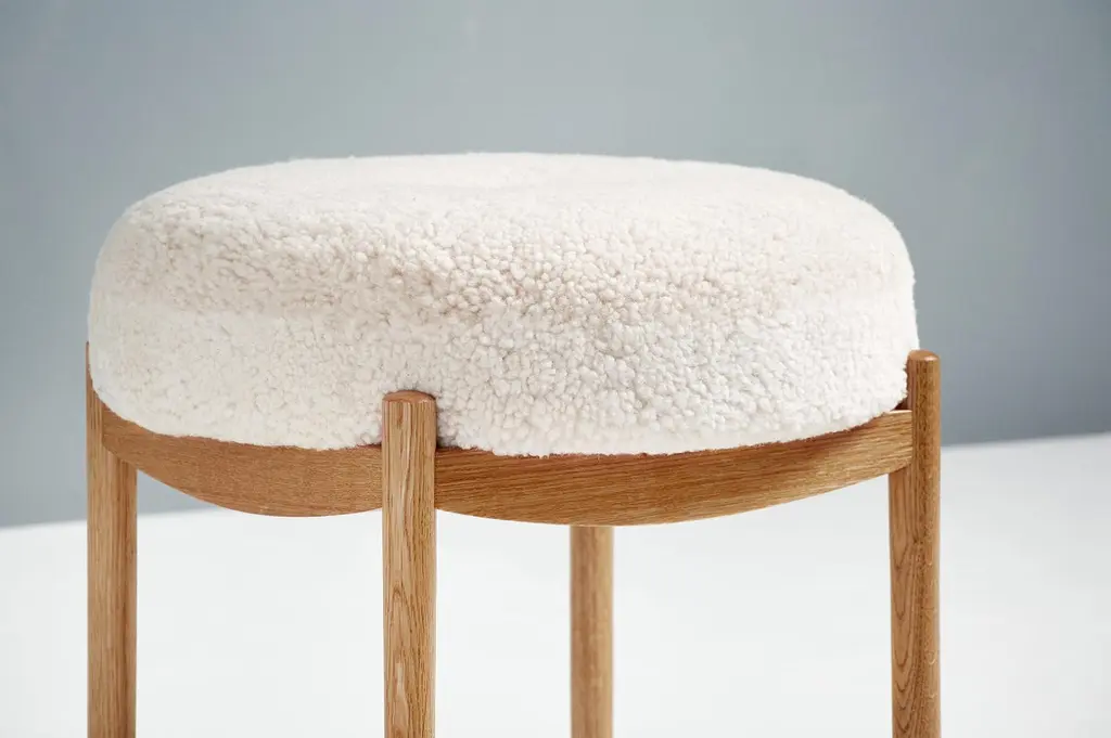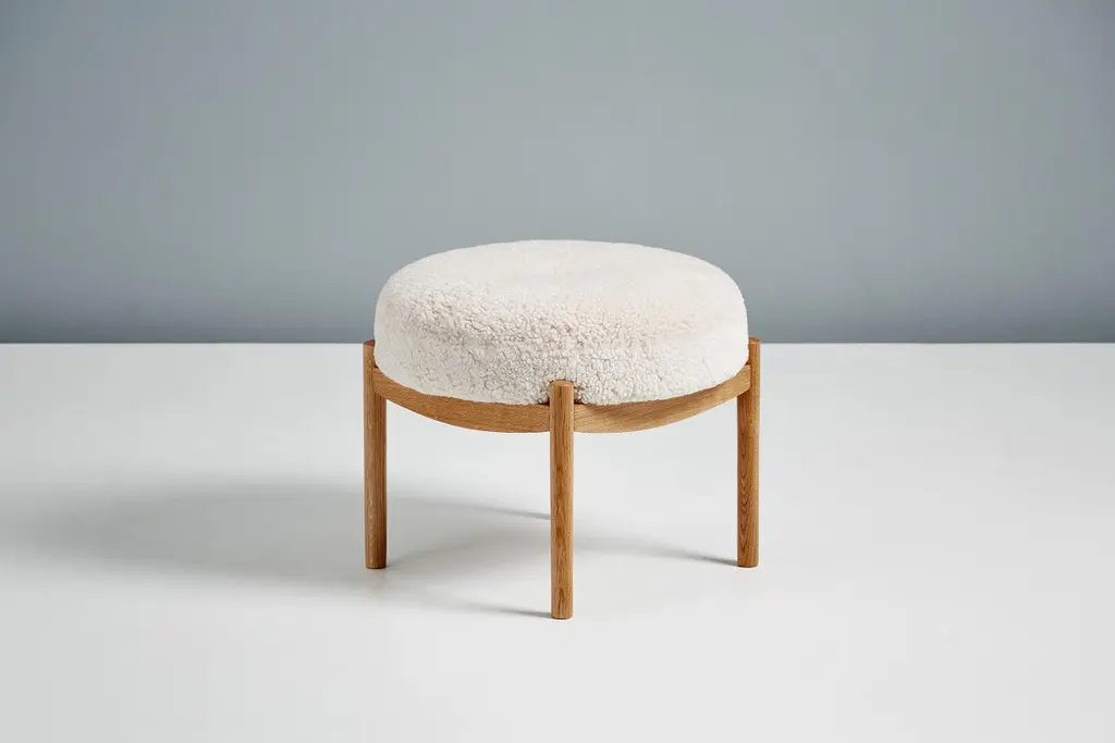 Dagmar design custom-made round ottomanCustom-made ottoman developed & produced at our workshops in London using the highest quality materials. These ottomans have oiled oak frames and 'Moonlight' sheepskin upholstery. This ottoman is available to order in a range of different materials and with a choice of 3 wood finishes.