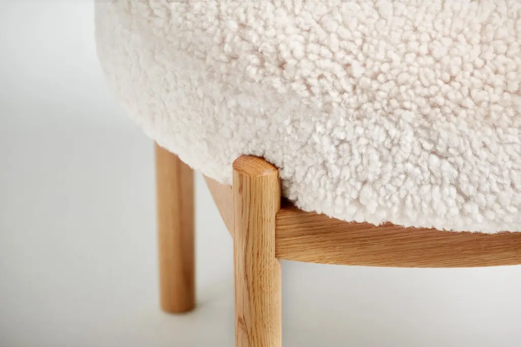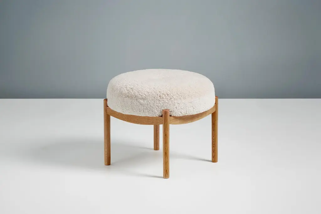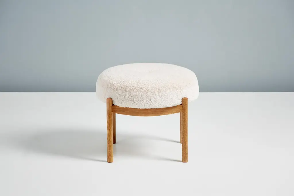Dagmar design custom-made round ottomanCustom-made ottoman developed & produced at our workshops in London using the highest quality materials. These ottomans have oiled oak frames and 'Moonlight' sheepskin upholstery. This ottoman is available to order in a range of different materials and with a choice of 3 wood finishes.