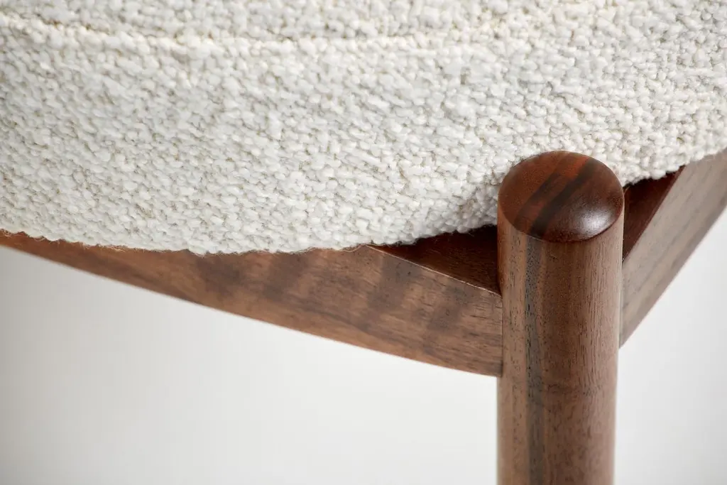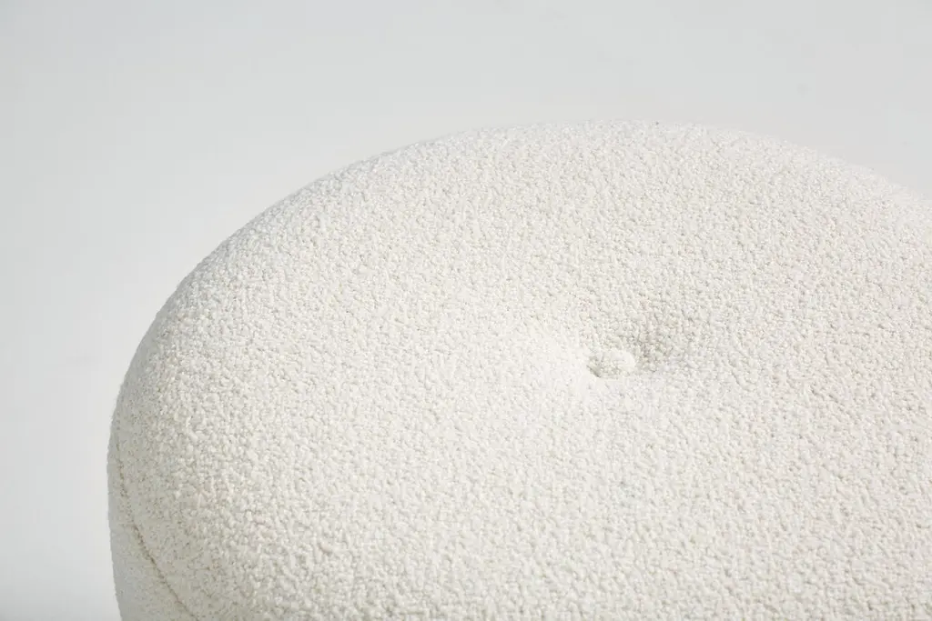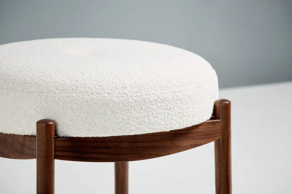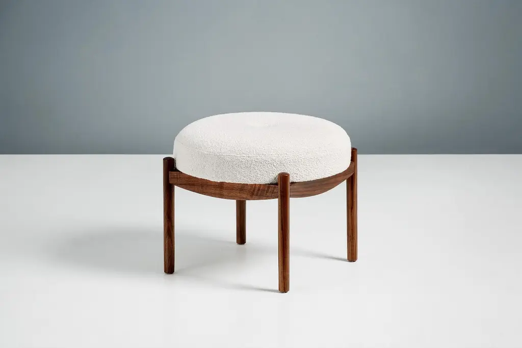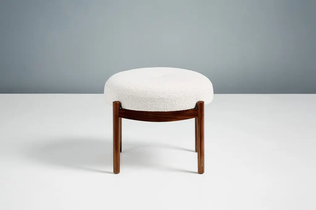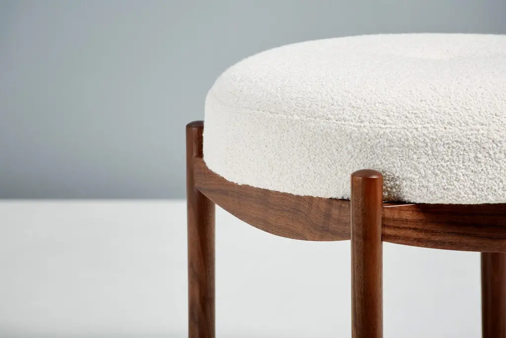 Dagmar designBlek ottomanA custom-made round ottoman with solid wood frame developed & produced at our workshops in London. These examples have frames in fumed and oiled oak with seats upholstered in off-white boucle. Blek is available to order in a range of different wood finishes and upholstery options.This ottoman is available to order in a range of different materials and with a choice of 3 wood finishes.