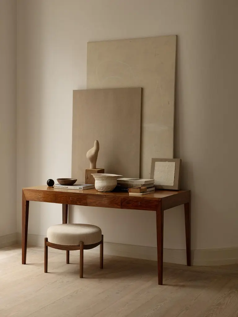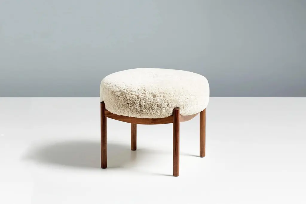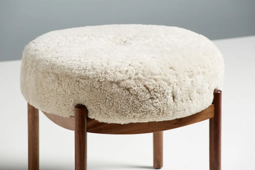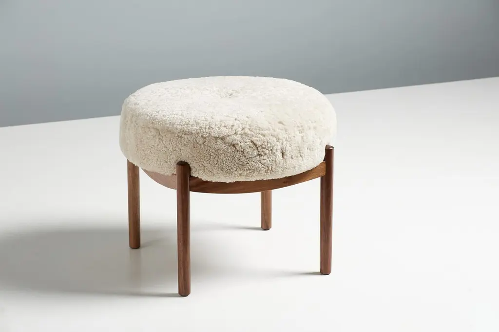 Custom Made Esko ottoman from Dagmar designThis classic yet contemporary design was first produced in Denmark in the 1960s by cabinetmaker Soren Nielsen. This new edition is a stunning example of Danish minimalism and functionality, offering equal parts form and function. Esko has a multitude of uses and can be paired with a range of armchairs.This example has a seat upholstered in luxurious Moonlight sheepskin. The Esko stool is also available to order in a range of different wood finishes and upholstery options.