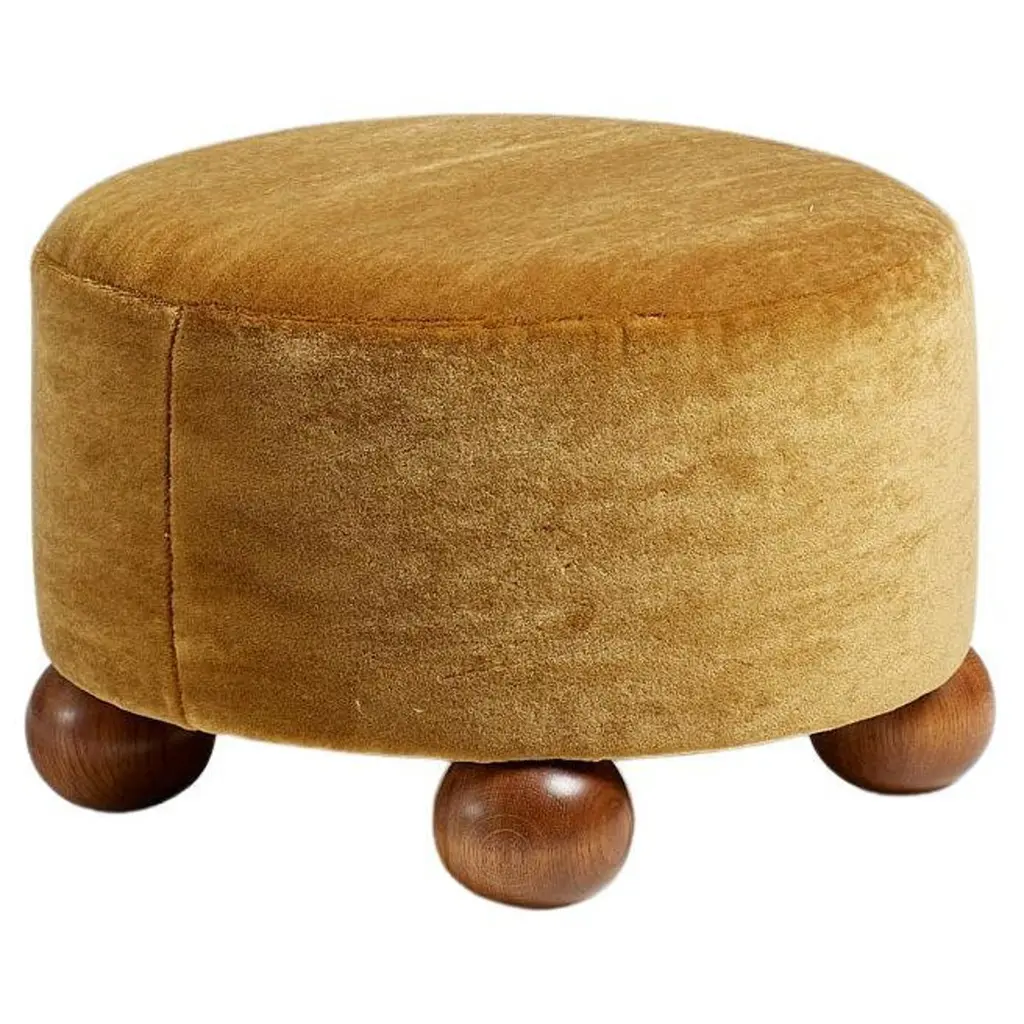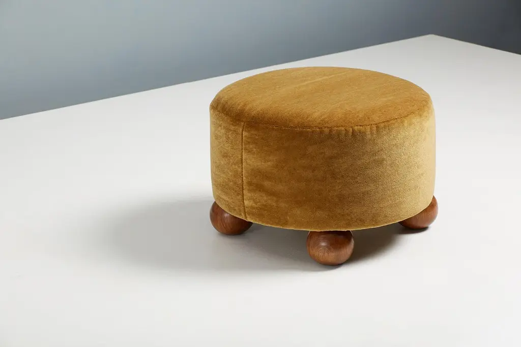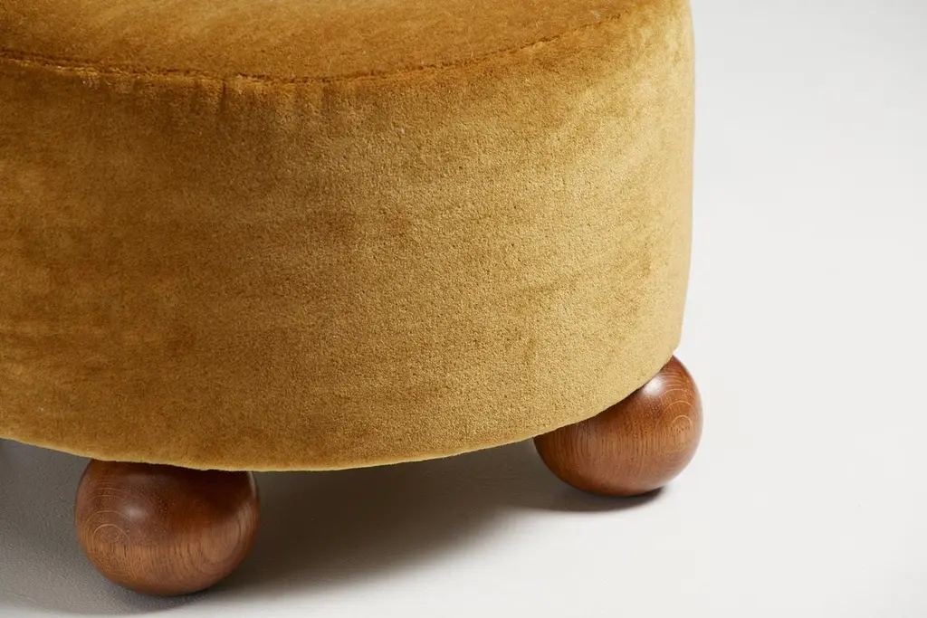 Dagmar Design - Round OttomanCustom-made ottoman developed & produced at our workshops in London using the highest quality materials. These examples are upholstered in a mustard mohair velvet by Pierre Frey with fumed oak ball feet. This ottoman is available to order in a range of different materials and with a choice of 4 leg finishes. This ottoman is also available in a 45cm tall version.Measures: D 60 cm / H 40 cm.