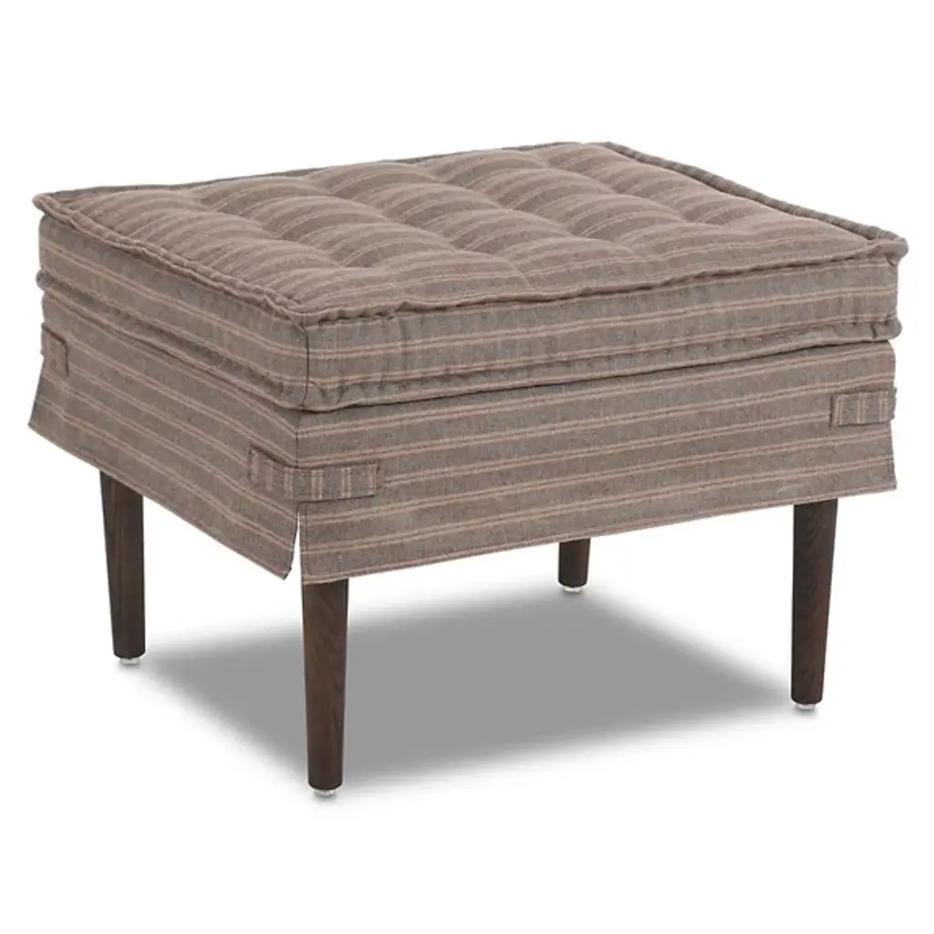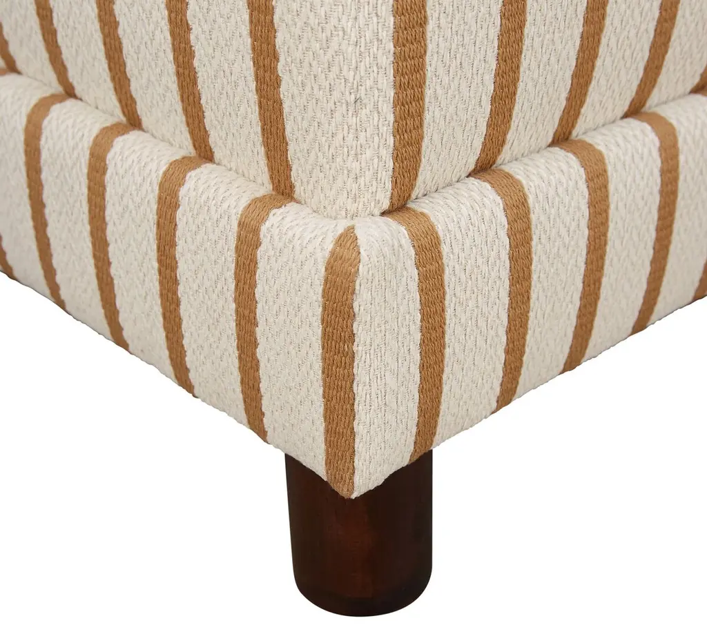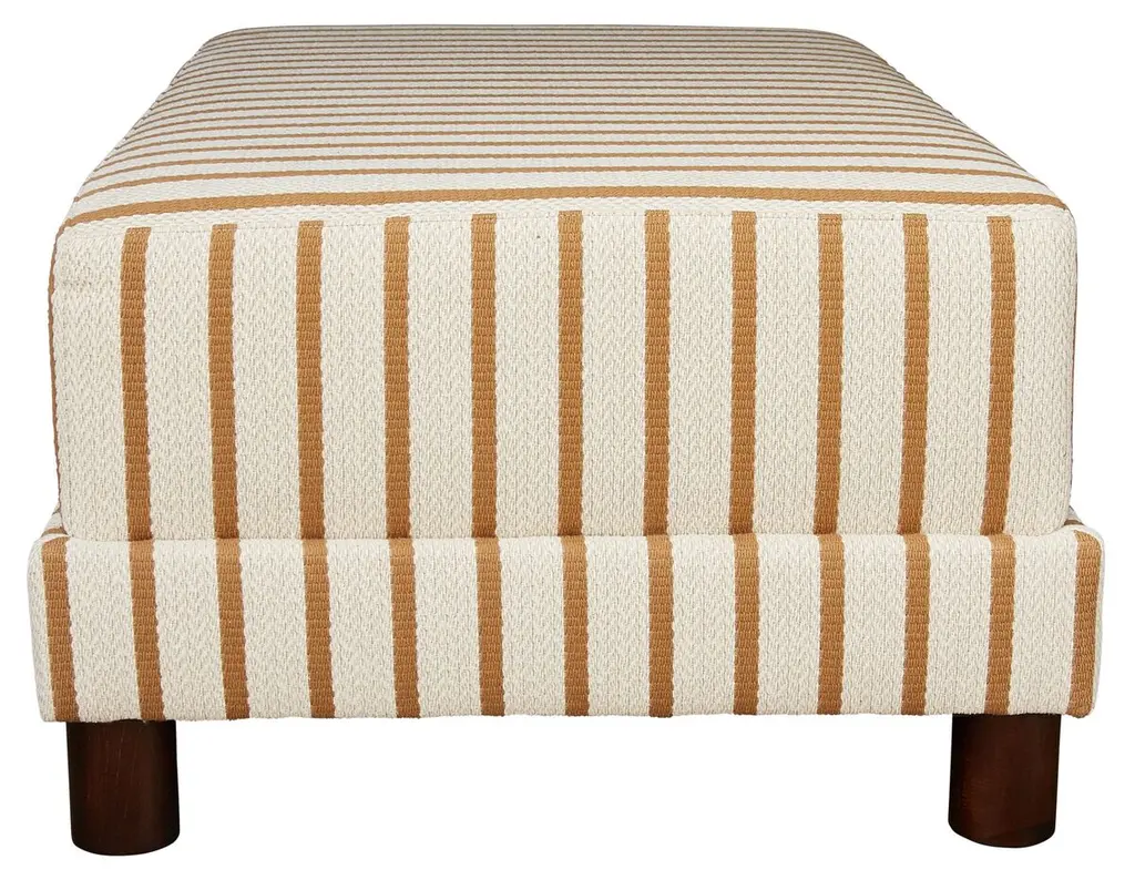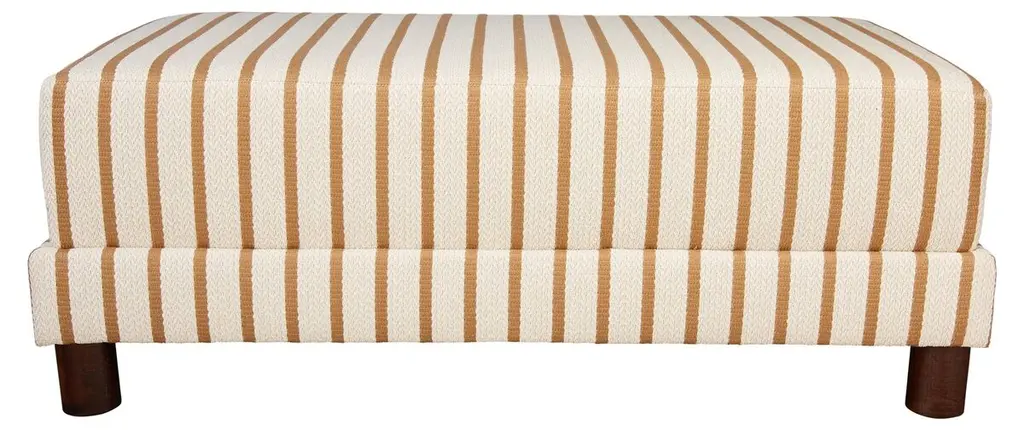 Exclusive to One Kings Lane: The "stepped" design sets this striped ottoman apart; the round legs complement the straight lines perfectly. Four feet wide, this ottoman can serve as a coffee table, a footrest, or extra seating.Kim Salmela's ability to design furnishings that are both breezy and elegant—and comfortable to boot—has made her a customer favorite. We're excited to partner with her for this collection, available only at One Kings Lane, in which her peerless balance of the classic and the modern is in full display.
