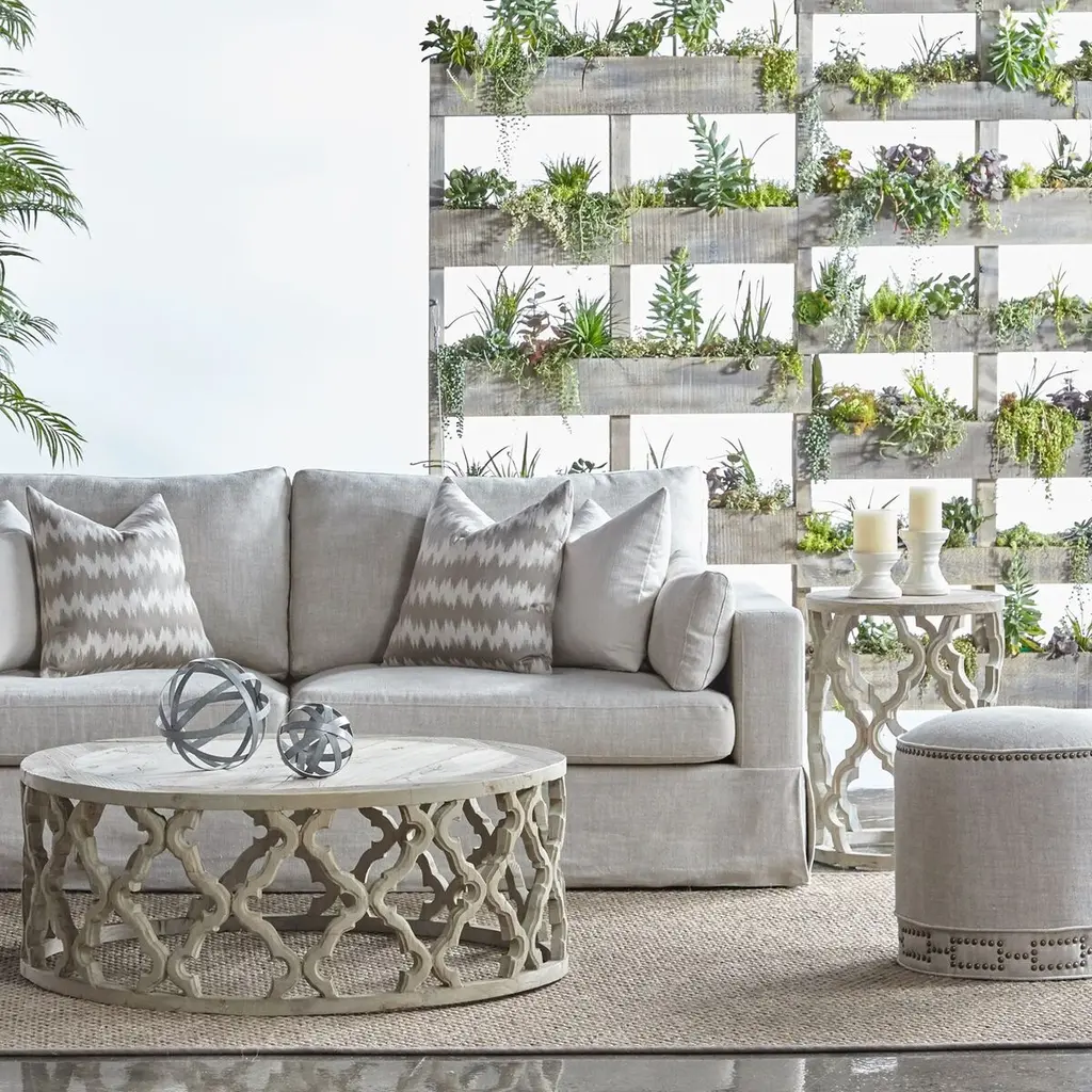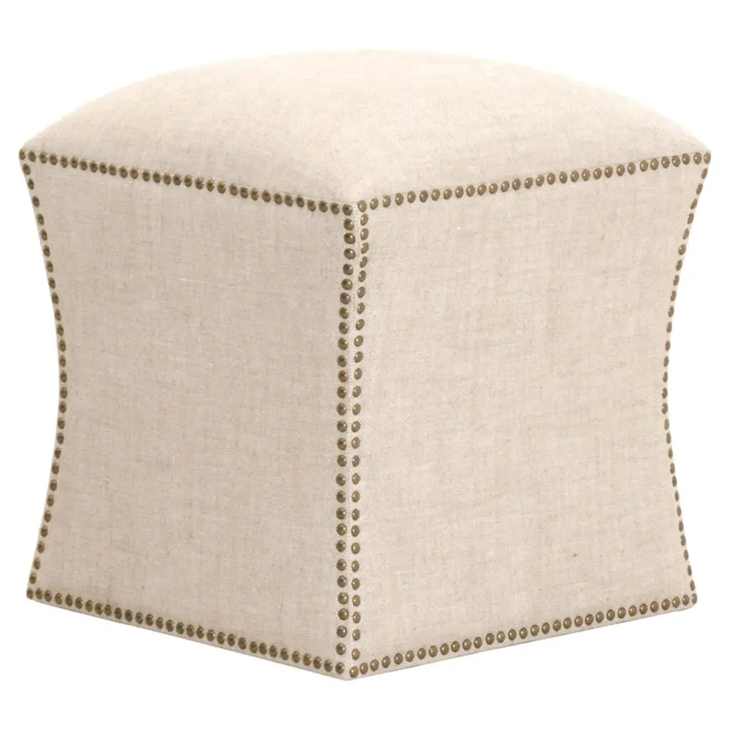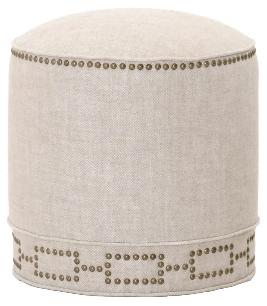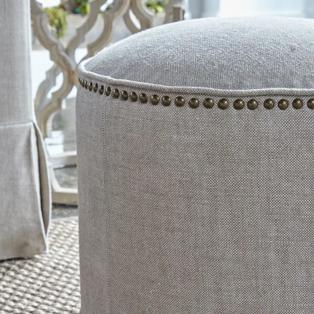 Golden nailheads along the top and bottom add to the timeless elegance of this round ottoman, as does the linen-blend upholstery. This versatile piece can serve as a footrest, extra seating, or when topped with a tray, an occasional table.