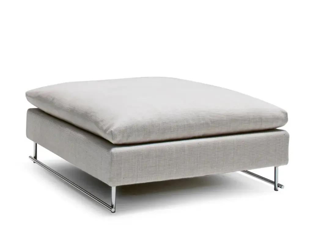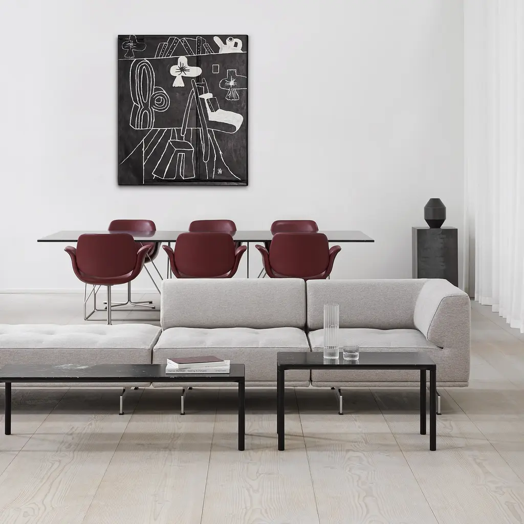 A wide, low-slung profile makes the Delphi Elements Ottoman 120 adaptable for use as a footrest, extra seat, or chaise extension. Designed by Swiss designer Hannes Wettstein, this piece features an inner wooden frame with no-sag springs, cold-cured foam, and a foam duvet, ensuring lasting comfort. The ottoman is upholstered in fabric or leather and rests on a brushed aluminum or solid wood base. It integrates seamlessly into Fredericia’s modular Delphi Elements series.