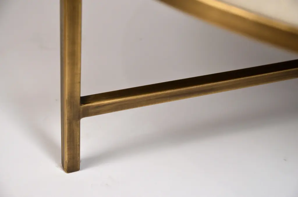 Small white hide and patinated brass 'Tambour' Ottoman by Design Frères. Perfect as a coffee table in the living room, a den or a media room. Brass plated and patinated steel base with hand stitched natural white cream / ivory / white hide seat cushion. Handmade in our Los Angeles workshop. Upholstered firm.