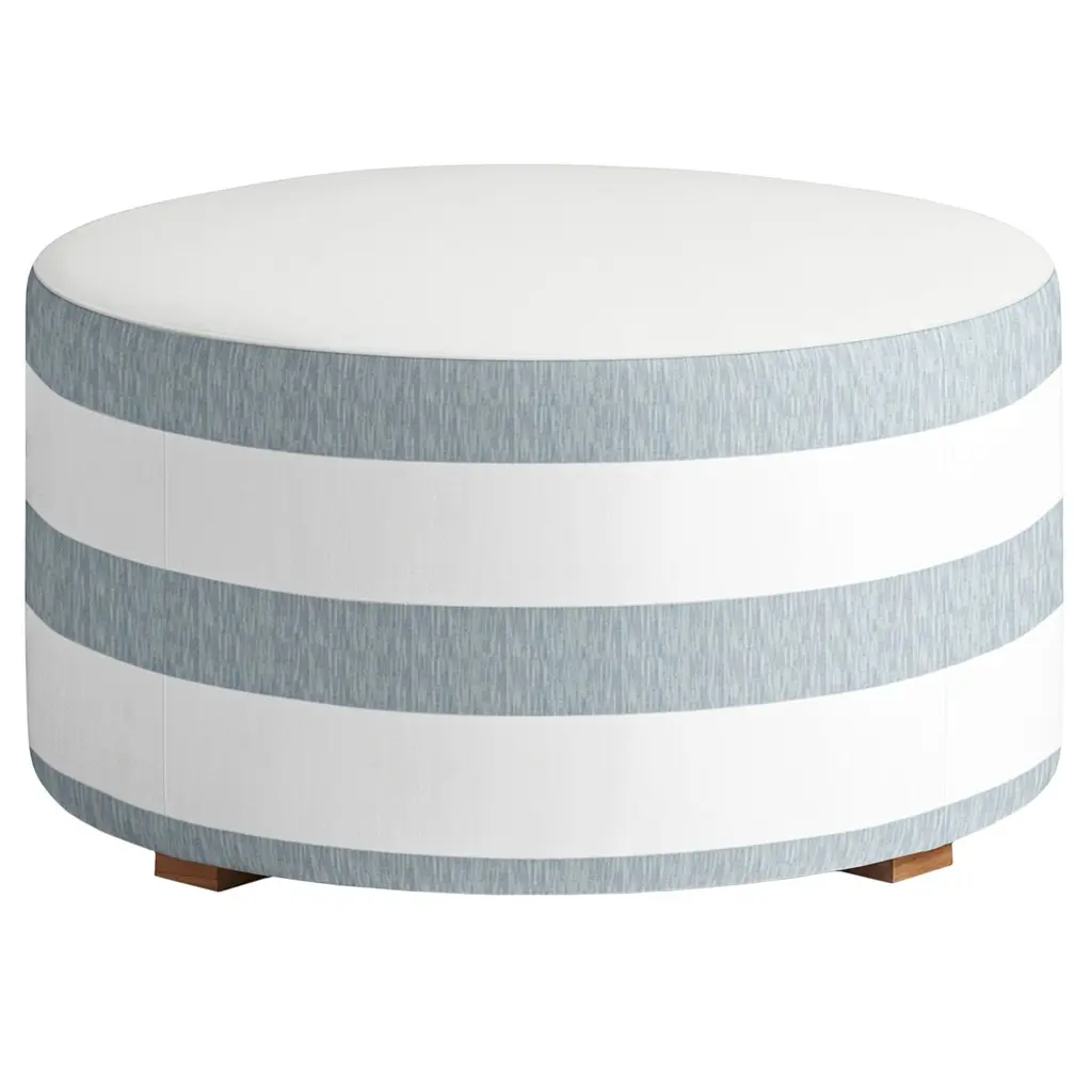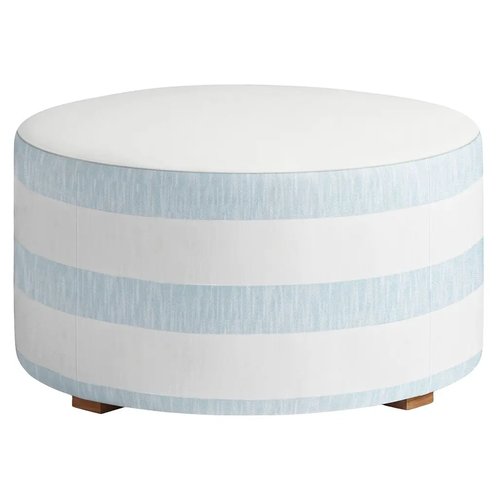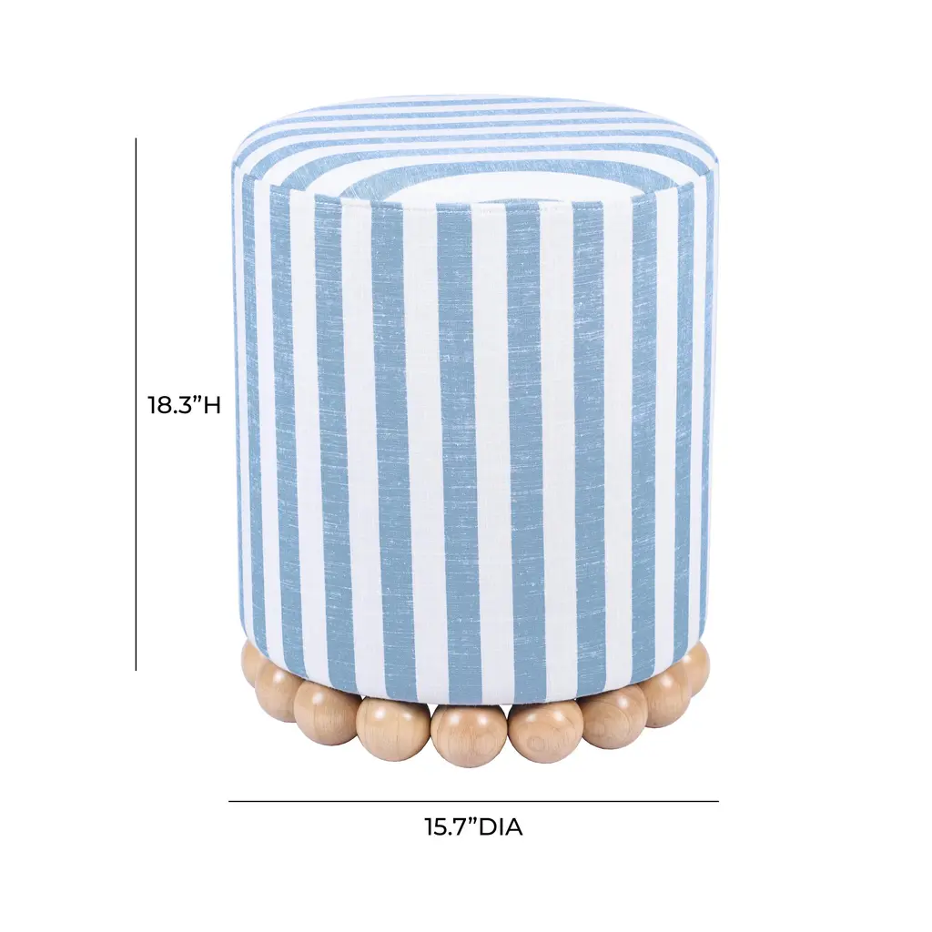 Introducing the Dex Ottomans, a charming and whimsical addition to your space that beautifully blends fresh design with a vibrant tropical vibe. The solid wood spherical orbs at the base create a striking visual element, ensuring a sturdy yet stylish foundation. Choose from playful washed linen-style cabana stripes, eco-friendly upcycled fabric, or bold leopard print jacquard to infuse personality into any room. Perfect for extra seating or as a chic footrest, these ottomans are available in a delightful palette of beige or pastel blue linen, faded blue or cream upcycled fabric, and taupe or olive green leopard prints. Transform your space with a touch of fun and flair!