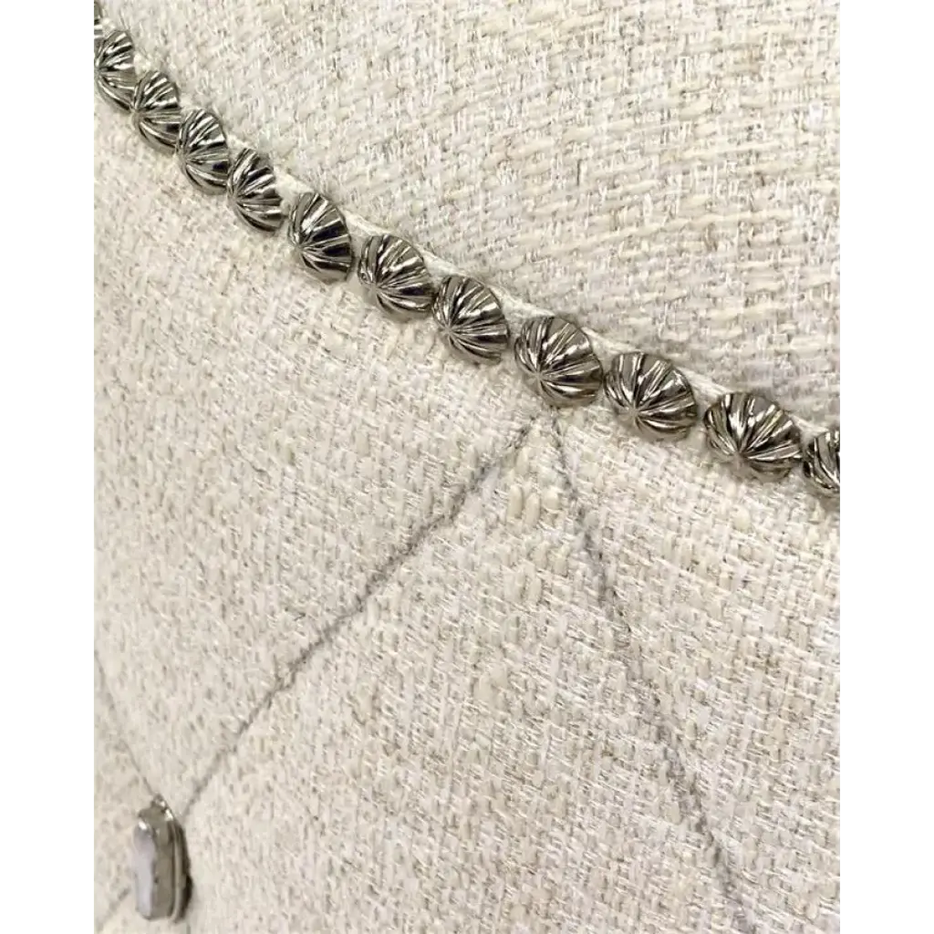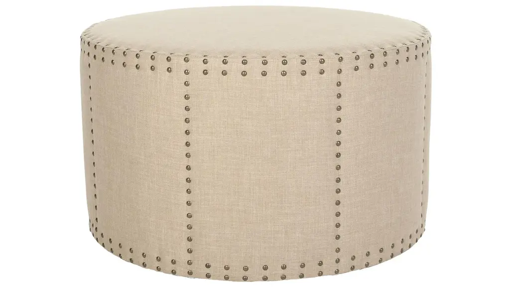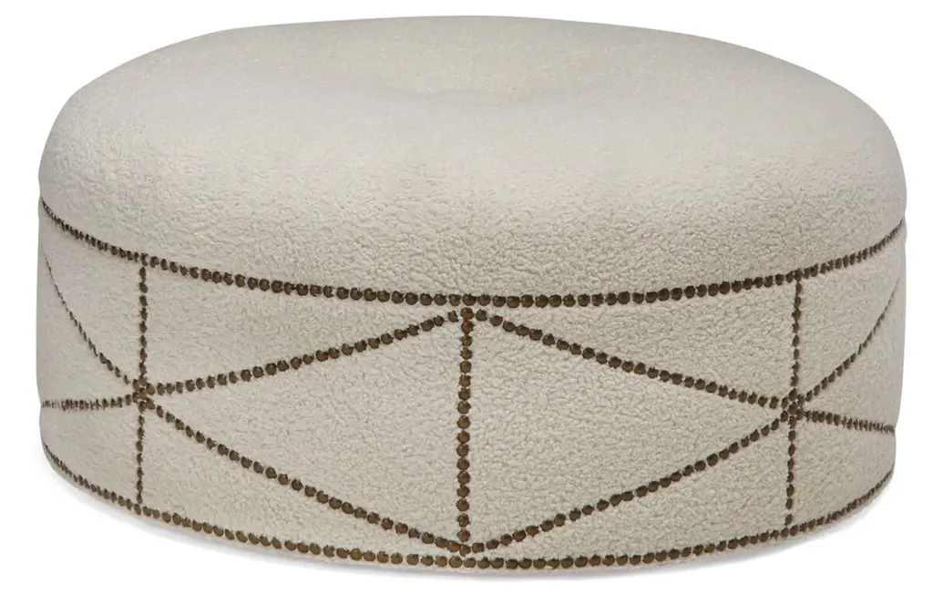 Diamond Ottoman shown in a Transitional Silver finish and 3041 fabric. Seat Height: 20"H, Inside Seat: 22"W X 22"D This upholstered ottoman features a wood plinth base finished in transitional silver. It is upholstered in a textured fabric in ivory that features stain protection, and it is accented with mother-of pearl buttons and nickel nailheads.
