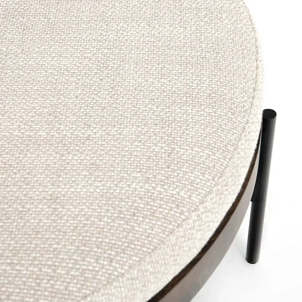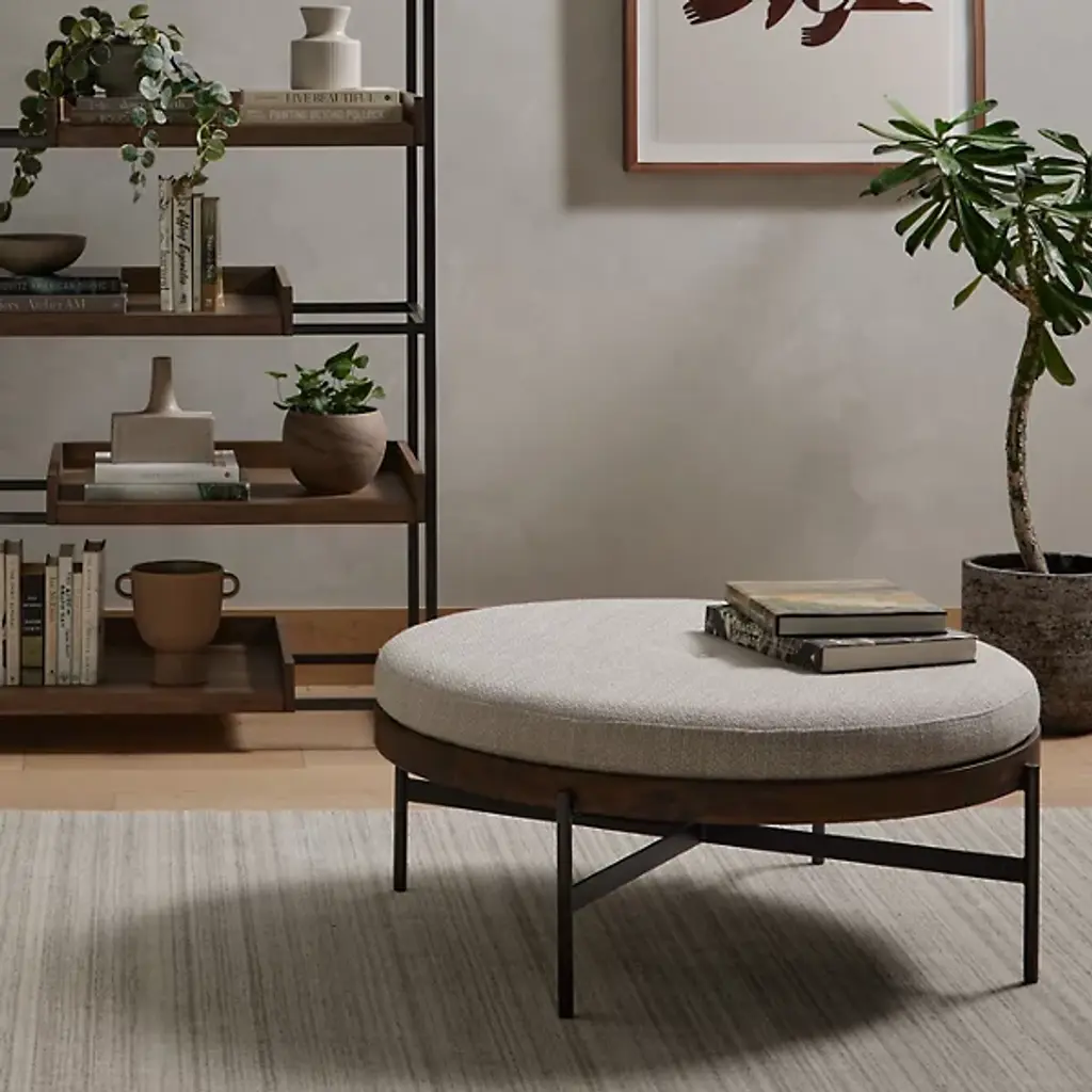 The Edwyn Large Ottoman from Four Hands offers multiple uses for your living area. Its base, made of gunmetal-finished iron, supports a rounded beech wood frame. The wheat-colored upholstery, a polyester and acrylic mix, provides an interesting surface texture. This ottoman works well as extra seating or as a surface for a tray. Its adaptable nature makes it a useful addition to any room setup.
