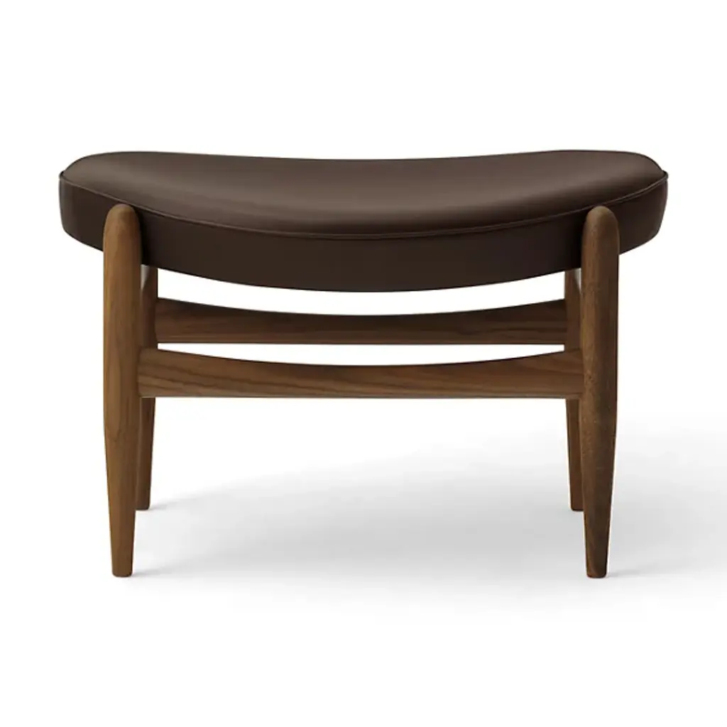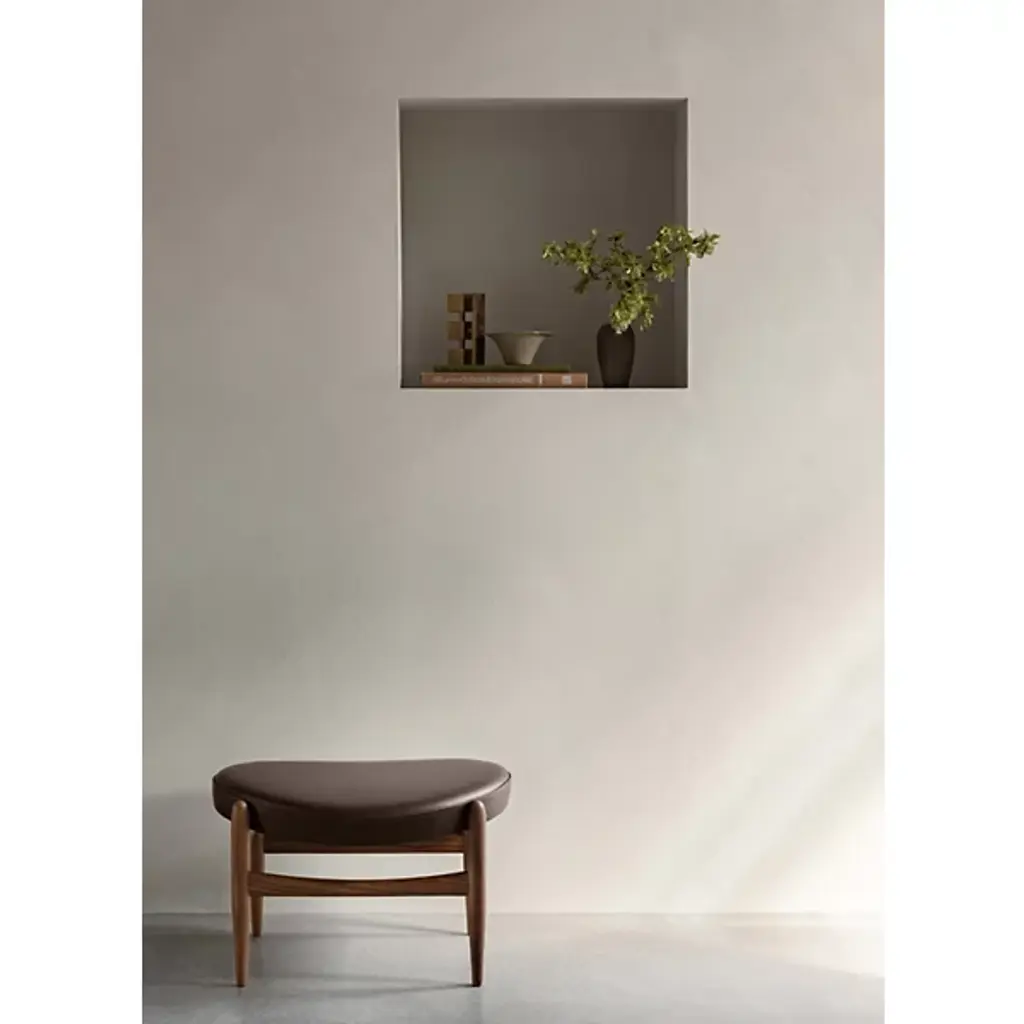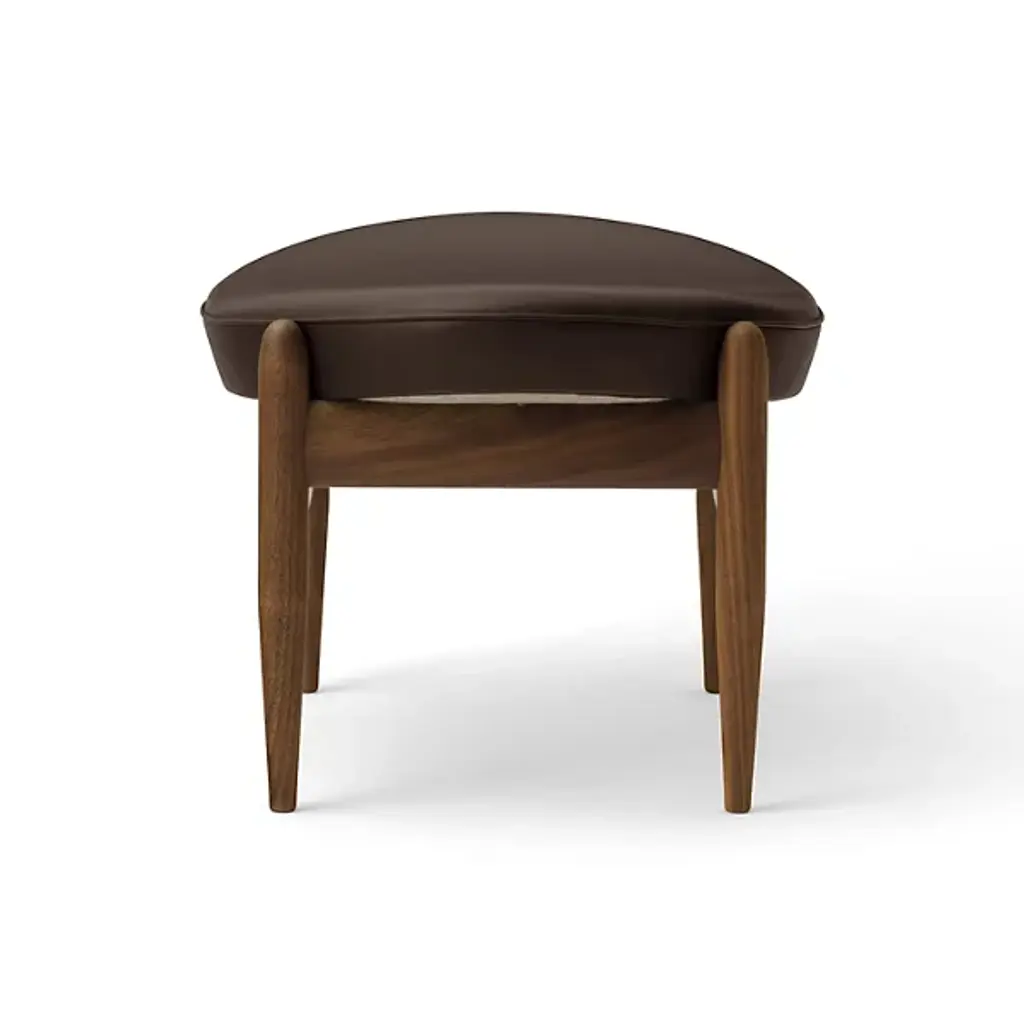 Comfort and sophistication achieve an ideal balance in the Elizabeth Ottoman from Audo Copenhagen, formerly known as Menu, A refined piece carrying the name of the iconic Queen after she purchased the accompanying chairs on her visit to Copenhagen in 1962. Storied Danish designer Ib Kofod-Larsen’s pieces express his appreciation for detail and proportion, while the fluid curves move the eyes around this ottoman’s smooth wood base to create an eloquent refinement. The rich color and the grain of the wood base add to the character of the piece, while a leather cushion set atop arcs slightly inward and can act as an impromptu seat or a supportive footrest as needed.