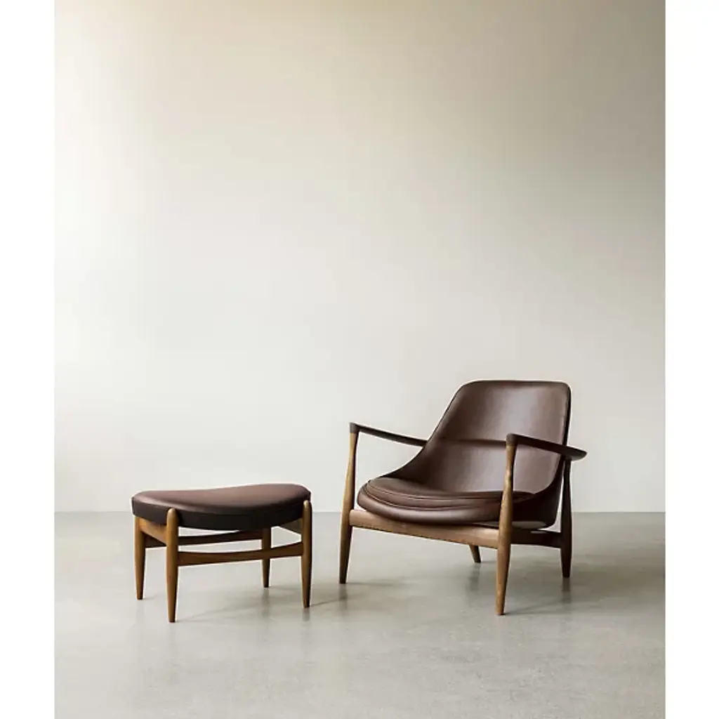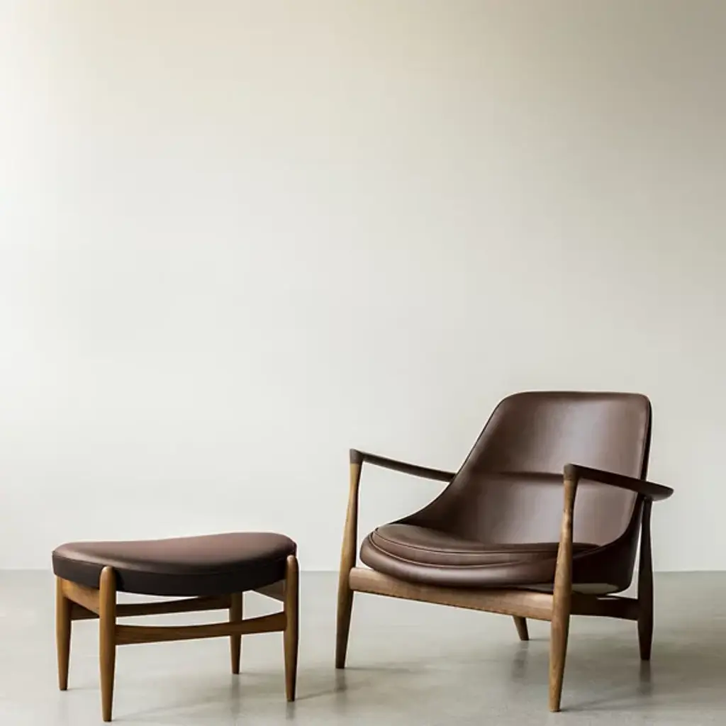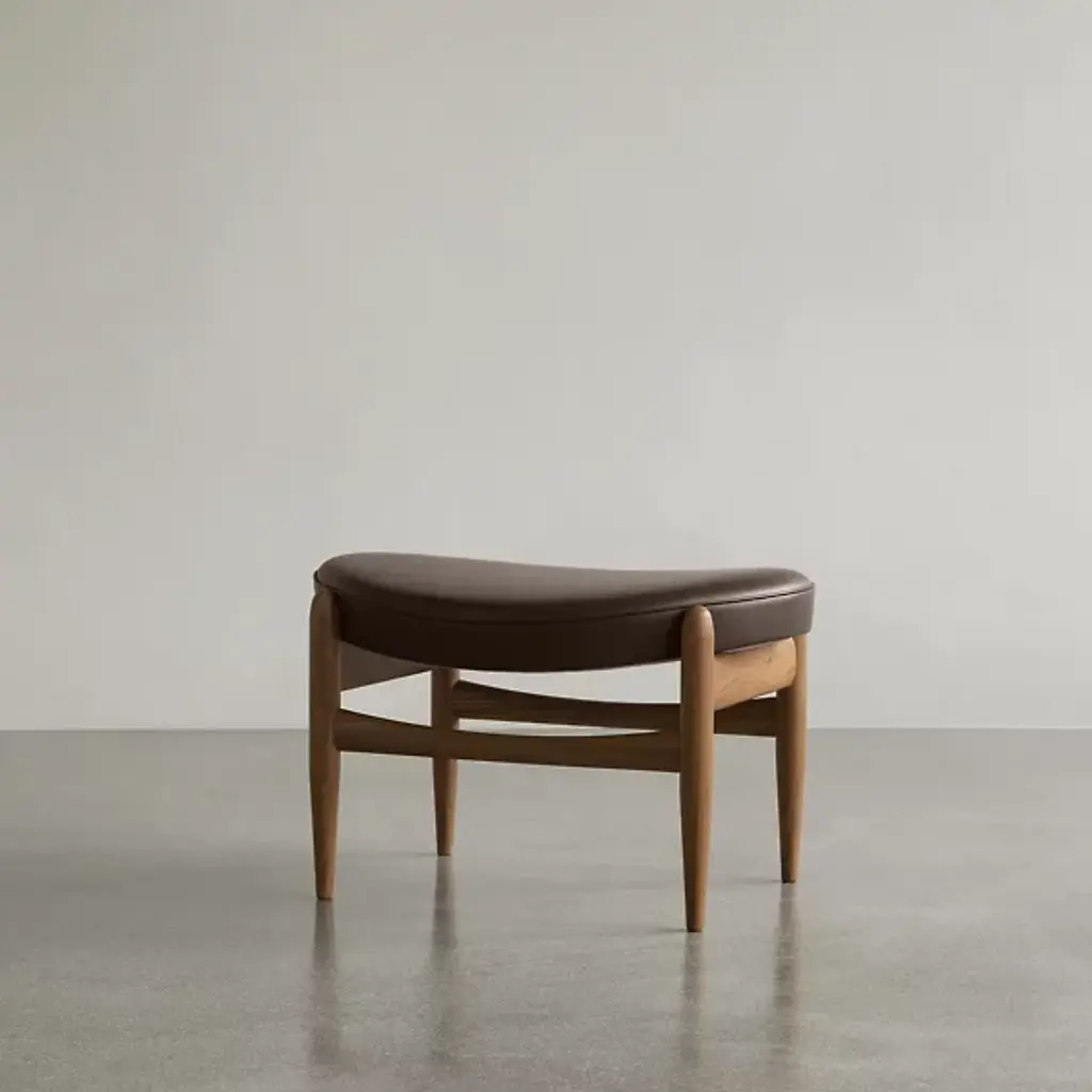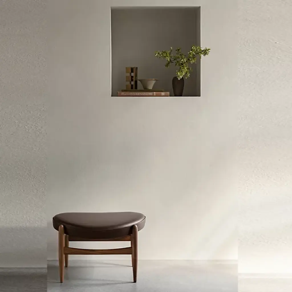 Comfort and sophistication achieve an ideal balance in the Elizabeth Ottoman from Audo Copenhagen, formerly known as Menu, A refined piece carrying the name of the iconic Queen after she purchased the accompanying chairs on her visit to Copenhagen in 1962. Storied Danish designer Ib Kofod-Larsen’s pieces express his appreciation for detail and proportion, while the fluid curves move the eyes around this ottoman’s smooth wood base to create an eloquent refinement. The rich color and the grain of the wood base add to the character of the piece, while a leather cushion set atop arcs slightly inward and can act as an impromptu seat or a supportive footrest as needed.