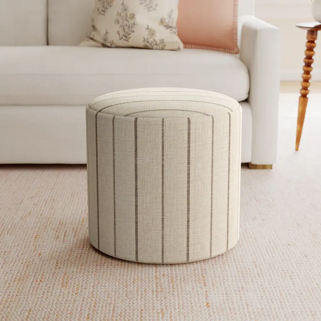 This round ottoman has a clean-lined design that's as stylish as it is functional. The frame is made from solid pine wood and upholstered in a luxurious blend of cotton and linen. Thoughtfully designed French seams add a tailored touch, while the boucle fabric adds a textured touch we love. Inside, foam and fiber fill to round out the design with a cozy touch. Ideal as a footrest, coffee, or end table stand-in, or even as an extra seat, this ottoman just may be the most versatile piece you own.