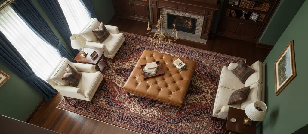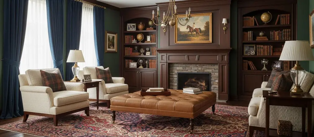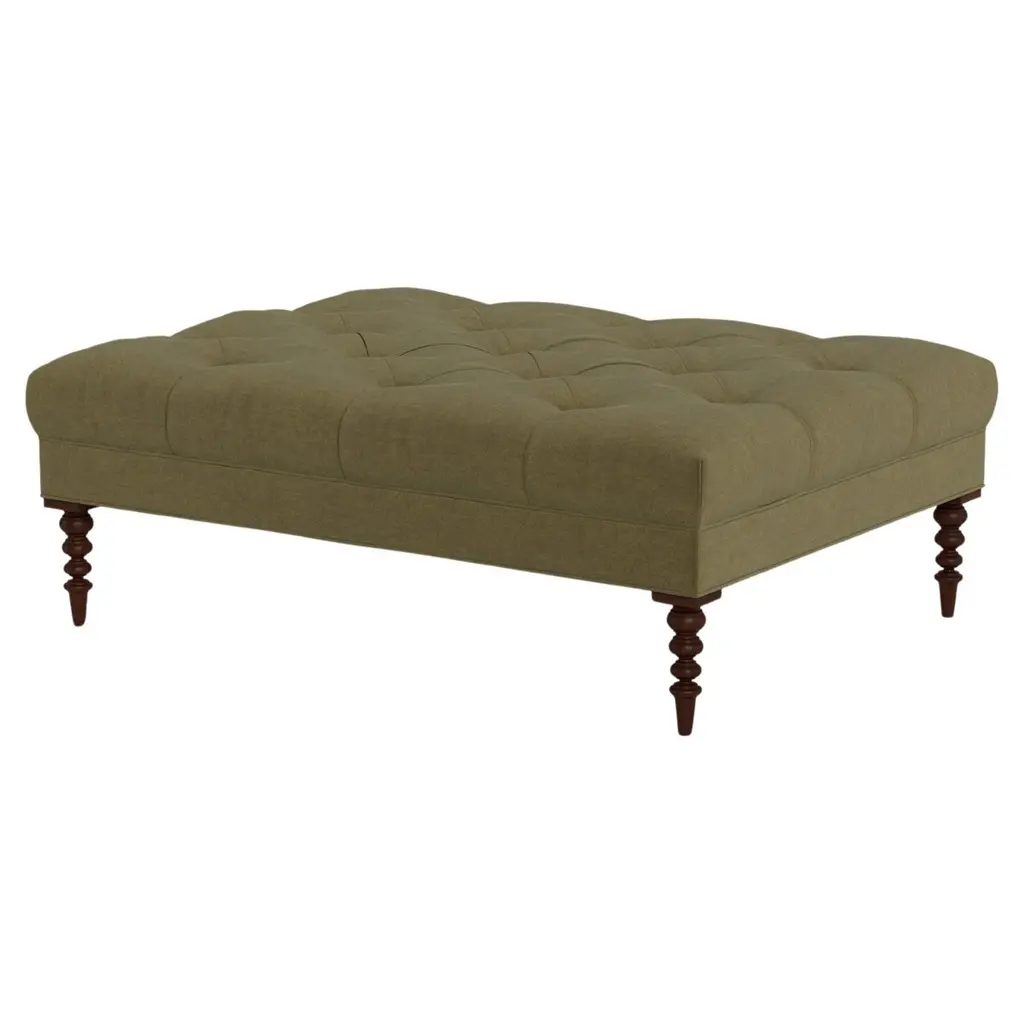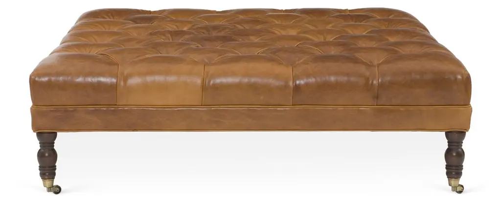 With its button-tufted leather upholstery and elegantly turned legs, this ottoman is an exemplar of elegance. It can serve as a coffee table when topped with a tray and also works well as extra seating. Brass casters allow for easy mobility. Handcrafted in the USA.