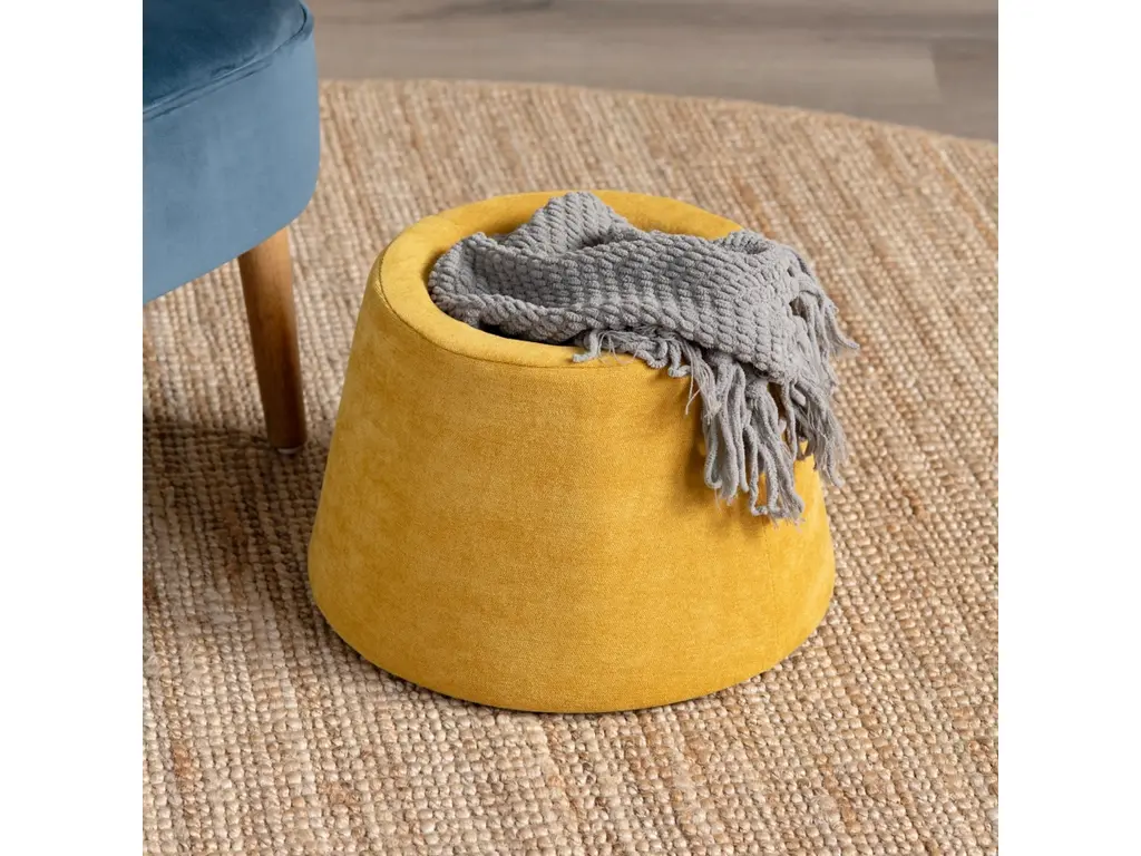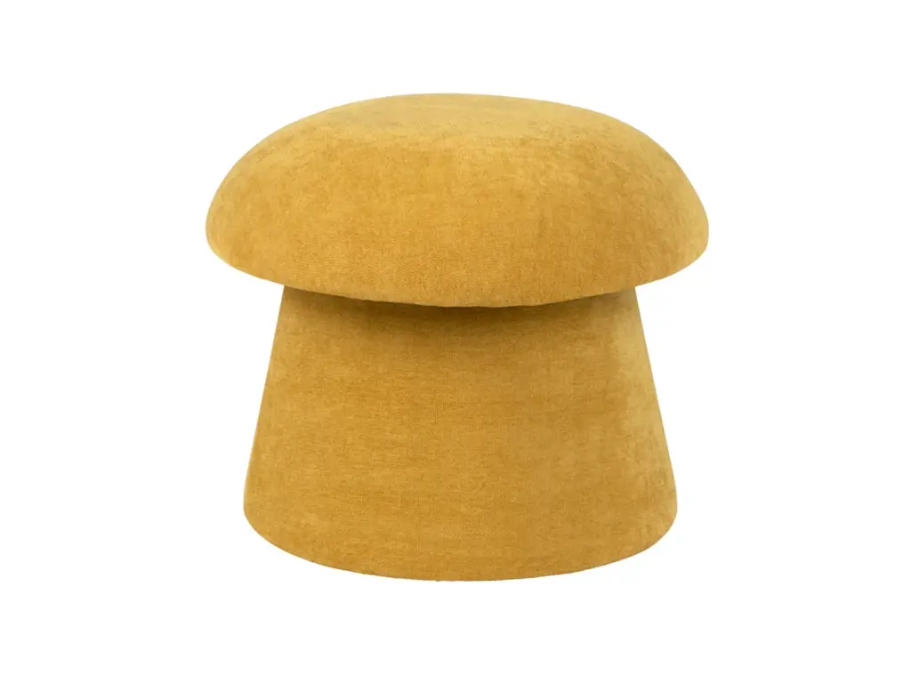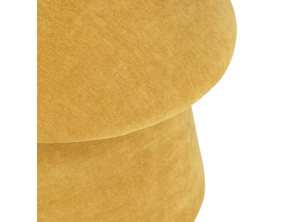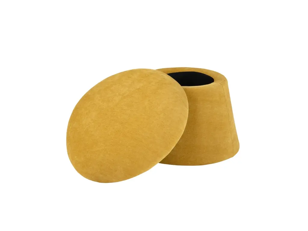 Add a bold and functional accent to your space with this Spice Yellow Chenille Ottoman. Designed in a modern mushroom-inspired shape, this versatile piece serves as both a stylish accent and a hidden storage solution. Upholstered in soft chenille, it brings a cozy yet sophisticated touch to any room. The removable top lifts off to reveal a handy compartment for storing small essentials. With dimensions of 17.5 inches in width, 17.5 inches in length, and 15.25 inches in height, it's compact and practical. Internal storage measures 8.25 inches wide and 10 inches high.