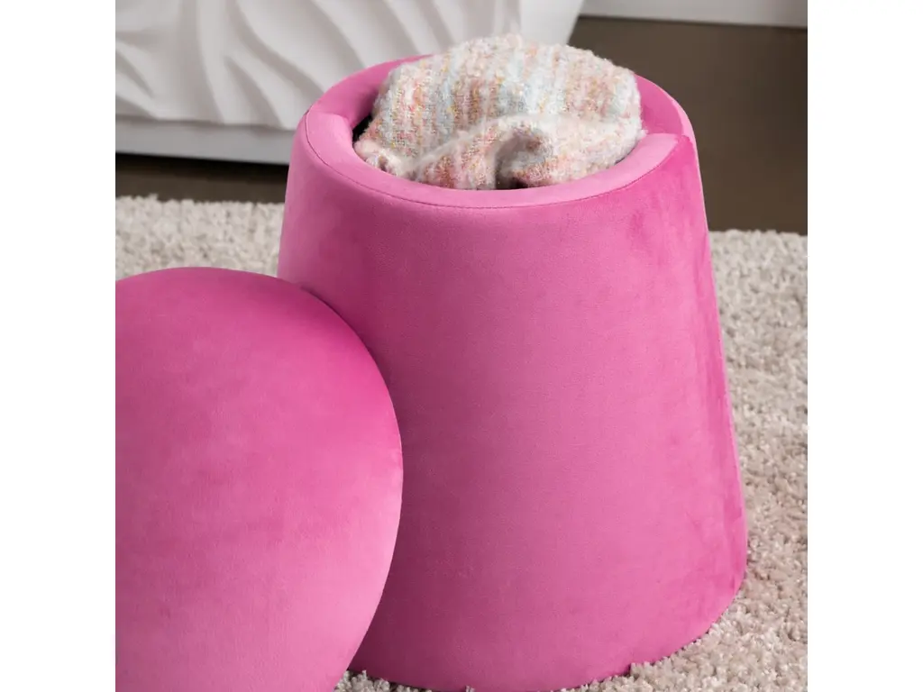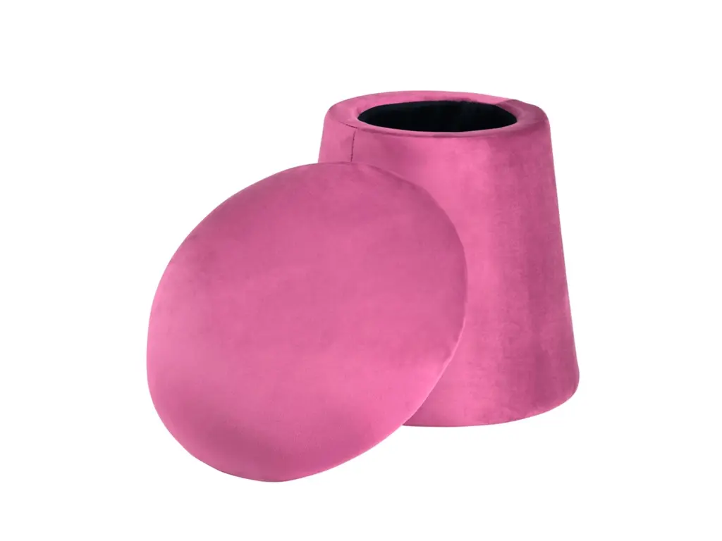 Elevate your living space with this Hot Pink Velvet Ottoman, a perfect blend of style and function. Designed in a modern mushroom-inspired shape, this upholstered piece doubles as a stylish accent and hidden storage. Wrapped in luxurious hot pink velvet, it adds a vibrant touch to any room. The removable top reveals a compartment ideal for keeping essentials out of sight. Measuring 17.5 inches in width and length, with a height of 20 inches, and internal dimensions of 8.25 inches wide and 14.5 inches high, it's both chic and practical.