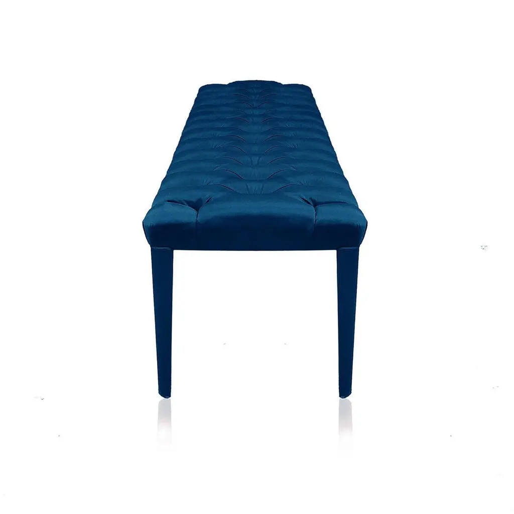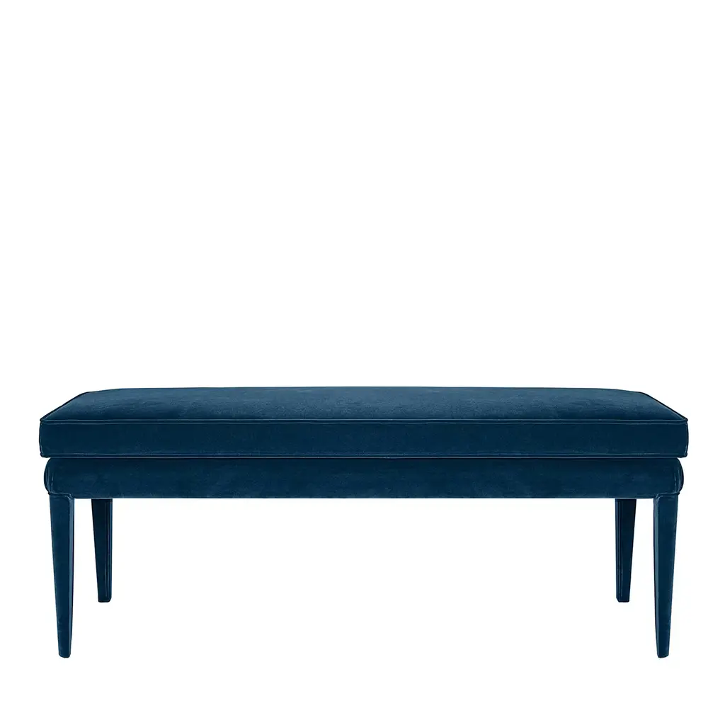 The Farfalla Ottoman Bench in Navy by Davide Barzaghi is firm, comfortable and exquisitely elegant. Fit for royalty, this ottoman bench features plush padding on top of a solid dried beech wood frame. Upholstered in a luxurious cotton satin, it is perfect for perching on at the end of a bed or simply for relaxing on.
