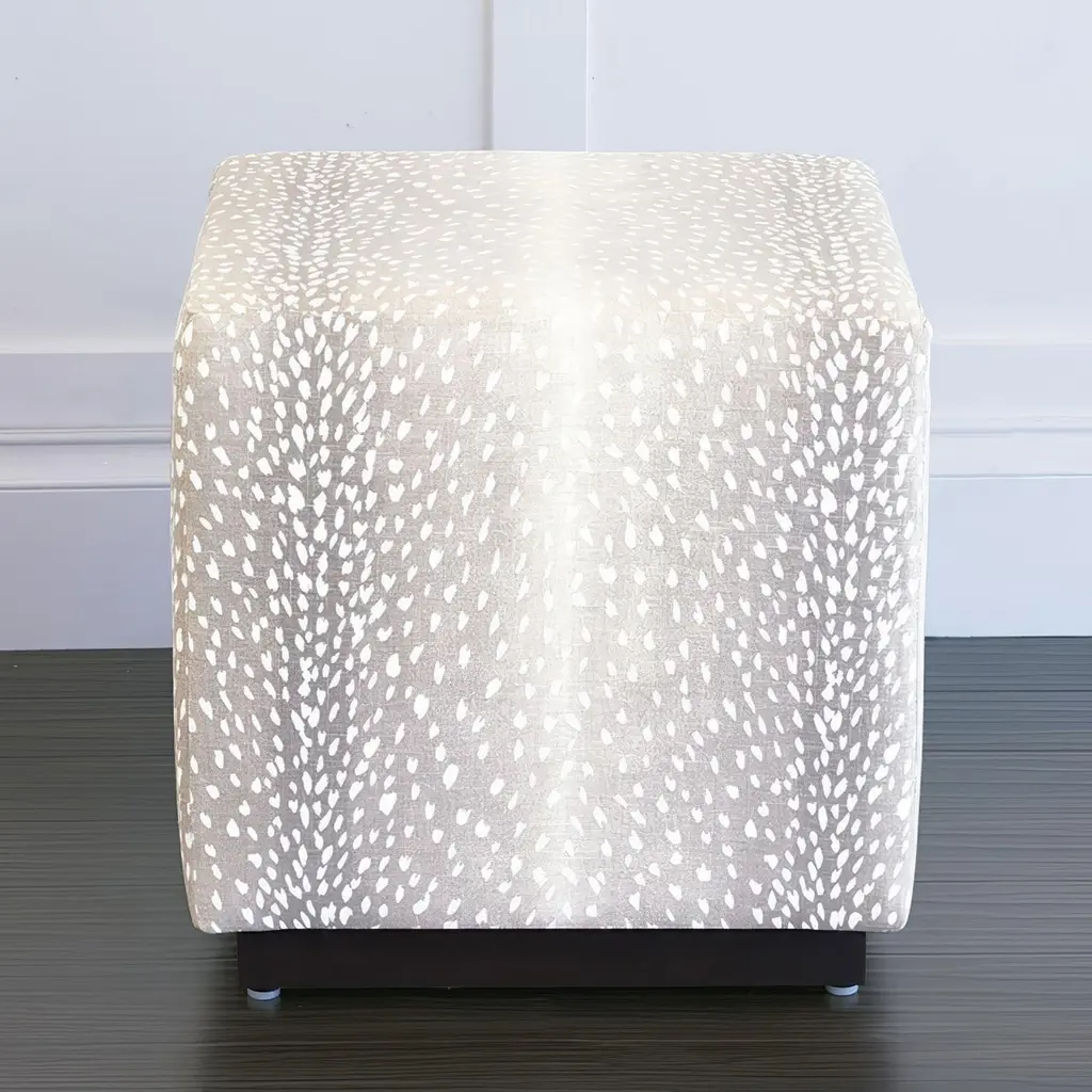 A striking blend of modern elegance and timeless comfort, the ottoman adds a sophisticated touch to any interior. Featuring an ombre gray animal-print upholstery, this chic ottoman is thickly padded and tightly upholstered for a tailored look.Its vanity-height design makes it an ideal accent piece for seating, footrest, or styling within a curated space. Crafted in the USA, it boasts a hand-stained solid wood base in a rich Espresso finish, lending durability and a refined contrast to its soft, patterned fabric. High-density foam ensures lasting support, while felt-padded glides protect floors from scratches.Dimensions: 19" W x 19" D x 19" HMade in the USA.Lead time is 6 weeks.