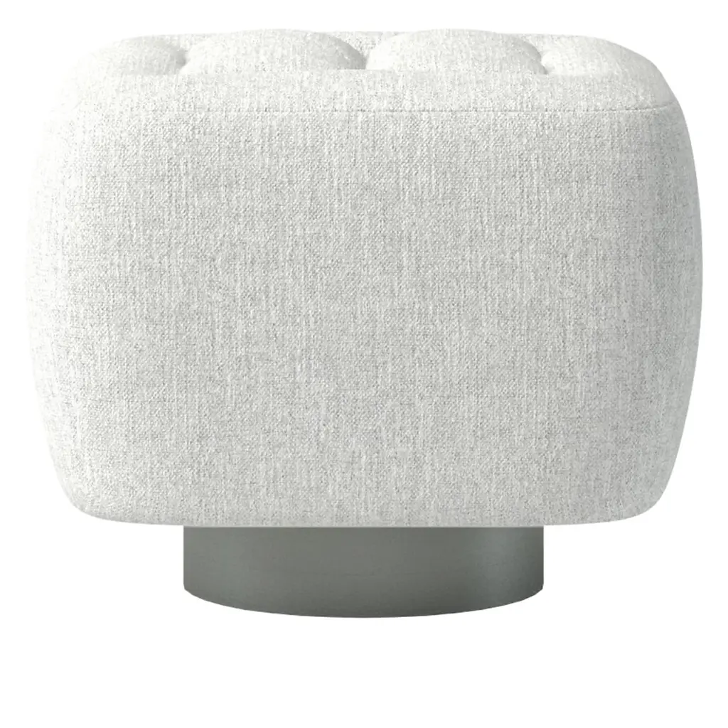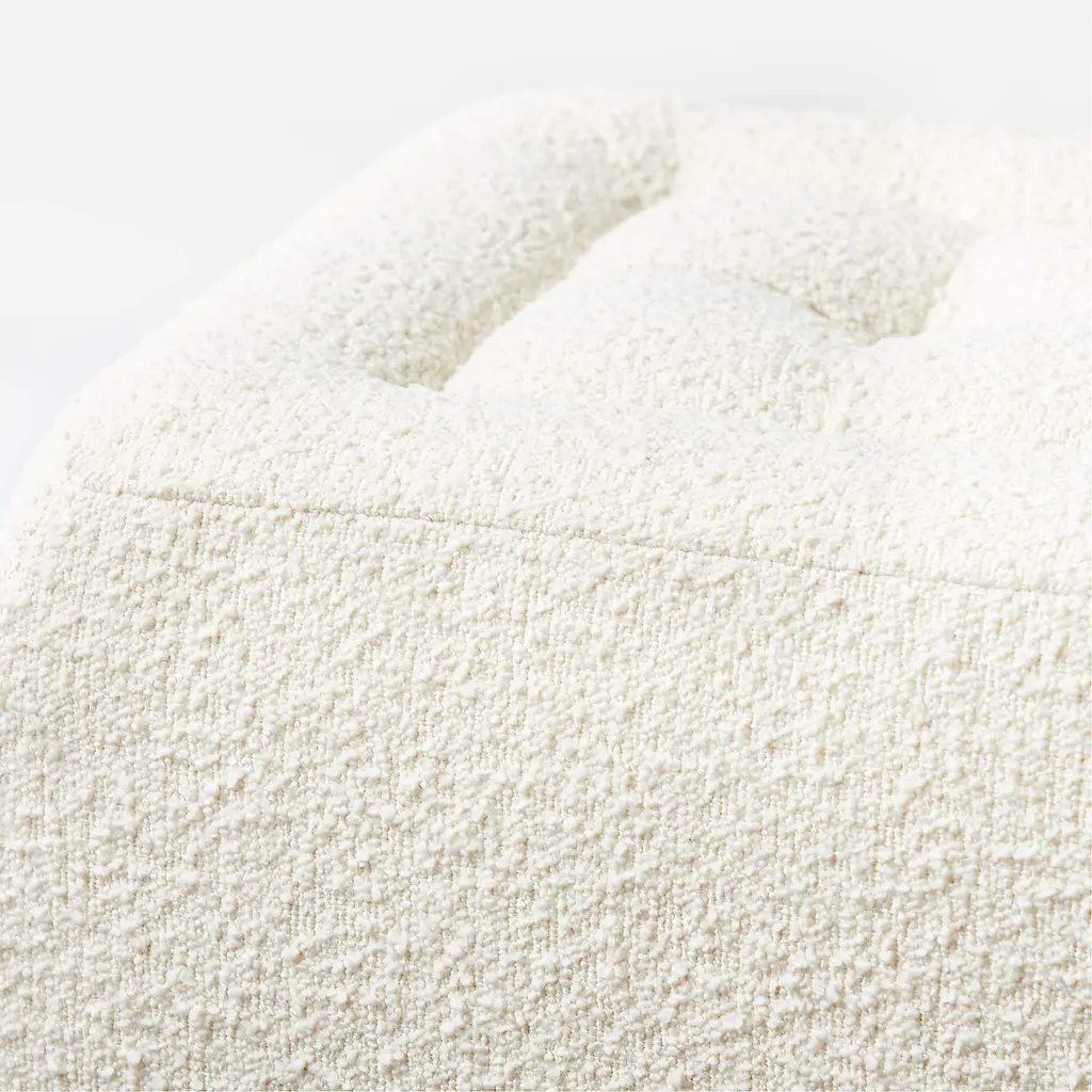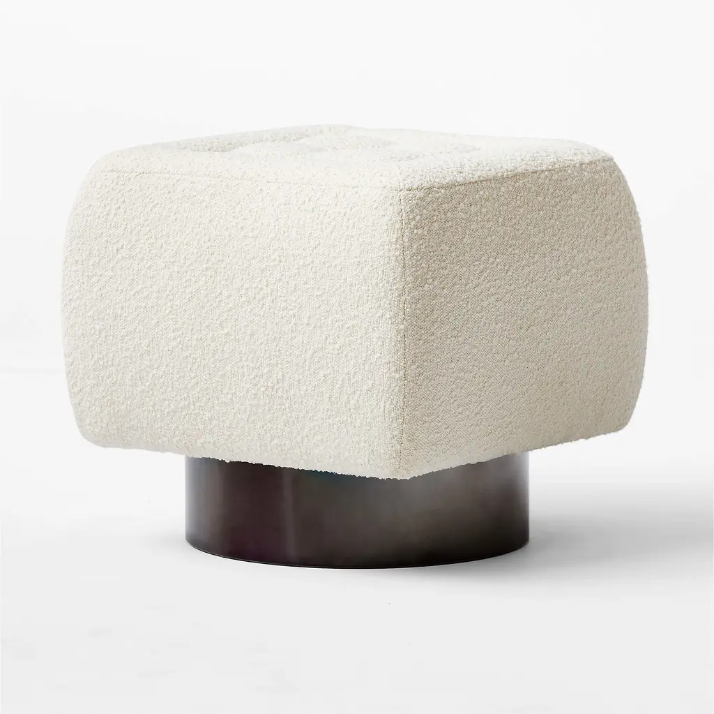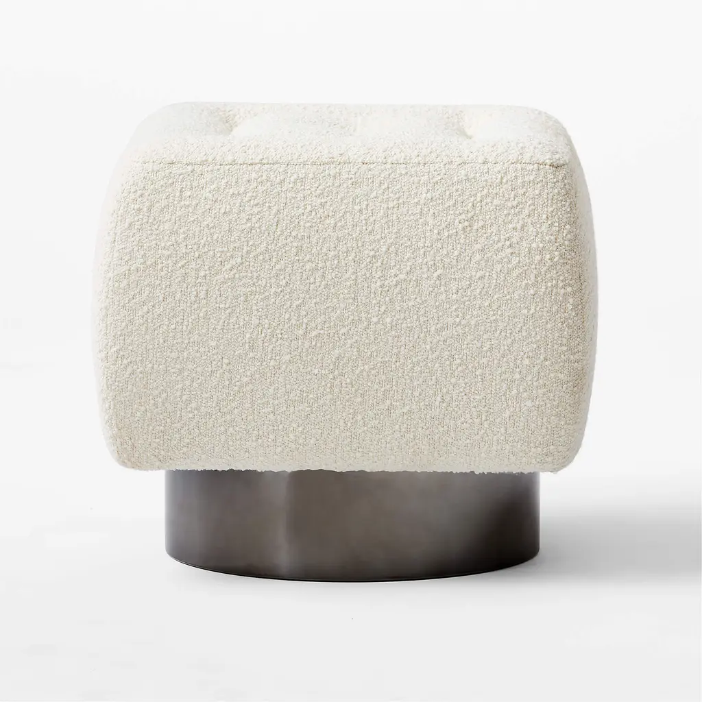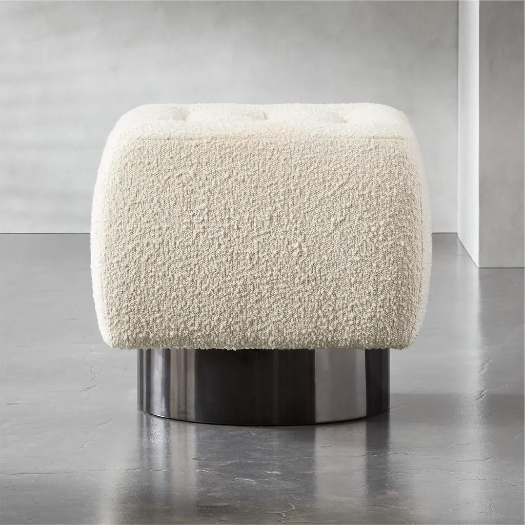 Featuring flat biscuit tufting, pillowed sides and an oversized bronze chrome base, this ivory boucle ottoman from Kravitz Design makes a statement in any room. CB2 exclusive.