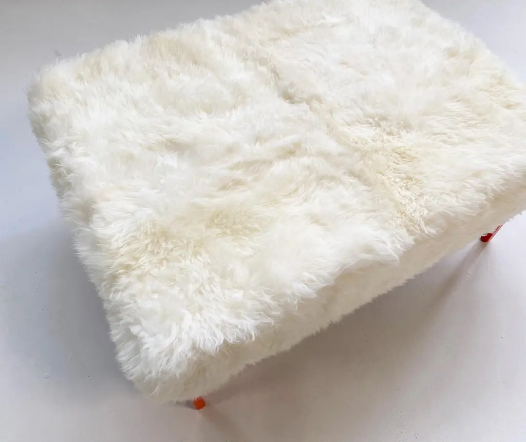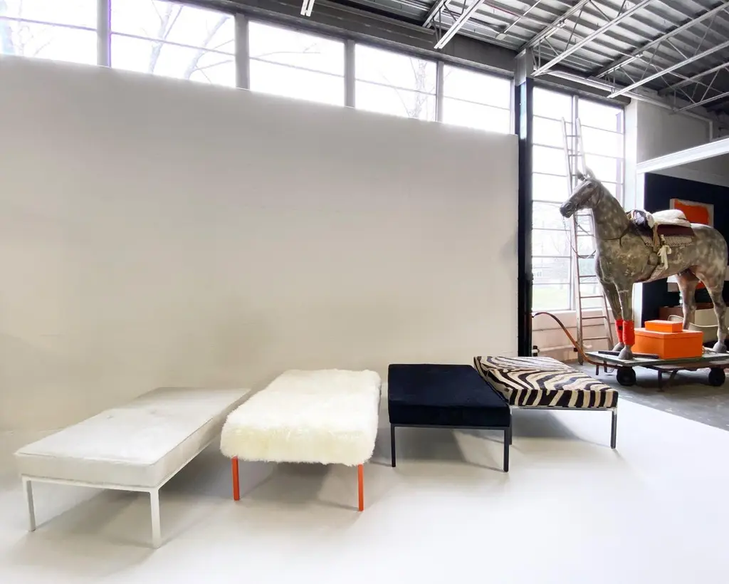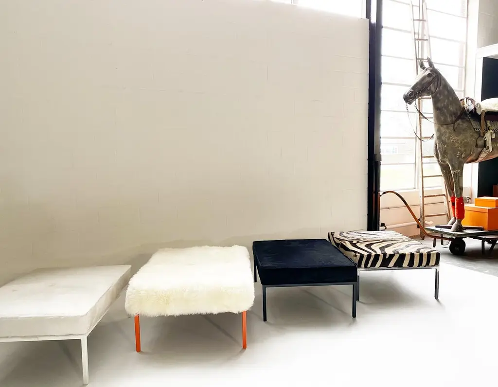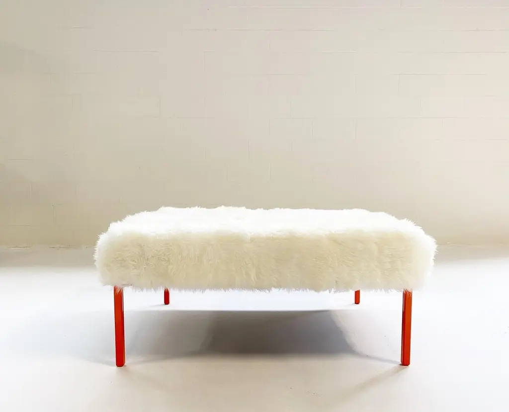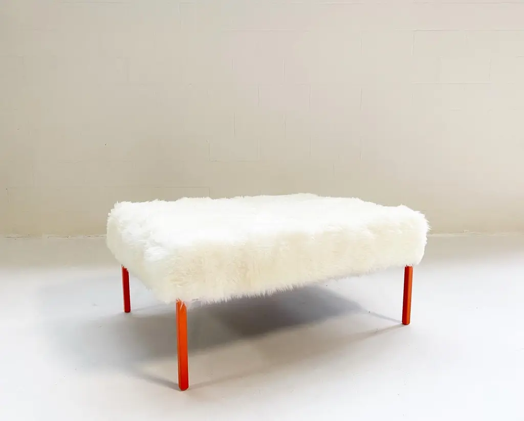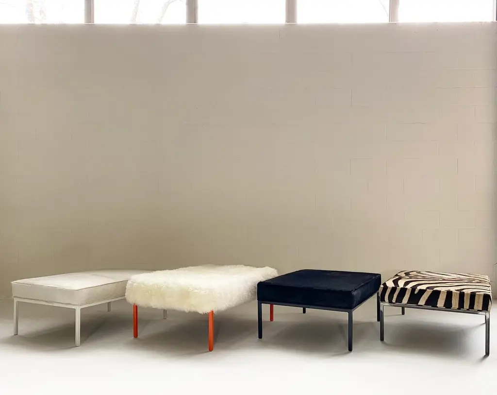 A new addition to our Originals collection. This bespoke ottoman is perfect for a variety of uses, ottoman, coffee table, bench at the end of a bed, etc. Handmade by our master welder and our dedicated upholstery team, the welded steel legs are the perfect base to any of our upholstery choices, cowhide, zebra hide, sheepskin, or fabric. This ottoman is infinitely customizable. We can powder coat the legs to black, white, or keep the natural, unfinished steel (as seen in the zebra example) and the fabric or hide upholstery choices are endless.Lead time: Please allow 11-12 weeks.